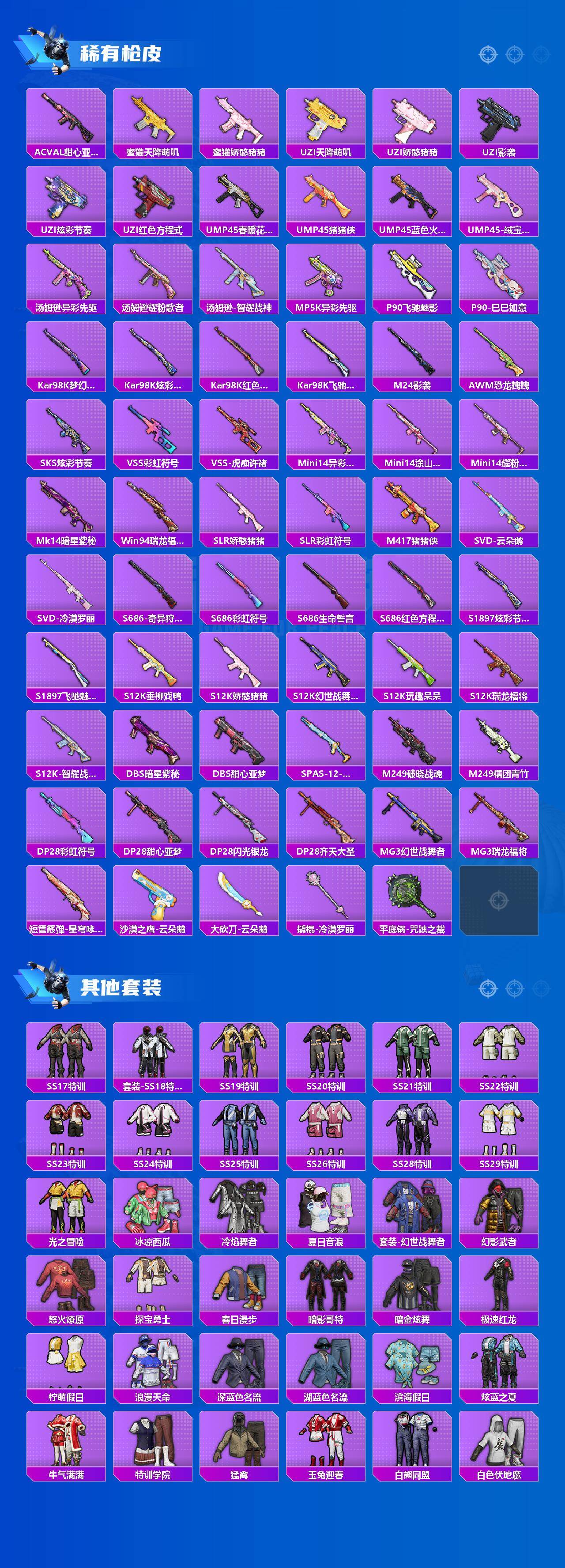 【稀有枪皮】:AKM-奇异狩猎者,AKM-彩虹符号,AKM-影袭,AKM-生命誓言,AKM-破晓战魂,AKM-虎虎生威,AKM-霓虹街区,M16A4-幻世战舞者,M16A4-甜心亚梦,M16A4-红色方程式,M16A4-蓝色火焰,SCAR-L-炫彩节奏,SCAR-L-玉兔迎春,SCAR-L-红色方程式,SCAR-L-黄金龙骨,SCAR-L-冷漠罗丽,M416-夜灯,M416-暗星紫秘,M416-红色方程式,GROZA-异彩先驱,GROZA-影袭,AUG-天降萌叽,AUG-耀粉歌者,QBZ-彩虹符号,QBZ-飞驰魅影,M762-奇异狩猎者,M762-瑞龙福将,M762-云朵鹅,AC-VAL-天降萌叽,AC-VAL-彩虹甜喵,AC-VAL-甜心亚梦,蜜獾-天降萌叽,蜜獾-娇憨猪猪,UZI-天降萌叽,UZI-娇憨猪猪,UZI-影袭,UZI-炫彩节奏,UZI-红色方程式,