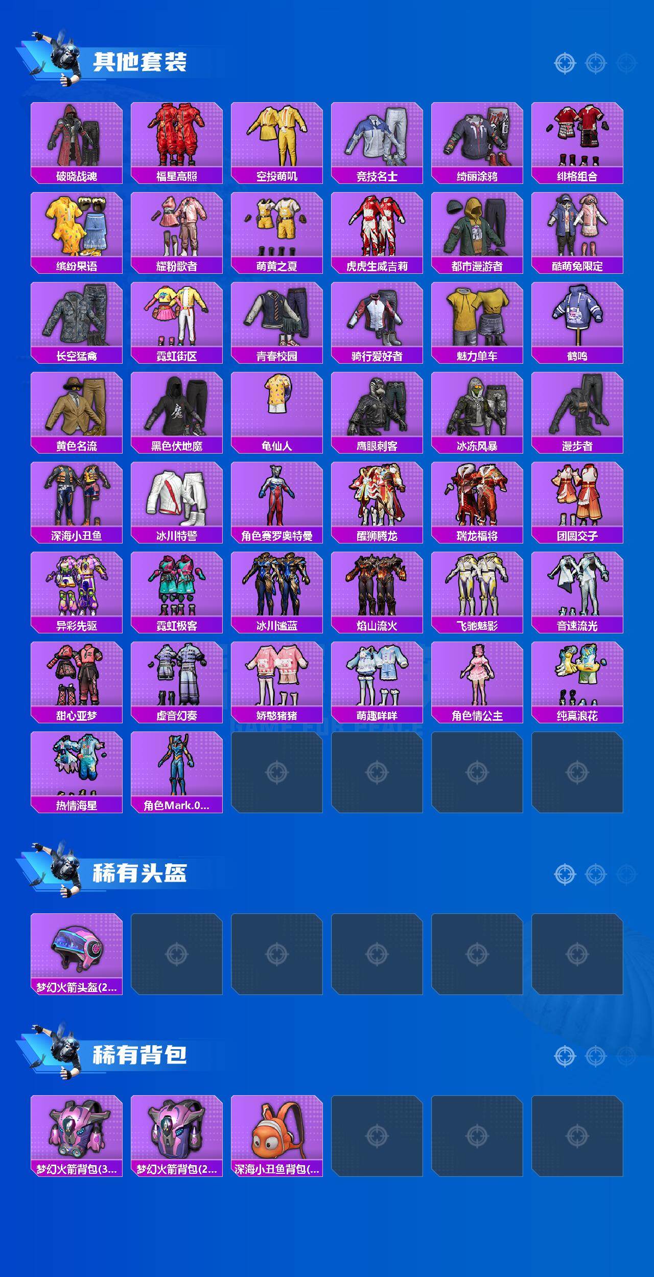 【稀有套装】:套装-龟仙人,套装-马上有钱,套装-雏菊兔兔,套装-萝兰蝴蝶,套装-小熊娃娃,套装-糖糖葫芦,套装-青团波波,套装-燕燕于飞,套装-鱼渊荷华,套装-粉恋花,套装-紫幽梦,套装-蓝冰羽,套装-彩虹兔,套装-云朵鹅,套装-雪绒豹,角色-时希公主,角色-灵公主,角色-乐音,角色-孙斩天