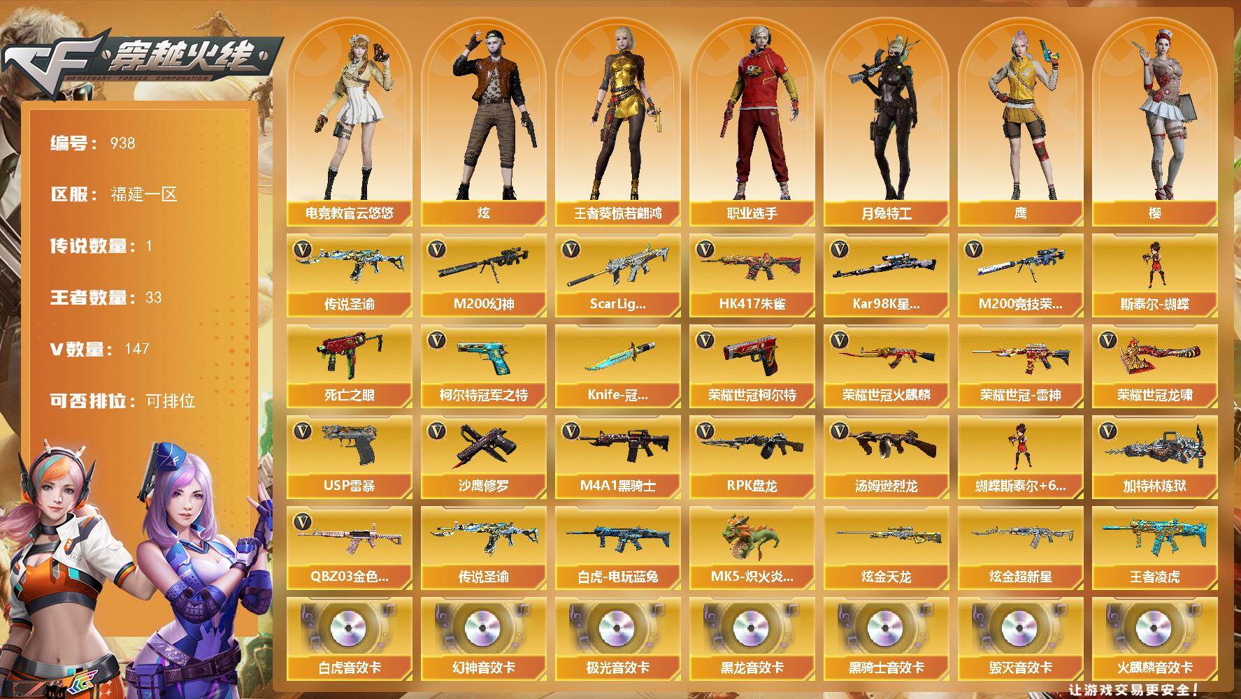 [16446301]福建一区-147V-33王者-2炫金 【传说武器】:传说圣谕 【传说角色】:传说星骇 【热门武器】:传说圣谕,QBZ03-金色蔷薇,Scar Light-白虎,HK417-朱雀,M200-幻神,M200-竞技荣光,死亡之眼,荣耀世冠-火麒麟,荣耀世冠-雷神,白虎-电玩蓝兔,柯尔特-冠军之特,荣耀世冠-柯尔特,Kar98K-星神,M4A1-黑骑士*5,汤姆逊-烈龙*6,RPK-盘龙*6,加特林-炼狱,斯泰尔-蝴蝶,MK5-炽火炎龙,USP-雷暴,沙鹰-修罗,Knife-冠军之刃,荣耀世冠-龙啸*3 【王者炫金武器】:王者凌虎,炫金超新星,炫金天龙 【音效卡】:AN94-超新星-热带奇洋音效卡,QBZ03-金色蔷薇-热带奇洋音效卡,M200-幻神音效卡,AK47-火麒麟音效卡,M4A1-雷神音效卡,M4A1-黑龙音效卡,M4A1-黑骑士音效卡,Barrett-毁灭音效卡,Barrett-极光音效卡,AWM-裁决音效卡,Scar Light-白虎音效卡,QBZ03-天罚音效卡,沙鹰-修罗-盛典舞曲音效卡*2,Barrett-碧霄极光音效卡,炼狱-百战金芒-庆典舞曲音效卡 【皮肤】:M200-幻神-黄忠皮肤,幻神-丹凤,幻神-青鹤,幻神-巅峰荣耀,幻神-星火小队签名臻藏版 皮肤,Scar Light-白虎-暗星,白虎-白鲨-CFPLS23冠军,QBZ03-冠军之薇,QBZ03-金色蔷薇-拼搏,裁决-羽掣 皮肤,裁决-叶芒苍灵 皮肤,星神-璀璨皮肤,Kar98K-星神-AG-CFPLS21冠军皮肤,Kar98K-星神-冠军之星皮肤,雷神-暗月,雷神-荣耀之魄,雷神-烈虎皮肤,M4A1-雷神-拼搏,M4A1-再燃火线,火麒麟-战神关羽,火麒麟-平天大圣,火麒麟-盘古,火麒麟-白虎,火麒麟-心动糖果,毁灭-荣耀之怒,毁灭耀金皮肤,毁灭-虹光风暴 皮肤,毁灭-秦师 皮肤,黑龙-能量核心,黑骑士-冠军之势,黑骑士-伏羲,死神-秘银,战神-紫绶金章皮肤*2,AK47-B-常胜将军-刘备,炼狱-月 皮肤,修罗-冠军之魂,屠龙-荣耀之锋,屠龙-春桃 皮肤,轻型军用手斧-再燃火线,擎天-冠军之击,麒麟刺-萌杀皮肤 【角色】:樱,炫,电竞教官-云悠悠,鹰,月兔特工,机械姬,华,荆棘,王者葵-惊若翩鸿,王者炫,王者潘多拉,奇洋探员,乔伊教练,修道士,暗夜-X,芳心审判者,飞虎队-X,嘉年华灵狐