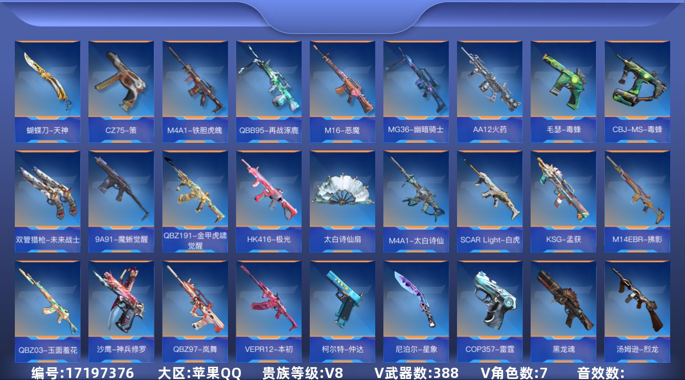 [17197376]10英雄角色数-378英雄武器数 【王者系列】:王者之影,王者之魄,王者之心,王者之神,王者之锋,王者之迹,王者之蝶,王者之兽,王者之狱,王者之魂,王者幻神,王者之烈*2,王者之霆,王者之业,王者之誉,M4A1-雷霆王者,巴雷特-雷霆王者,M12S-雷霆王者,王者之尊 【热门武器】:KSG-孟获,CZS2-仲康,COP 357-安琪拉*2,AN94-盖,81式-光明之神,MK47-仁德,M4A1-七色宝葫,AK47-孟德,M4A1-仲达,AK47-奉先,M4A1-星象,M4A1-游骑兵,TAC-慈,VEPR12-本初,黑龙魂,81式-阿波罗,COP 357-雷霆*2 【角色】:葵,幽灵刀锋-觉醒,关小雨*2,晴雅,月神-X,甄梦,步练师*2 【英雄武器】:AK47-无影,AK47-火麒麟,AK47-机械迷城,AK47-孟德,AK47-猩红传说,AK47-燎天净火,AK47-奉先,AK47-黑鲨,AK47-木兰,AK47-谜城烟火*2,M4A1-雷神*2,M4A1-黑骑士*2,M4A1-死神,M4A1-游骑兵,M4A1-星象,M4A1-仲达,M4A1-竞界荣光,M4A1-七色宝葫,M4A1-机械迷城,M4A1-赛博雷神,M4A1-海骑士,M4A1-运输船*3,M4A1-猎神,M4A1-雷暴,M4A1-雷霆王者,M4A1-太白诗仙,M4A1-铁胆虎魄,SCAR-幽暗骑士*2,SCAR-幽暗骑士觉醒,SCAR Light-白虎,SCAR-探星者,SCAR-心动PICK,AN94-卷帘大将军,AN94-四凶觉醒,AN94-精卫填海,AN94-盖,AUG-机械纪元,FAMAS-湮灭,9A91-游骑兵,9A91-魔蜥觉醒,M14EBR-暗夜觉醒,M14EBR-天神,M14EBR-拂影,M14EBR-玄武,M14EBR-葫芦山庄,M16-恶魔,AK12-天启,QBZ03-金色蔷薇*2,QBZ03-死神,QBZ03-玉面羞花,HK416-极光,HK417-炎龙铠甲,81式-光明之神,QBZ19-天使*2,G36-李星云,MK47-云舞,MK47-仁德,G3A3-衍神兵*2,FN F2000-十绝阵觉醒,QBZ97-岚舞,QBZ97-浩瀚征途,QBZ191-金甲虎啸觉醒,QBZ191-封神榜,AWM-天龙,AWM-裁决,AWM-大湾溢彩,巴雷特-毁灭*6,巴雷特-极光*6,巴雷特-