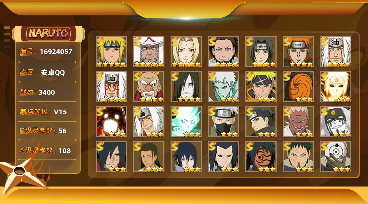[16924057]56S级忍者数-108A级忍者数 【S级忍者】:长门「秽土转生」(3星),三代目风影「秽土转生」(3星),半藏「秽土转生」(3星),金角·银角「秽土转生」(3星),猿飞日斩「秽土转生」(3星),波风水门「秽土转生」(3星),千手扉间「秽土转生」(3星),千手柱间「秽土转生」(3星),宇智波鼬「秽土转生」(3星),宇智波斑「秽土转生」(3星),宇智波斑「秽土转生·解」(3星),大野木「忍界大战」(3星),春野樱「忍界大战」(3星),宇智波带土「忍界大战」(3星),艾「忍界大战」(3星),宇智波鼬「须佐能乎」(4星),宇智波止水「须佐能乎」(3星),旗木卡卡西「须佐能乎」(3星),宇智波斑「木叶创立」(3星),千手柱间「木叶创立」(3星),无「二代目土影」(3星),艾「四代目雷影」(3星),罗砂「四代目风影」(3星),鬼灯幻月「二代目水影」(3星),大野木「三代目土影」(4星),艾「三代目雷影」(3星),烈斗「初代目风影」(4星),自来也(4星),自来也「仙人模式」(4星),自来也「舞之豪杰」(3星),大蛇丸(4星),自来也「传说中的三忍」(3星),纲手(5星),纲手「百豪」(3星),千手柱间(3星),千手扉间(3星),猿飞日斩(5星),宇智波斑(3星),波风水门(5星),药师兜「仙人模式」(3星),神秘面具男(3星),神秘面具男「红夜之刃」(3星),漩涡鸣人「九喇嘛连结」(3星),迈特凯「死门」(3星),佩恩「天道」(4星),佩恩·天道「超」(3星),宇智波佐助「永恒万花筒」(3星),宇智波斑 「白面具」(3星宇智波斑「白面具」),大筒木金式(3星),大筒木桃式(3星),大筒木舍人「最终章」(3星),漩涡鸣人「暴怒·第六尾」(3星),波风水门「九喇嘛连结」(3星),宇智波斑「五影会谈」(3星),漩涡鸣人·宇智波佐助(3星),宇智波带土「十尾人柱力」(3星) 【A级忍者】:艾「青年」(3星),三船「青年」(2星),三船(2星),长门「青年」(3星),波风水门「青年」(3星),波风水门「新春限定」(2星),达鲁伊「博人传」(2星),达鲁伊(2星),迪达拉(3星),迪达拉「新春限定」(2星),迪达拉「秽土转生」(2星),大蛇丸「晓」(3星),大蛇丸「新春限定」(2星),奇拉比(2星),奇拉比「忍界大战」(2星),飞段(5星),飞段「死司凭血」(5星),飞段「晓创生」(2星