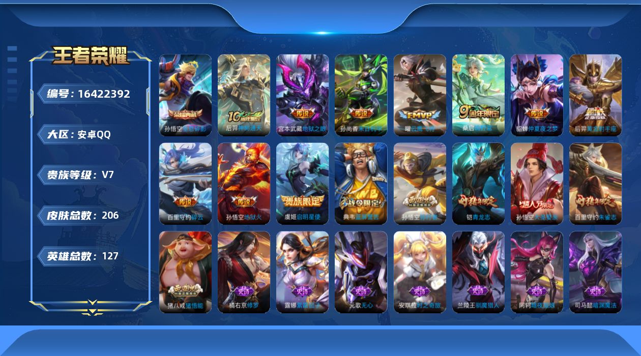 [16422392]安卓Q-V7-127英雄-206皮肤-1典藏皮肤-10传说-52史诗 【荣耀典藏】:孙悟空全息碎影 【传说皮肤】:后羿神树通天,桑启鸣野蒿,百里守约碎云,虞姬启明星使,曜云鹰飞将,后羿黄金射手座,貂蝉仲夏夜之梦,孙尚香末日机甲,宫本武藏地狱之眼,孙悟空地狱火 【限定皮肤】:蔡文姬夏日便利店,虞姬夏日便利店,姜子牙天穹之誓,狄仁杰阴阳师,赵云皇家上将,墨子神迹守卫,嬴政白昼王子,鲁班七号狮舞东方,庄周高山流水,高渐离玩趣恶龙,吕布猎兽之王,周瑜赤莲之焰,元歌无心,夏侯惇朔风刀,典韦穷奇,典韦蓝屏警告,狄仁杰魔术师,狄仁杰万华元夜,达摩沙漠行僧,项羽海滩派对,老夫子醍醐杖,老夫子航海奇遇记,程咬金演武夺筹,兰陵王驯魔猎人,兰陵王金庭之子,孙悟空大圣娶亲,孙悟空孙行者,牛魔御旌,后羿圣弓游侠,李元芳云中旅人,虞姬启明星使,钟馗神迹守卫,钟馗驱傩正仪,杨玉环遇见飞天,女娲朔望之晖,干将莫邪胡桃夹子,干将莫邪真爱魔法,蔡文姬繁星吟游,太乙真人饕餮,鬼谷子原初探秘者,鬼谷子五谷丰年,铠青龙志,苏烈千军破阵,百里守约朱雀志,弈星混沌棋,沈梦溪大漠名商,明世隐疑决卦,裴擒虎擒涛扼浪,狂铁御狮,米莱狄御霄,云中君纤云弄巧,盾山御銮,猪八戒猪悟能,上官婉儿梁祝,嫦娥拒霜思,鲁班大师探海日志,桑启海盐诗旅,张良古海寻踪,鬼谷子天穹祈灯,刘邦剑破天穹,周瑜熔金海岸 【年限皮肤】:百里守约朱雀志,铠青龙志 【赛季限定】:太乙真人饕餮,典韦穷奇,狂铁御狮,米莱狄御霄,牛魔御旌,盾山御銮,夏侯惇朔风刀,弈星混沌棋,明世隐疑决卦,老夫子醍醐杖,鬼谷子原初探秘者,狄仁杰万华元夜,程咬金演武夺筹,钟馗驱傩正仪,苏烈千军破阵,达摩沙漠行僧,兰陵王金庭之子,沈梦溪大漠名商,李元芳云中旅人,桑启海盐诗旅,裴擒虎擒涛扼浪,鲁班大师探海日志,张良古海寻踪,鬼谷子天穹祈灯,刘邦剑破天穹,姜子牙天穹之誓,太乙真人谧流熔炉 【战令限定】:嬴政白昼王子,吕布猎兽之王,典韦蓝屏警告,女娲朔望之晖,鲁班七号狮舞东方,钟馗神迹守卫,兰陵王驯魔猎人,周瑜赤莲之焰,老夫子航海奇遇记,墨子神迹守卫,干将莫邪真爱魔法,后羿圣弓游侠,蔡文姬夏日便利店,虞姬夏日便利店 【史诗皮肤】:露娜紫霞仙子,阿轲暗夜猫娘,赵云皇家上将,赵云未来纪元,狄仁杰魔术师,孙尚香水果甜心,嬴政摇滚巨星,妲己魅力维加斯,妲己女仆咖啡,墨子金属风暴,吕布圣诞狂