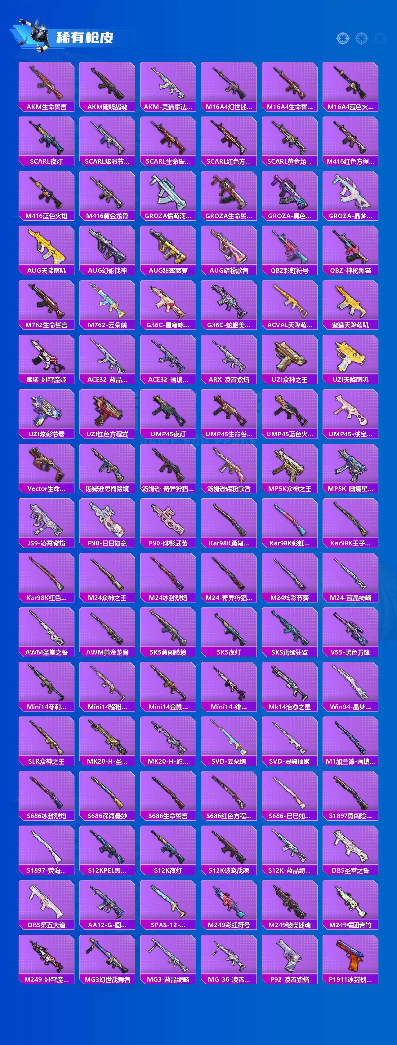 【稀有枪皮】:AKM-生命誓言,AKM-破晓战魂,AKM-灵猫魔法师,M16A4-幻世战舞者,M16A4-生命誓言,M16A