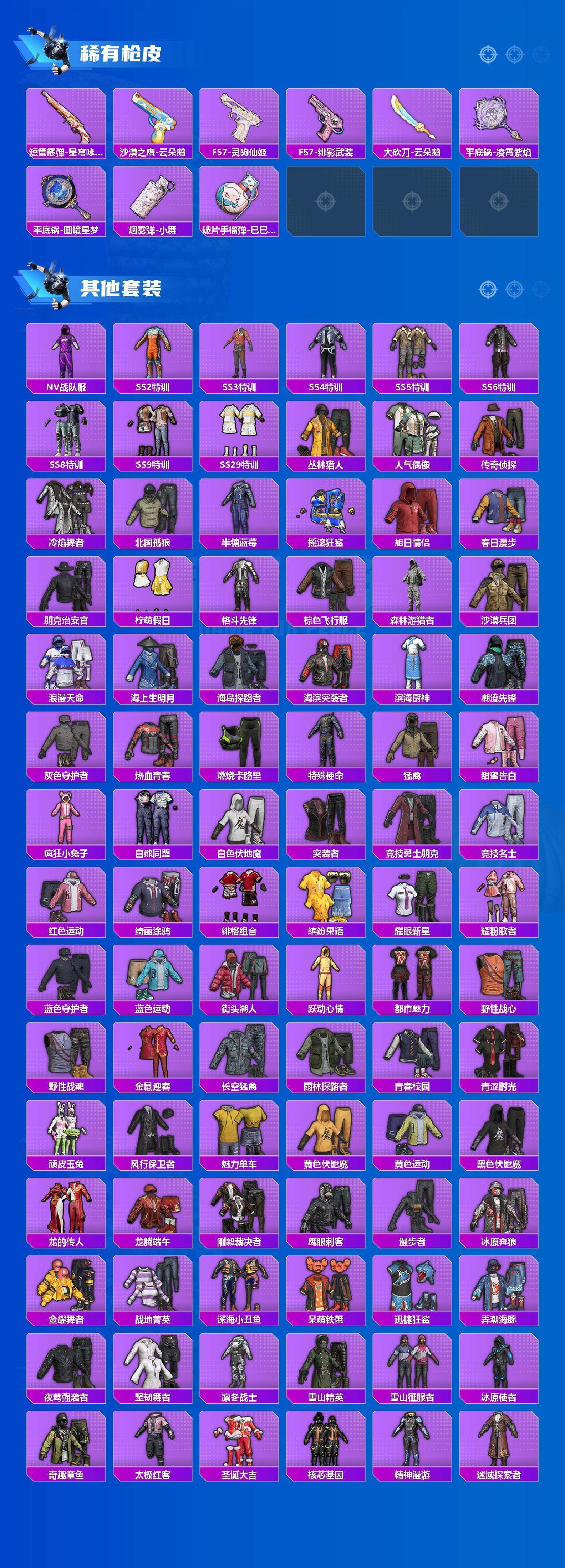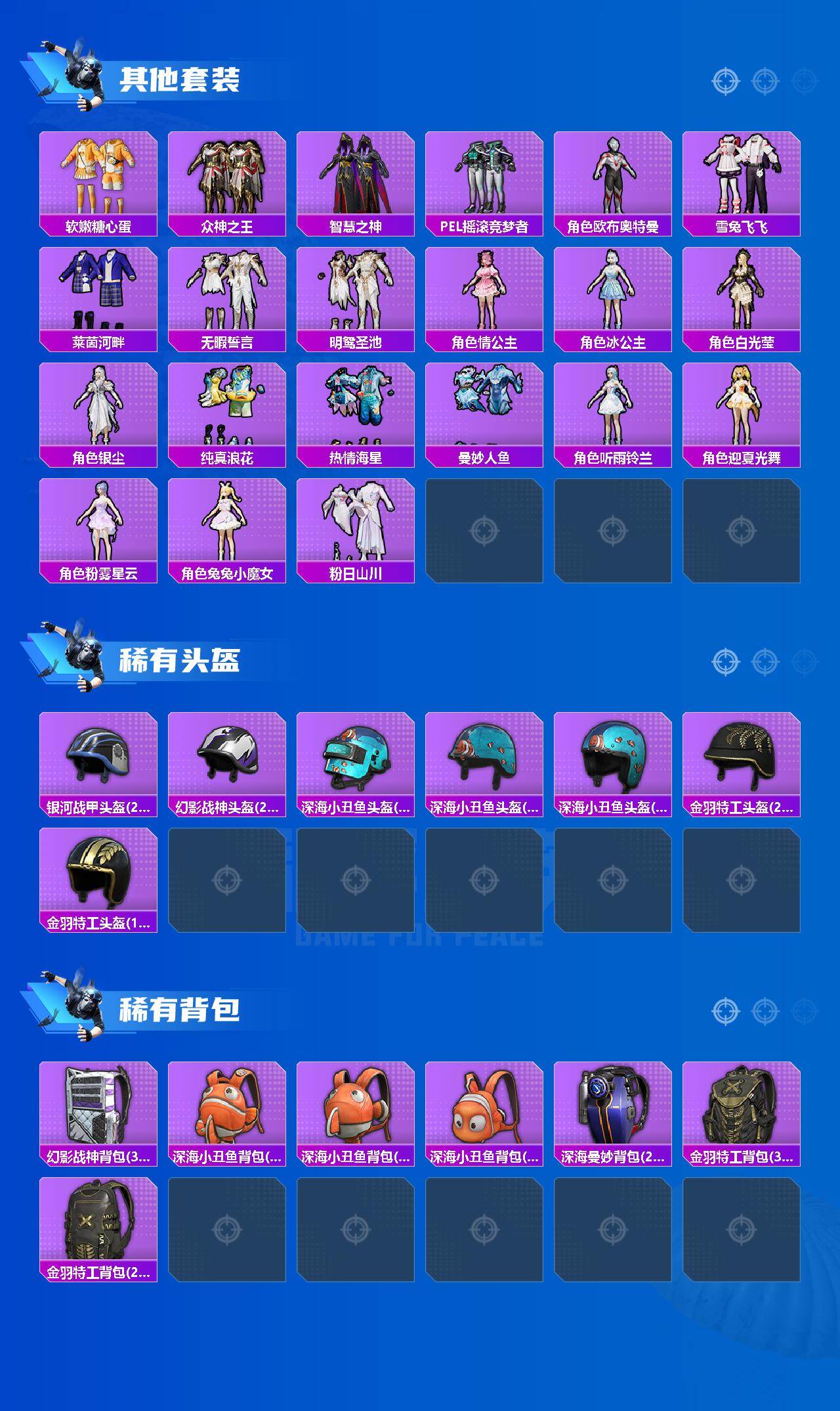 套装-深海小丑鱼,套装-深海曼妙,套装-幻影战神,套装-极致幻想,套装-俏雪含霜,套装-寒光使者,角色-圣堂之誓,角色-引力星,角色-鸢尾晶梦,套装-鹰眼刺客,套装-呆萌铁蟹,套装-迅捷狂鲨