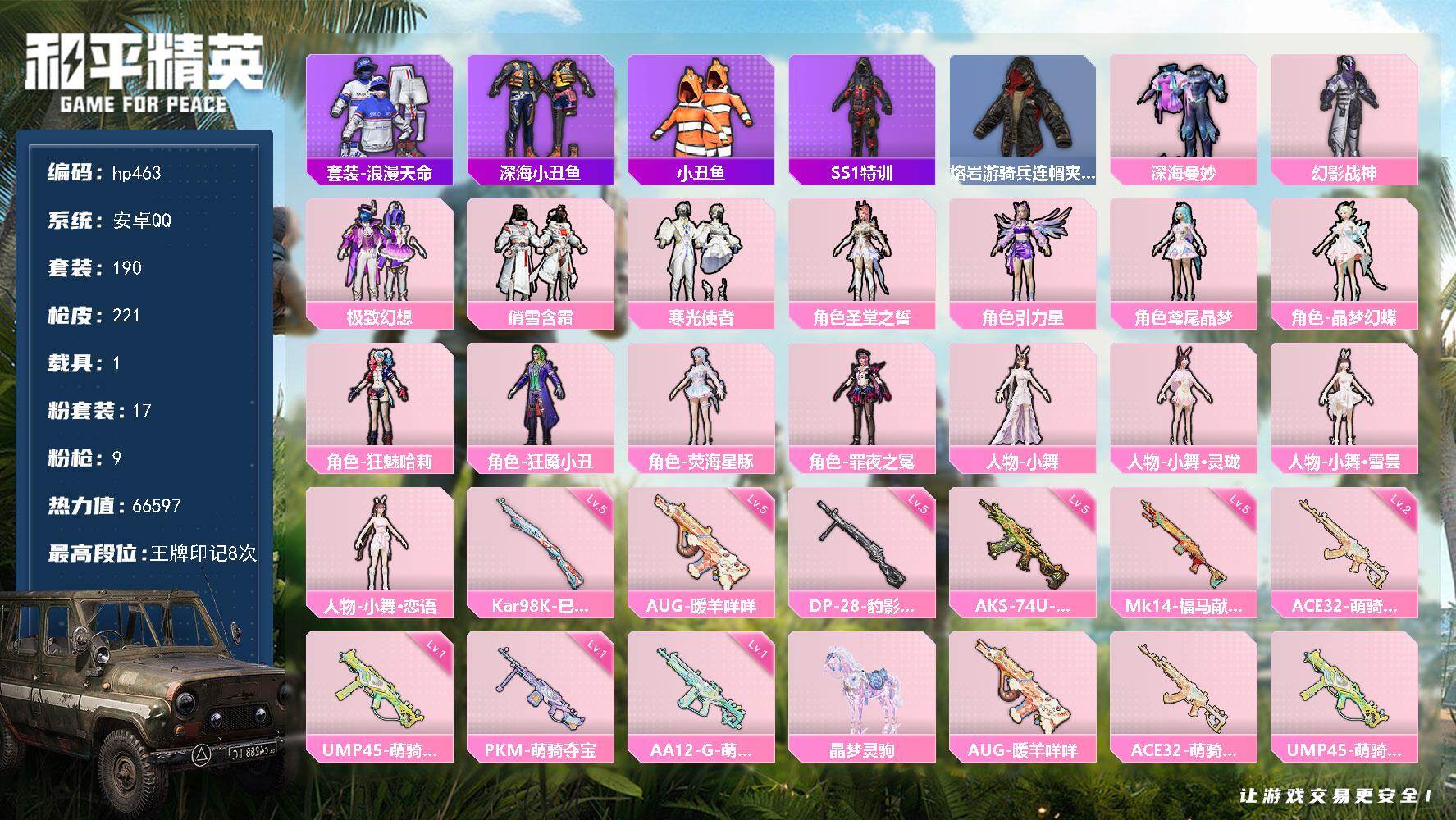 [17162128]安卓 手Q-17粉装-9特效枪-1载具-5粉色飞行器-66597热力值-8王牌印记-190套装-221枪皮 【热门品类】:套装-浪漫天命,套装-深海小丑鱼,套装-小丑鱼,套装-SS1特训,熔岩游骑兵连帽夹克 【粉色套装】:粉装-深海曼妙,粉装-幻影战神,粉装-极致幻想,粉装-俏雪含霜,粉装-寒光使者,角色-圣堂之誓,角色-引力星,角色-鸢尾晶梦,角色-晶梦幻蝶,角色-狂魅哈莉,角色-狂魇小丑,角色-荧海星豚,角色-罪夜之冕,人物-小舞,人物-小舞·灵珑,人物-小舞·雪昙,人物-小舞·恋语 【粉色枪皮等级】:AUG-暖羊咩咩(五级),ACE32-萌骑漫游(二级),UMP45-萌骑冒险(一级),AKS-74U-森灵之息(五级),Kar98K-巳巳如意(五级),Mk14-福马献瑞(五级),AA12-G-萌骑幻想(一级),DP-28-豹影疾电(五级),PKM-萌骑夺宝(一级) 【粉色载具】:晶梦灵驹 【粉色枪皮】:AUG-暖羊咩咩,ACE32-萌骑漫游,UMP45-萌骑冒险,AKS-74U-森灵之息,Kar98K-巳巳如意,Mk14-福马献瑞,AA12-G-萌骑幻想,DP-28-豹影疾电,PKM-萌骑夺宝 【粉色飞行器】:香车宝马飞行器,炫彩糖果飞行器,云梦轻舟飞行器,小舞飞行器 【粉色降落伞】:金风玉露降落伞,神秘黑猫降落伞,第五大道降落伞,圣堂之誓降落伞,精灵梦叶罗丽降落伞,鸢尾晶梦降落伞,金丰海韵降落伞,拳皇·狂花道降落伞,千金淑猫降落伞,晶梦幻蝶降落伞,星穹咏叹调降落伞,绯穹魔姬降落伞,喜羊羊与灰太狼降落伞,极意拳锋降落伞,炫彩糖果降落伞,灵驹仙姬降落伞,小舞降落伞 【稀有套装】:套装-巳巳如意,套装-炫彩糖果,套装-马上有钱,角色-狂花道·娜可露露,套装-燕燕于飞,套装-鱼渊荷华,套装-晶灵使者,套装-晶辉守护,套装-星影赞美诗,套装-星渊小夜曲,套装-彩虹兔,套装-云朵鹅,套装-雪绒豹,套装-混沌火种,套装-蓝海鲸歌,角色-夜瞳黯灵,套装-朱霞炽焰,套装-凌霄紫焰,套装-擎苍青焰,角色-蛇蝎美人,角色-紫俏灵猫,套装-书海巡游,套装-画境星梦,套装-琴音绮想,角色-霜刃之御,角色-月烬之祷,套装-雨过天青,套装-红釉青花,角色-绯影武装 【稀有枪皮】:AKM-生命誓言,AKM-破晓战魂,AKM-灵猫魔法师,M16A4-幻世战舞者,M16A4-生命誓言,M16A