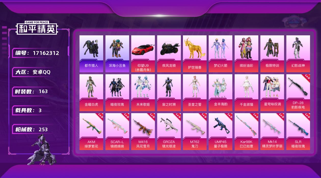 [17162312]安卓 手Q-12粉装-19特效枪-3载具-20粉色飞行器-92563热力值-7王牌印记-163套装-253枪皮