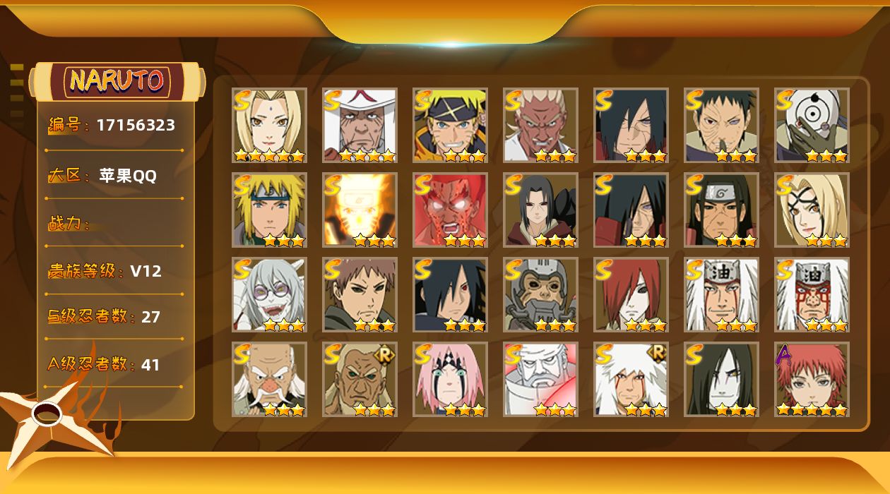 [17156323]VIP12,1295W战力,S忍26个,A忍41个,198忍法帖已开,柱间52片,超哥75片,带土67片