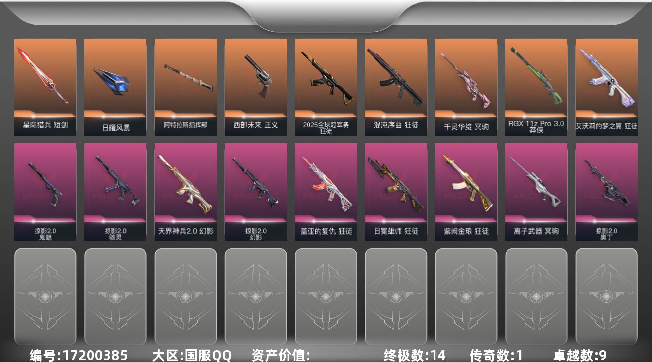 [17200385]【套装】:掠影//2.0套装 【英雄】:幻棱,炼狱,维斯,暮蝶,壹决,铁臂,捷风,雷兹,幽影,不死鸟,贤者,猎枭,蝰蛇,零,芮娜,尚勃勒,霓虹,斯凯,夜露,星礈,K/O,海神,盖可,黑梦,钢锁 【近战武器】:近战武器-影钩,近战武器-穿花蝴蝶,近战武器-剥皮小刀,近战武器-镭切,近战武器-夜刃诡镰,近战武器-日耀风暴 遗器,近战武器-阿特拉斯指挥部 甩棍,近战武器-星际猎兵 短剑 【狂徒】:狂徒-艾沃莉的梦之翼,狂徒-2025全球冠军赛,狂徒-混沌序曲,狂徒-盖亚的复仇,狂徒-日冕雄师,狂徒-紫阙金琅 【幻影】:幻影-天界神兵//2.0,幻影-掠影//2.0 【冥驹】:冥驹-千灵华绽,冥驹-离子武器 【莽侠】:莽侠-RGX 11z Pro//3.0 【奥丁】:奥丁-掠影//2.0 【骇灵】:骇灵-掠影//2.0,骇灵-无限竞技 【正义】:正义-西部未来 【鬼魅】:鬼魅-掠影//2.0 【卡面】:红鳞松叶 卡面,Clutch 卡面,无畏契约GO!第一卷:芮娜 卡面,无畏契约GO!第一卷:零 卡面,无垠星环 卡面,《双城之战》金克丝 卡面,别冒尖 卡面,代号红色 卡面,新兵报到 卡面,V契约 卡面,无畏契约 卡面 【喷漆】:买装还是存钱 喷漆,红鳞 喷漆,无畏契约GO!第一卷:贤者 喷漆,松叶 喷漆,放下武器 喷漆,胜利属于无畏契约 喷漆,GLHF 喷漆,无畏契约 喷漆 【挂饰】:薰衣草之心 挂饰,天外飞客 挂饰,《双城之战》魄罗 挂饰,无畏契约 纪念币 挂饰