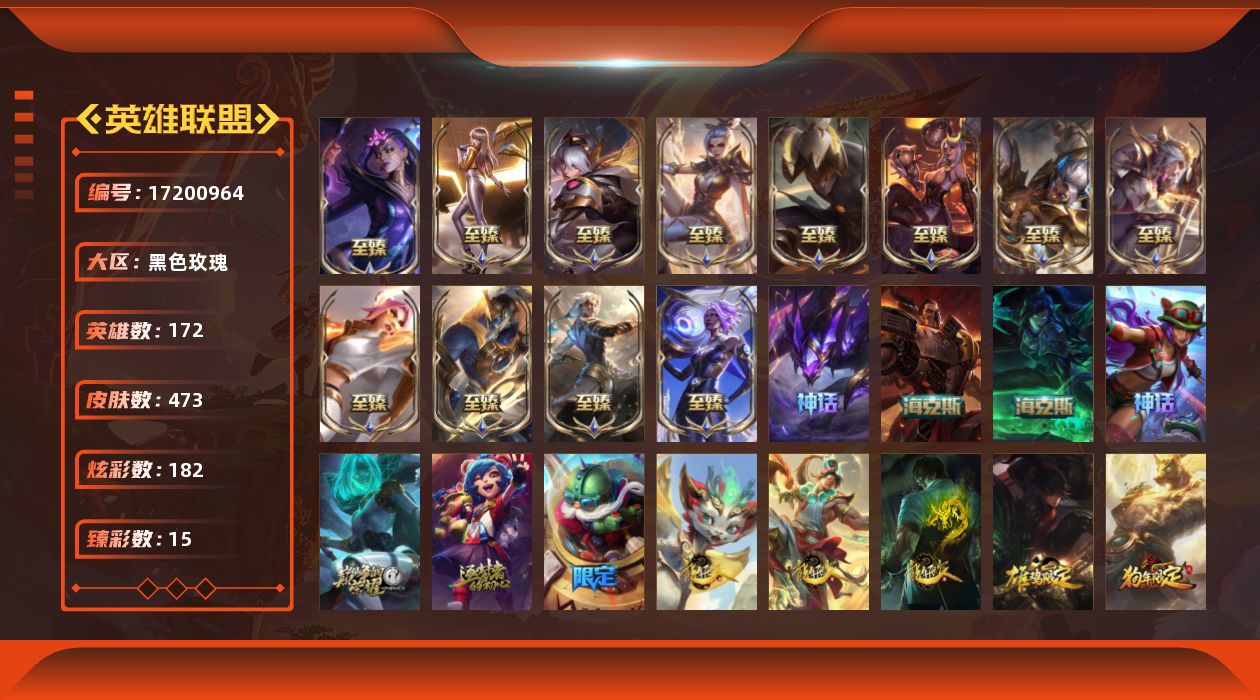 [17200964]【店主推荐捡漏号】未定级段位-172英雄-473皮肤-182炫彩-0终极-19神话-76限定-59传说-99史诗
