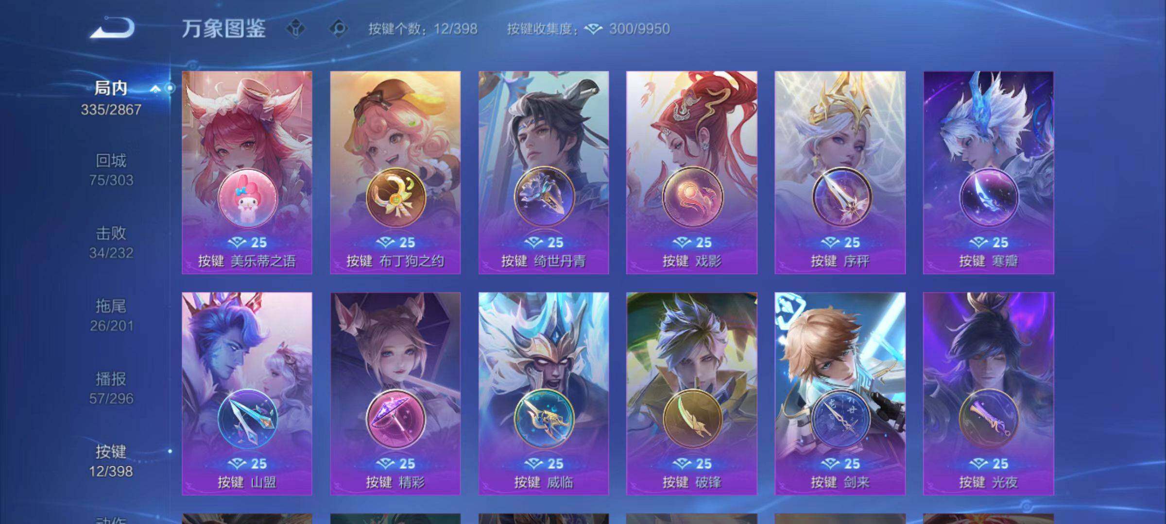 老夫子醍醐杖,鬼谷子原初探秘者,狄仁杰万华元夜,程咬金演武夺筹,钟馗驱傩正仪,苏烈千军破阵,女娲朔望之晖,蒙犽狂想玩偶喵,元歌云间偶戏,达摩沙漠行僧,兰陵王金庭之子,沈梦溪大漠名商,李元芳云中旅人,桑启海盐诗旅,裴擒虎擒涛扼浪,鲁班大师探海日志,张良古海寻踪,项羽苍威无极,镜青焰无极