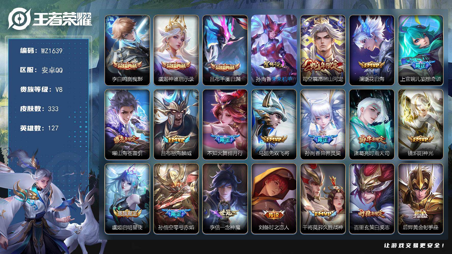 - [12715267]安卓Q-V3-至尊星耀III段位-121英雄-265皮肤-2典藏-0珍品无双-0无双-0珍品传说-17传说-66史诗 【荣耀典藏】:孙悟空全息碎影,芈月大秦宣太后 【内测皮肤】:孙尚香蔷薇恋人,狂铁特工战影 【传说皮肤】:狄仁杰超时空战士,孙悟空地狱火,宫本武藏地狱之眼,孙尚香末日机甲,李白凤求凰,貂蝉仲夏夜之梦,诸葛亮武陵仙君,后羿黄金射手座,花木兰冠军飞将,百里玄策白虎志,达摩黄金狮子座,干将莫邪久胜战神,伽罗太华,李信一念神魔,孙悟空零号赤焰,虞姬启明星使,桑启鸣野蒿 【限定皮肤】:白起狰,姜子牙天穹之誓,杨戬破阵退雄兵,狄仁杰阴阳师,虞姬凯尔特女王,赵云皇家上将,嬴政白昼王子,孙尚香蔷薇恋人,鲁班七号狮舞东方,孙膑妖精王,扁鹊炼金王,芈月重明,吕布猎兽之王,周瑜赤莲之焰,夏侯惇朔风刀,曹操烛龙,典韦穷奇,典韦蓝屏警告,马可波罗暗影游猎,狄仁杰魔术师,狄仁杰万华元夜,达摩沙漠行僧,项羽海滩派对,老夫子醍醐杖,安琪拉魔法小厨娘,程咬金演武夺筹,露娜一生所爱,韩信逐梦之影,兰陵王驯魔猎人,兰陵王金庭之子,花木兰青春决赛季,孙悟空至尊宝,孙悟空大圣娶亲,孙悟空零号赤焰,牛魔御旌,李元芳银河之约,李元芳云中旅人,虞姬霸王别姬,虞姬启明星使,钟馗神迹守卫,钟馗驱傩正仪,杨玉环遇见飞天,女娲朔望之晖,干将莫邪冰霜恋舞曲,雅典娜单词大作战,雅典娜黎明之约,蔡文姬繁星吟游,太乙真人饕餮,鬼谷子原初探秘者,诸葛亮武陵仙君,铠青龙志,苏烈千军破阵,百里玄策白虎志,百里玄策原初追逐者,百里守约朱雀志,弈星混沌棋,沈梦溪星空之诺,沈梦溪大漠名商,明世隐疑决卦,裴擒虎李小龙,裴擒虎擒涛扼浪,狂铁御狮,米莱狄御霄,云中君纤云弄巧,伽罗太华,盾山御銮,猪八戒西部大镖客,上官婉儿梁祝,蒙犽狂想玩偶喵,鲁班大师探海日志,桑启海盐诗旅,张良古海寻踪,蒙犽百解令,鬼谷子天穹祈灯,姬小满妄想食味,刘邦剑破天穹,周瑜熔金海岸 【年限皮肤】:百里玄策白虎志,百里守约朱雀志,铠青龙志,李白凤求凰,伽罗太华 【赛季限定】:孙膑妖精王,扁鹊炼金王,白起狰,芈月重明,夏侯惇朔风刀,曹操烛龙,典韦穷奇,狄仁杰万华元夜,达摩沙漠行僧,老夫子醍醐杖,程咬金演武夺筹,兰陵王金庭之子,张良古海寻踪,牛魔御旌,李元芳云中旅人,虞姬凯尔特女王,钟馗驱傩正仪,雅典娜黎明之约,太乙真人饕餮,鬼谷子原初探秘者,苏烈千军破阵,百里