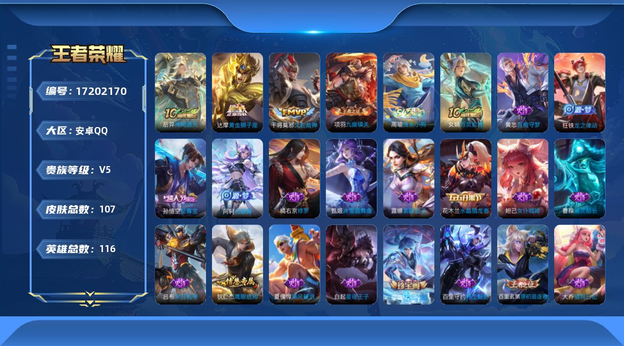 - PX_2095774-实名: 可修改 贵族等级: V3 英雄数: 80 皮肤数: 41 传说皮: 琥珀纪元马超,幻光神枪 限定皮: 愿照·九州拓