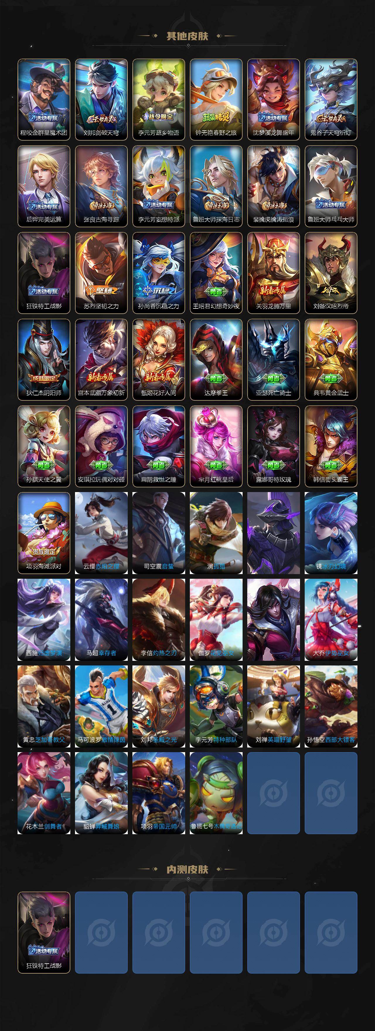 【限定皮肤】:蒙犽顽岩魄,姜子牙天穹之誓,狄仁杰阴阳师,赵云皇家上将,项羽海滩派对,孙悟空至尊宝,百里玄策原初追逐者,裴擒虎擒涛扼浪,鲁班大师探海日志,张良古海寻踪,蒙恬荣光圣徽,鬼谷子天穹祈灯,沈梦溪龙舞盛年,鲁班七号蔬乡物语,李元芳蔬乡物语,刘邦剑破天穹,程咬金群星魔术团,周瑜熔金海岸