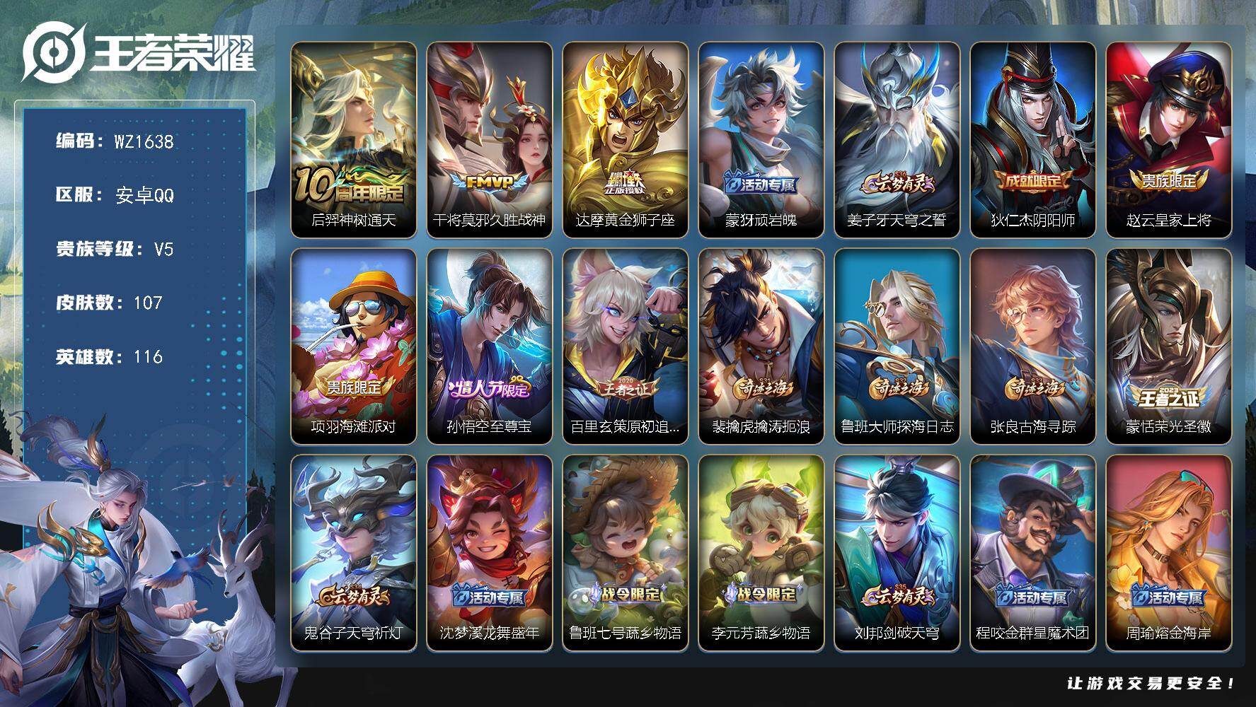 - [11682662]V9 3典藏 22传说 124英雄 290皮肤 典藏英雄武则天 可修改实名 女号 优质装备:倪克斯神谕(宇宙婆娘),杀手不太冷,鸣剑·曳影,黄金狮子座,冠军飞将,云鹰飞将(小将军),猫影幻舞,炽阳神光,一念神魔,末日机甲-孙尚香(绿蚂蚱),仲夏夜之梦(大飞蛾),音你心动-小乔,零号·赤焰,海洋之心,胖达荣荣,时之恋人-刘备(电焊工),游龙清影(小青龙),超时空战士-狄仁杰,遇见胡旋 珍宝阁皮:女武神 限定皮:鸣野蒿,至尊宝,白虎志(电光耗子),凤求凰(白切鸡),凤凰于飞,太华(伽罗年限),梅西,异界灵契(白毛香),白鹤梁神女,神威(电光马子),飞衡(韩信年限),遇见飞天,高山流水,冰锋战神,游园惊梦,梁祝,逐梦之翼,逐梦之星,奔雷神使(牛魔年限),天狼绘梦者,李小龙,逐梦之影,朱雀志(守约年限),默契交锋-花木兰,孙行者,猪悟能,大圣娶亲,青春决赛季,冰霜恋舞曲 史诗皮:紫霞仙子,苍穹之光,电玩小子(小书包),白龙吟,黄金分割率,千年之狐,无限星赏官,冰冠公主,青蛇,偶像歌手,暗夜猫娘,龙骑士(小龙虾),猫狗日记-孙策,时之恋人-孙尚香,乱世虎臣,节奏热浪,女仆咖啡,水果甜心,天才门将,星夜王子,心灵骇客,德古拉伯爵,暗隐猎兽者,幽灵船长,鬼剑武藏,心灵战警,乐园奇幻夜,舞动绿茵,地狱岩魂,纤云弄巧,繁星吟游(呼啦呼啦),拒霜思,缤纷独角兽,乘风破浪,逐浪之夏,水晶猎龙者,曙光守护者,金属风暴,原初追逐者,圣诞狂欢,圣诞恋歌,鹰眼统帅,暗夜贵公子,魅力维加斯,黎明之约,未来纪元-赵云