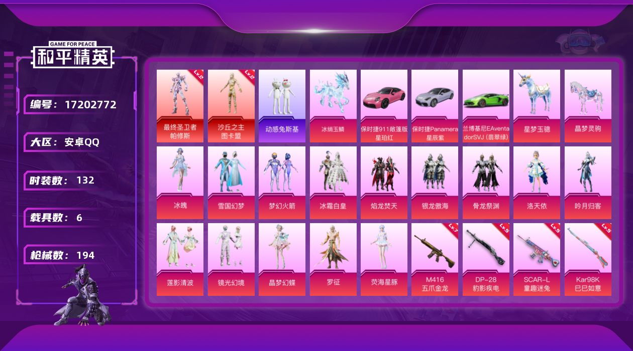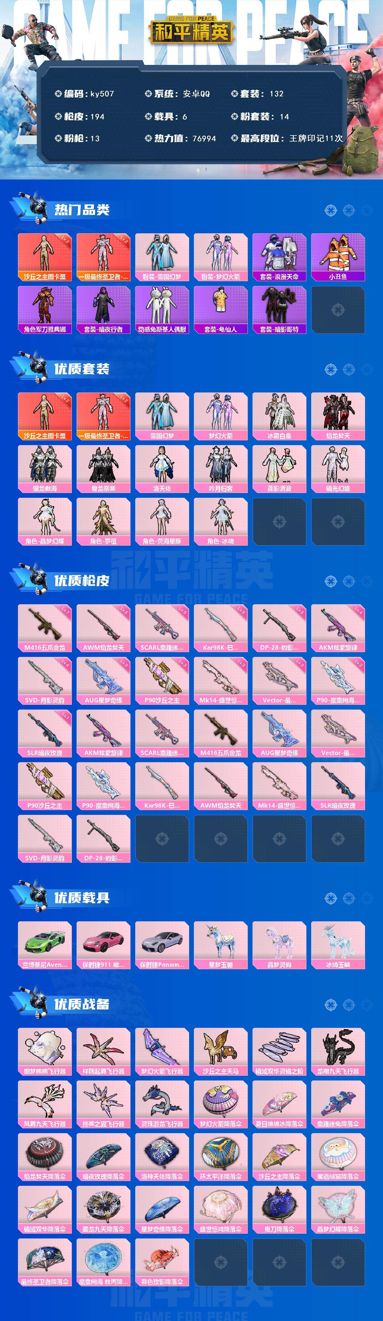 [17202772]安卓 手Q-2神装-14粉装-13特效枪-6载具-9粉色飞行器-76994热力值-11王牌印记-132套装-194枪皮 【红色神装等级】:最终圣卫者-帕修斯(二级),沙丘之主-图卡盟(二级) 【红色角色神装】:最终圣卫者-帕修斯,沙丘之主-图卡盟 【热门品类】:粉装-雪国幻梦,粉装-梦幻火箭,套装-浪漫天命,套装-小丑鱼,角色-军刀雅典娜,套装-暗夜行者,套装-动感兔斯基人偶服,套装-龟仙人,套装-暗影哥特 【粉色套装】:粉装-雪国幻梦,粉装-梦幻火箭,粉装-冰霜白皇,粉装-焰龙焚天,粉装-银龙傲海,粉装-骨龙祭渊,角色-洛天依,粉装-吟月归客,粉装-莲影清波,粉装-镜光幻境,角色-晶梦幻蝶,角色-罗征,角色-荧海星豚,角色-冰魄 【粉色枪皮等级】:AKM-炫紫旋律(四级),SCAR-L-童趣迷兔(五级),M416-五爪金龙(七级),AUG-星梦奇缘(三级),Vector-最终圣卫者(三级),P90-沙丘之主(三级),P90-魔童闹海 敖丙(二级),Kar98K-巳巳如意(五级),AWM-焰龙焚天(五级),Mk14-盛世惊鸿(三级),SLR-暗夜玫瑰(一级),SVD-月影灵韵(四级),DP-28-豹影疾电(五级) 【粉色载具】:兰博基尼Aventador SVJ(翡翠绿),保时捷911 敞篷版(星珀红),保时捷Panamera(星辰紫),星梦玉骢,晶梦灵驹,冰绡玉鳞 【粉色枪皮】:AKM-炫紫旋律,SCAR-L-童趣迷兔,M416-五爪金龙,AUG-星梦奇缘,Vector-最终圣卫者,P90-沙丘之主,P90-魔童闹海 敖丙,Kar98K-巳巳如意,AWM-焰龙焚天,Mk14-盛世惊鸿,SLR-暗夜玫瑰,SVD-月影灵韵,DP-28-豹影疾电 【粉色飞行器】:酣梦熊熊飞行器,祥瑞起舞飞行器,梦幻火箭飞行器,沙丘之主天马,镜域双华-灵镜之阶,龙翔九天飞行器,凤舞九天飞行器,终晖之翼飞行器,灵珠游龙飞行器 【粉色降落伞】:梦幻火箭降落伞,夏日绵绵冰降落伞,童趣迷兔降落伞,焰龙焚天降落伞,暗夜玫瑰降落伞,洛神天依降落伞,环太平洋降落伞,沙丘之主降落伞,蜜语绒猫降落伞,镜域双华降落伞,墨龙九天降落伞,星梦奇缘降落伞,盛世惊鸿降落伞,鬼刀降落伞,晶梦幻蝶降落伞,最终圣卫者降落伞,魔童闹海 敖丙降落伞,暮色玫影降落伞 【稀有套装】:套装-龟仙人,套装-巳巳如意,套装-雪国风尚