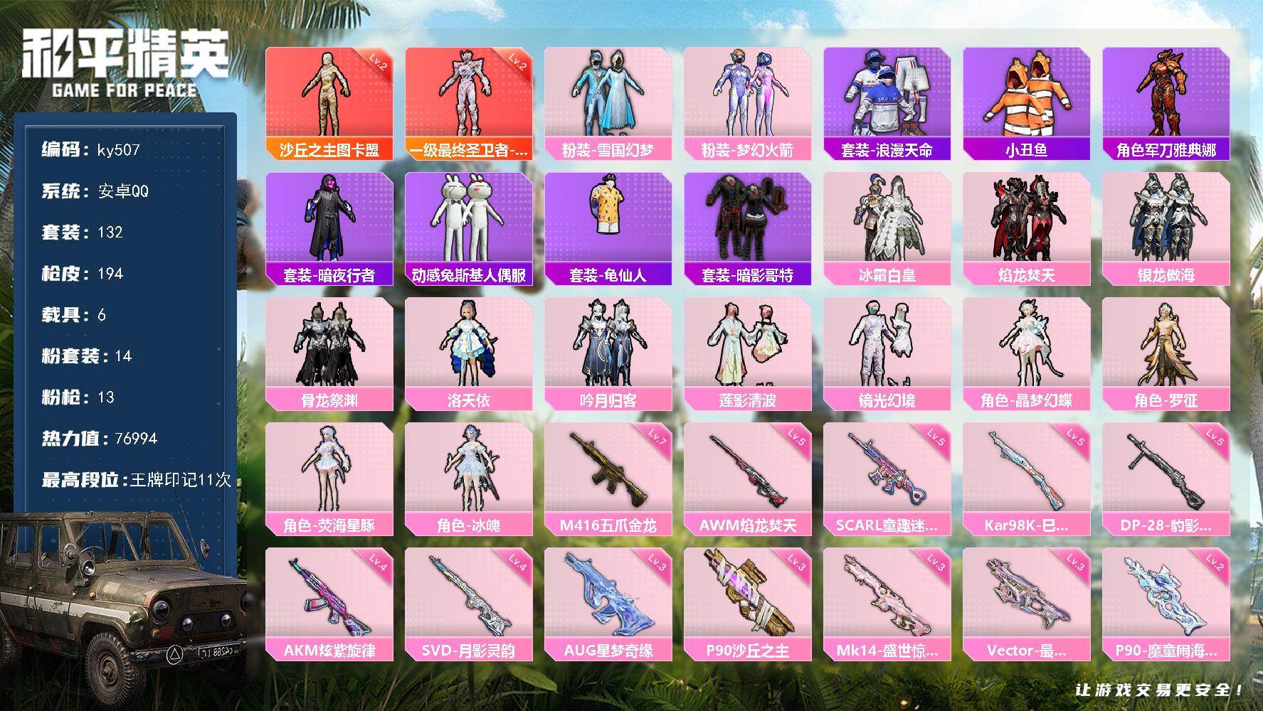 [17202772]安卓 手Q-2神装-14粉装-13特效枪-6载具-9粉色飞行器-76994热力值-11王牌印记-132套装-194枪皮