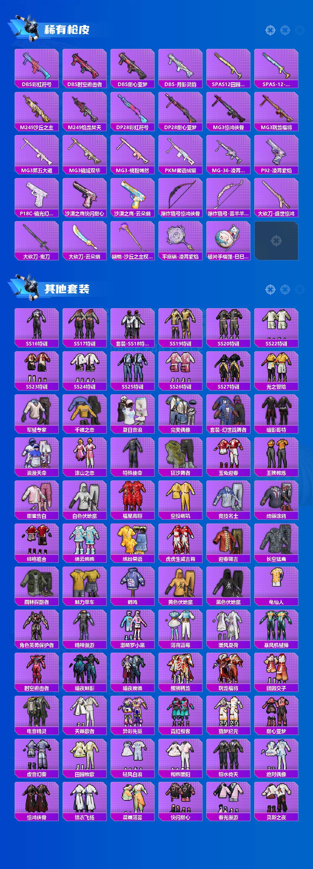 AKM-炫紫旋律,SCAR-L-童趣迷兔,M416-五爪金龙,AUG-星梦奇缘,P90-沙丘之主,Kar98K-巳巳如意,AWM-焰龙焚天,Mk14-盛世惊鸿,SLR-暗夜玫瑰,SVD-月影灵韵