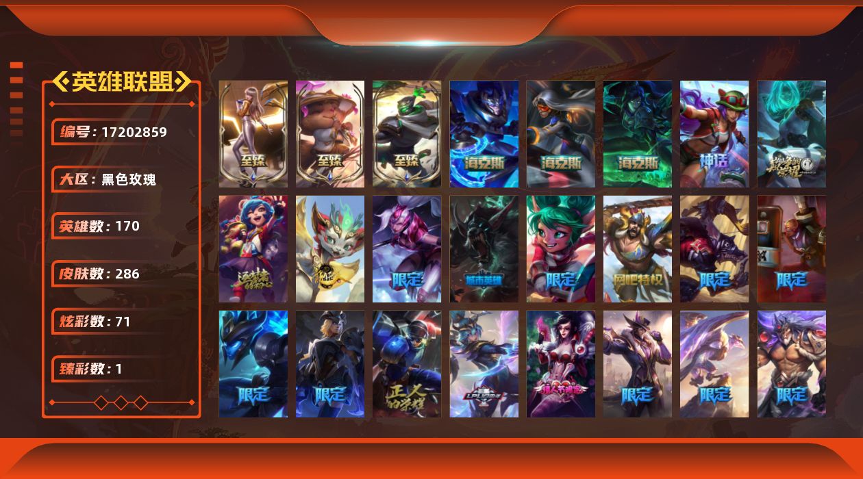 [17202859]未定级段位-170英雄-286皮肤-71炫彩-0终极-11神话-31限定-23传说-72史诗