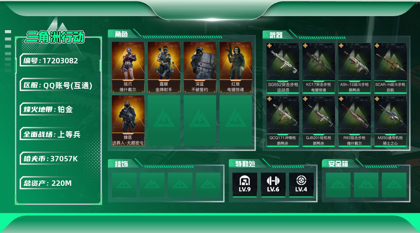 [17203082]【特价出售/店主推荐】 220m总资产-37057k哈伏币-60烽火等级-铂金-30战场等级-上等兵 【干员外观】:骇爪-维什戴尔,蜂医-送葬人·无题密令,深蓝-不破誓约,红狼-电锯惊魂,露娜-金牌射手 【近战皮肤】:近战-黑鹰 【传说外观】:M4A1突击步枪-阿米娅,ASh-12战斗步枪-鹅鸭杀,SG552突击步枪-运动员,AK-12突击步枪-特斯拉线圈,SCAR-H战斗步枪-启航,腾龙突击步枪-捞点薯条,KC17突击步枪-电锯惊魂,UZI冲锋枪-特斯拉线圈,SR-3M紧凑突击步枪-特斯拉线圈,勇士冲锋枪-能天使-午夜邮差,QCQ171冲锋枪-鹅鸭杀,725双管霰弹枪-送葬人-无题密令,M250通用机枪-骑士之心,QJB201轻机枪-鹅鸭杀,R93狙击步枪-维什戴尔,AWM狙击步枪-捞点薯条,93R-捞点薯条,复合弓-黑·天际线 【史诗外观】:ASh-12战斗步枪-无极限,M16A4突击步枪-竞赛选手,AUG突击步枪-蝮蛇,M7战斗步枪-百步穿杨,G3战斗步枪-流沙送葬,AS Val突击步枪-百步穿杨,腾龙突击步枪-无垢,K437突击步枪-守护者,MP5冲锋枪-战术竞备,Vector冲锋枪-猎鳄行动,Vector冲锋枪-百步穿杨,Vector冲锋枪-异域战争,SR-3M紧凑突击步枪-荒野求生,SR-3M紧凑突击步枪-战术竞备,勇士冲锋枪-工业狂潮,MP7冲锋枪-无垢,MP7冲锋枪-守护者,PKM通用机枪-蝮蛇,PKM通用机枪-荒野求生,M250通用机枪-囚徒,Mini-14射手步枪-守护者,SVD狙击步枪-荒野求生,PSG-1射手步枪-无垢,SV-98狙击步枪-林中猎手,M700狙击步枪-蝮蛇,M700狙击步枪-百步穿杨,AWM狙击步枪-无极限,AWM狙击步枪-流沙送葬,沙漠之鹰-曙光,复合弓-守护者 【稀有外观】:M1014霰弹枪-花岗岩,M4A1突击步枪-繁盛,AKM突击步枪-战术演练,AKM突击步枪-肃杀,QBZ95-1突击步枪-公平竞技,ASh-12战斗步枪-繁盛,K416突击步枪-虎啸,M16A4突击步枪-街头涂鸦,M7战斗步枪-捣蛋鬼,SCAR-H战斗步枪-荣耀列队,SCAR-H战斗步枪-黄昏,G3战斗步枪-战术演练,G3战斗步枪-主宰,腾龙突击步枪-雪崩,腾龙突击步枪-前沿科技,MP5冲锋枪-虎啸,MP5冲锋枪-哈夫克卫队,P90冲锋枪-黄昏,P9