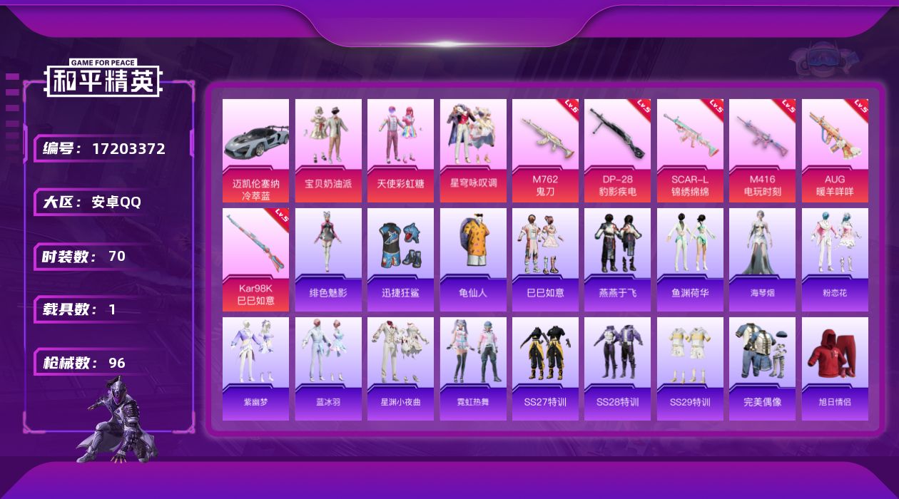 - [13015402]安卓 手Q-2粉装-8特效枪-0载具-1粉色飞行器-48694热力值-6王牌印记-109套装-168枪皮 【热门品类】:套装-奇异狩猎者,角色-Mark.06 【粉色套装】:角色-复仇流浪者,角色-月影灵韵 【粉色枪皮等级】:M416-电玩时刻(五级),GROZA-镜光银凌(五级),AUG-暖羊咩咩(五级),M762-青锋波束(五级),UMP45-量子极限(五级),Kar98K-巳巳如意(五级),Mk14-甜梦熊击(五级),DP-28-豹影疾电(三级) 【粉色枪皮】:M416-电玩时刻,GROZA-镜光银凌,AUG-暖羊咩咩,M762-青锋波束,UMP45-量子极限,Kar98K-巳巳如意,Mk14-甜梦熊击,DP-28-豹影疾电 【粉色降落伞】:星之彼岸降落伞,垂柳戏鸭降落伞,彩虹甜喵降落伞,霓虹漫游降落伞,守护天翼降落伞,金丰海韵降落伞,月影灵韵降落伞,鬼刀降落伞,星穹咏叹调降落伞,时光之吻降落伞 【稀有套装】:套装-巳巳如意,套装-雏菊兔兔,套装-萝兰蝴蝶,角色-拉斐尔,角色-达芬奇,套装-糖糖葫芦,套装-青团波波,套装-棉花软糖,角色-都市丽猫,套装-燕燕于飞,套装-鱼渊荷华,角色-风玲,套装-粉恋花,套装-紫幽梦,套装-蓝冰羽,套装-星影赞美诗,套装-彩虹兔,套装-云朵鹅,套装-雪绒豹,角色-乐音,套装-朱霞炽焰,套装-凌霄紫焰 【稀有枪皮】:AKM-夜灯,AKM-彩虹符号,AKM-生命誓言,AKM-破晓战魂,AKM-萌趣颜团子,AKM-虎虎生威,M16A4-幻世战舞者,M16A4-红色方程式,SCAR-L-炫彩节奏,SCAR-L-玉兔迎春,SCAR-L-红色方程式,SCAR-L-青丘仙客,M416-红色方程式,M416-绯红前夜,M416-蓝色火焰,GROZA-彩虹符号,AUG-甜蜜菠萝,AUG-耀粉歌者,AUG-青春冒险家,QBZ-彩虹符号,M762-天降萌叽,M762-彩虹符号,M762-绯红前夜,M762-云朵鹅,Mk47-青春冒险家,G36C-星穹咏叹调,AC-VAL-天降萌叽,蜜獾-娇憨猪猪,ARX-凌霄紫焰,UZI-天降萌叽,UZI-娇憨猪猪,UZI-炫彩节奏,UZI-红色方程式,UMP45-生命誓言,UMP45-蓝色火焰,Vector-彩虹符号,Vector-生命誓言,汤姆逊-奇异狩猎者,汤姆逊-环太平洋,野牛-青春冒险家,JS9-凌霄紫