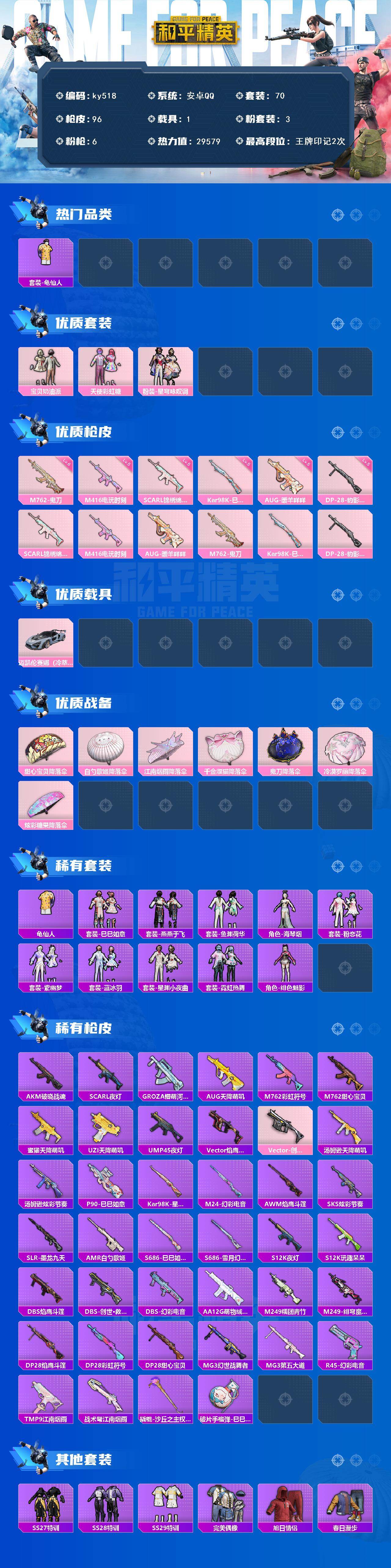 [17203372]安卓 手Q-3粉装-6特效枪-1载具-0粉色飞行器-29579热力值-2王牌印记-70套装-96枪皮 【热门品类】:套装-龟仙人 【粉色套装】:粉装-宝贝奶油派,粉装-天使彩虹糖,粉装-星穹咏叹调 【粉色枪皮等级】:SCAR-L-锦绣绵绵(五级),M416-电玩时刻(五级),AUG-暖羊咩咩(五级),M762-鬼刀(六级),Kar98K-巳巳如意(五级),DP-28-豹影疾电(五级) 【粉色载具】:迈凯伦塞纳(冷萃蓝) 【粉色枪皮】:SCAR-L-锦绣绵绵,M416-电玩时刻,AUG-暖羊咩咩,M762-鬼刀,Kar98K-巳巳如意,DP-28-豹影疾电 【粉色降落伞】:甜心宝贝降落伞,白勺歌姬降落伞,江南烟雨降落伞,千金淑猫降落伞,鬼刀降落伞,冷漠罗丽降落伞,炫彩糖果降落伞 【稀有套装】:套装-龟仙人,套装-巳巳如意,套装-燕燕于飞,套装-鱼渊荷华,角色-海琴烟,套装-粉恋花,套装-紫幽梦,套装-蓝冰羽,套装-星渊小夜曲,套装-霓虹热舞,角色-绯色魅影 【稀有枪皮】:AKM-破晓战魂,SCAR-L-夜灯,GROZA-懵萌河马,AUG-天降萌叽,M762-彩虹符号,M762-甜心宝贝,蜜獾-天降萌叽,UZI-天降萌叽,UMP45-夜灯,Vector-焰鹰斗篷,Vector-创世·救赎,汤姆逊-天降萌叽,汤姆逊-炫彩节奏,P90-巳巳如意,Kar98K-星穹咏叹调,M24-幻彩电音,AWM-焰鹰斗篷,SKS-炫彩节奏,SLR-墨龙九天,AMR-白勺歌姬,S686-雪月幻音,S686-巳巳如意,S12K-玩趣呆呆,S12K-夜灯,DBS-焰鹰斗篷,DBS-幻彩电音,DBS-创世·救赎,AA12-G-萌物绒绒,M249-糯团青竹,M249-绯穹魔姬,DP-28-焰鹰斗篷,DP-28-彩虹符号,DP-28-甜心宝贝,MG3-幻世战舞者,MG3-第五大道,R45-幻彩电音,TMP-9-江南烟雨,战术弩-江南烟雨,撬棍-沙丘之主权杖,破片手榴弹-巳巳如意 【其他套装】:套装-SS27特训,套装-SS28特训,套装-SS29特训,套装-完美偶像,套装-旭日情侣,套装-春日漫步,套装-森林游猎者,套装-浪漫假日,套装-海岛探路者,套装-深蓝色名流,套装-燃烧卡路里,套装-王牌教练,套装-白熊同盟,套装-白色伏地魔,套装-竞技名士,套装-缤纷果语,套装-蓝彩潮人,套装-街头潮人,套