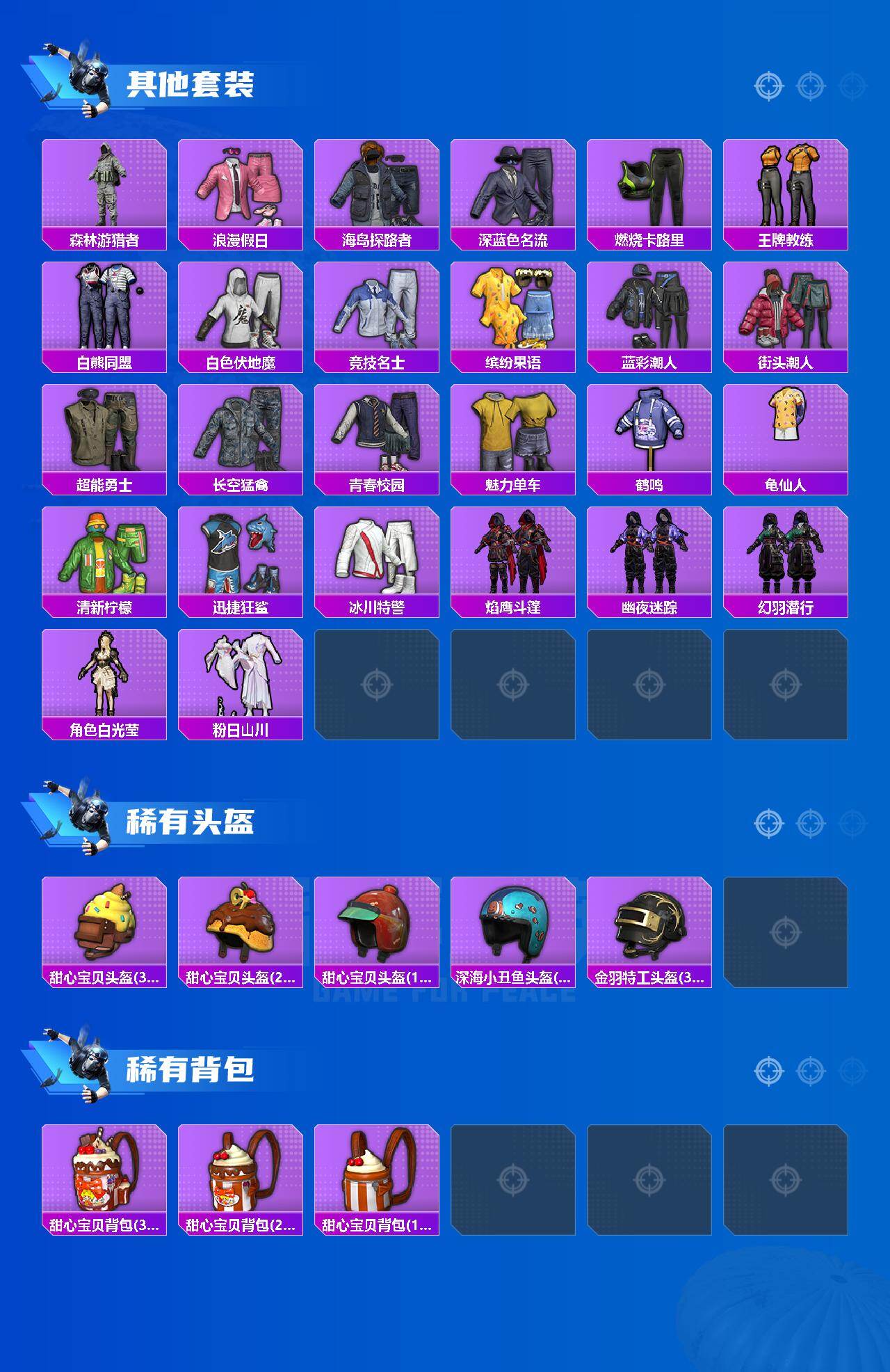 【其他套装】:套装-SS27特训,套装-SS28特训,套装-SS29特训,套装-完美偶像,套装-旭日情侣,套装-春日漫步,套装-森林游猎者,套装-浪漫假日,套装-海岛探路者,套装-深蓝色名流,套装-燃烧卡路里,套装-王牌教练,套装-白熊同盟,套装-白色伏地魔,套装-竞技名士,套装-缤纷果语,套装-蓝彩潮人,套装-街头潮人,套