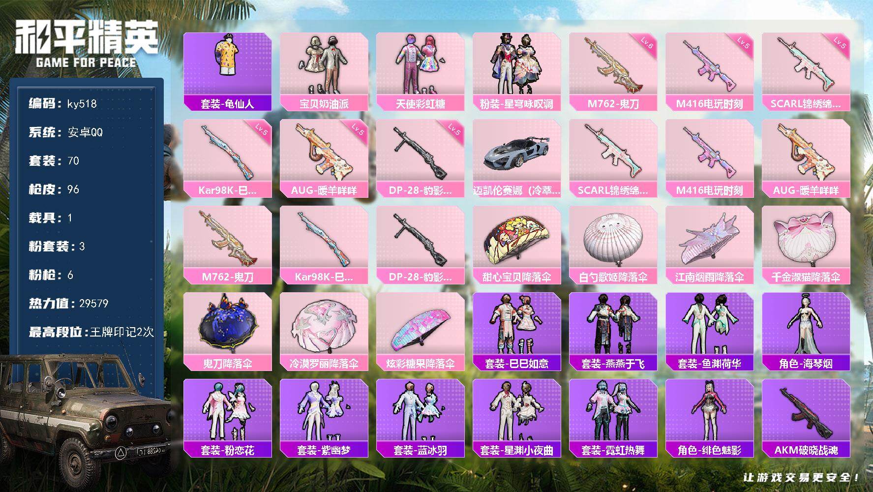 [17203372]安卓 手Q-3粉装-6特效枪-1载具-0粉色飞行器-29579热力值-2王牌印记-70套装-96枪皮