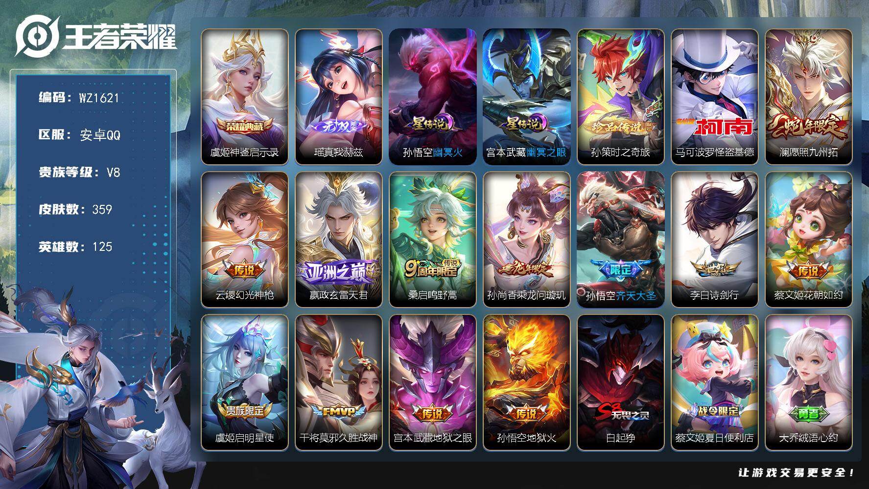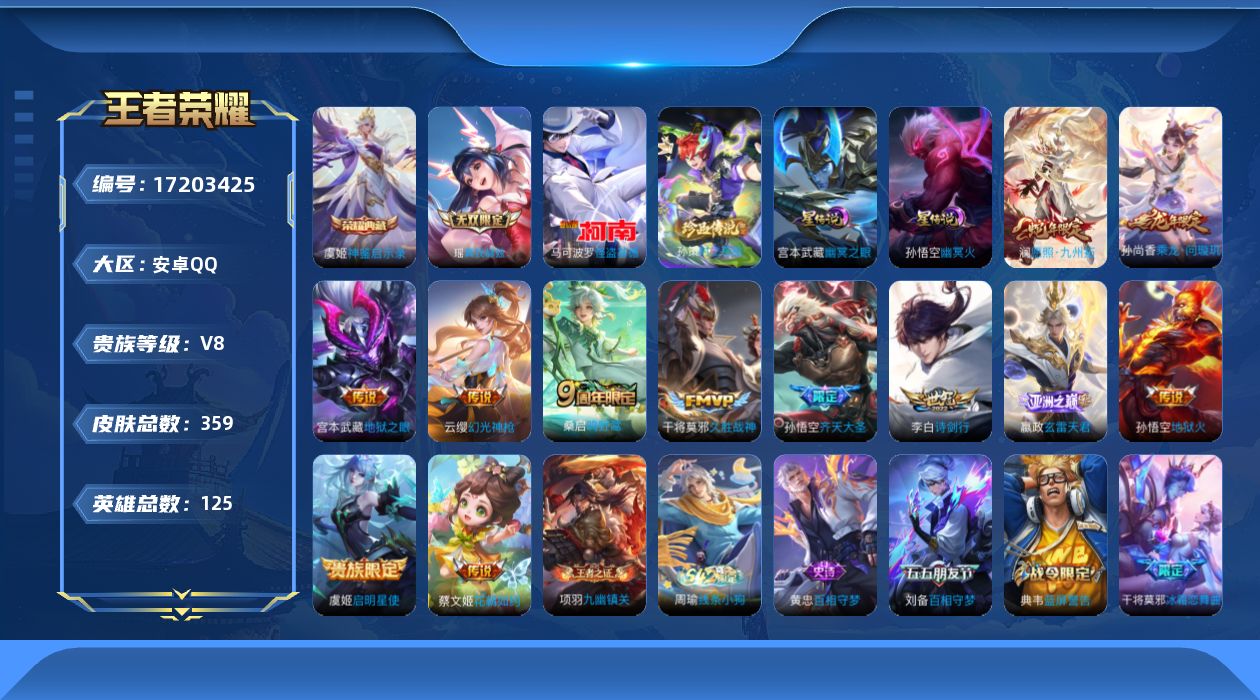 [17203425]安卓Q-V8-359皮肤-1典藏皮肤-1无双-2珍品传说-12传说-98史诗 【英雄全皮】:戈娅全皮,空空儿全皮,影全皮 【荣耀典藏】:虞姬神鉴启示录 【无双皮肤】:瑶真我赫兹 【珍品传说】:孙策时之奇旅,马可波罗怪盗基德 【传说皮肤】:澜愿照九州拓,云缨幻光神枪,嬴政玄雷天君,桑启鸣野蒿,孙尚香乘龙问璇玑,孙悟空齐天大圣,李白诗剑行,蔡文姬花朝如约,虞姬启明星使,干将莫邪久胜战神,宫本武藏地狱之眼,孙悟空地狱火 【限定皮肤】:白起狰,蔡文姬夏日便利店,大乔绒语心约,虞姬夏日便利店,姜子牙天穹之誓,杨戬破阵退雄兵,狄仁杰阴阳师,虞姬凯尔特女王,赵云皇家上将,赵云引擎之心,墨子神迹守卫,嬴政白昼王子,孙尚香蔷薇恋人,鲁班七号狮舞东方,庄周高山流水,扁鹊奇幻香踪,芈月重明,吕布猎兽之王,吕布御风骁将,元歌云间偶戏,夏侯惇朔风刀,甄姬游园惊梦,曹操烛龙,典韦穷奇,典韦蓝屏警告,狄仁杰魔术师,狄仁杰万华元夜,达摩星际陆战队,达摩沙漠行僧,项羽海滩派对,老夫子醍醐杖,老夫子航海奇遇记,程咬金演武夺筹,韩信飞衡,兰陵王金庭之子,亚瑟潮玩骑士王,孙悟空孙行者,孙悟空齐天大圣,牛魔御旌,刘备百相守梦,李元芳银河之约,李元芳云中旅人,虞姬霸王别姬,虞姬启明星使,钟馗神迹守卫,钟馗驱傩正仪,杨玉环遇见飞天,杨戬潮玩骑兵,女娲朔望之晖,干将莫邪冰霜恋舞曲,蔡文姬繁星吟游,太乙真人饕餮,鬼谷子原初探秘者,百里玄策原初追逐者,弈星混沌棋,梦奇顽趣,沈梦溪星空之诺,明世隐疑决卦,裴擒虎李小龙,裴擒虎擒涛扼浪,狂铁御狮,米莱狄御霄,米莱狄胡桃异想国,云中君纤云弄巧,盾山御銮,上官婉儿梁祝,嫦娥拒霜思,嫦娥暖冬兔眠,西施玲珑珍味,鲁班大师探海日志,桑启海盐诗旅,暃星界游侠,戈娅驭风魔法,艾琳流音漫舞,司空震地狱燃心,阿古朵江河有灵,张良古海寻踪,蒙犽百解令,蒙恬荣光圣徽,高渐离燃音魔法,妲己灵卜魔法,鬼谷子天穹祈灯,伽罗琥珀纪元,姬小满妄想食味,孙尚香乘龙问璇玑,沈梦溪龙舞盛年,鲁班七号蔬乡物语,李元芳蔬乡物语,刘邦剑破天穹,上官婉儿群星魔术团,程咬金群星魔术团,镜青焰无极,项羽苍威无极,芈月浮光幕影,周瑜熔金海岸 【年限皮肤】:韩信飞衡,吕布御风骁将,孙尚香乘龙问璇玑,澜愿照九州拓 【赛季限定】:虞姬凯尔特女王,白起狰,太乙真人饕餮,曹操烛龙,芈月重明,典韦穷奇,狂铁御狮,米莱狄御霄,牛魔御旌