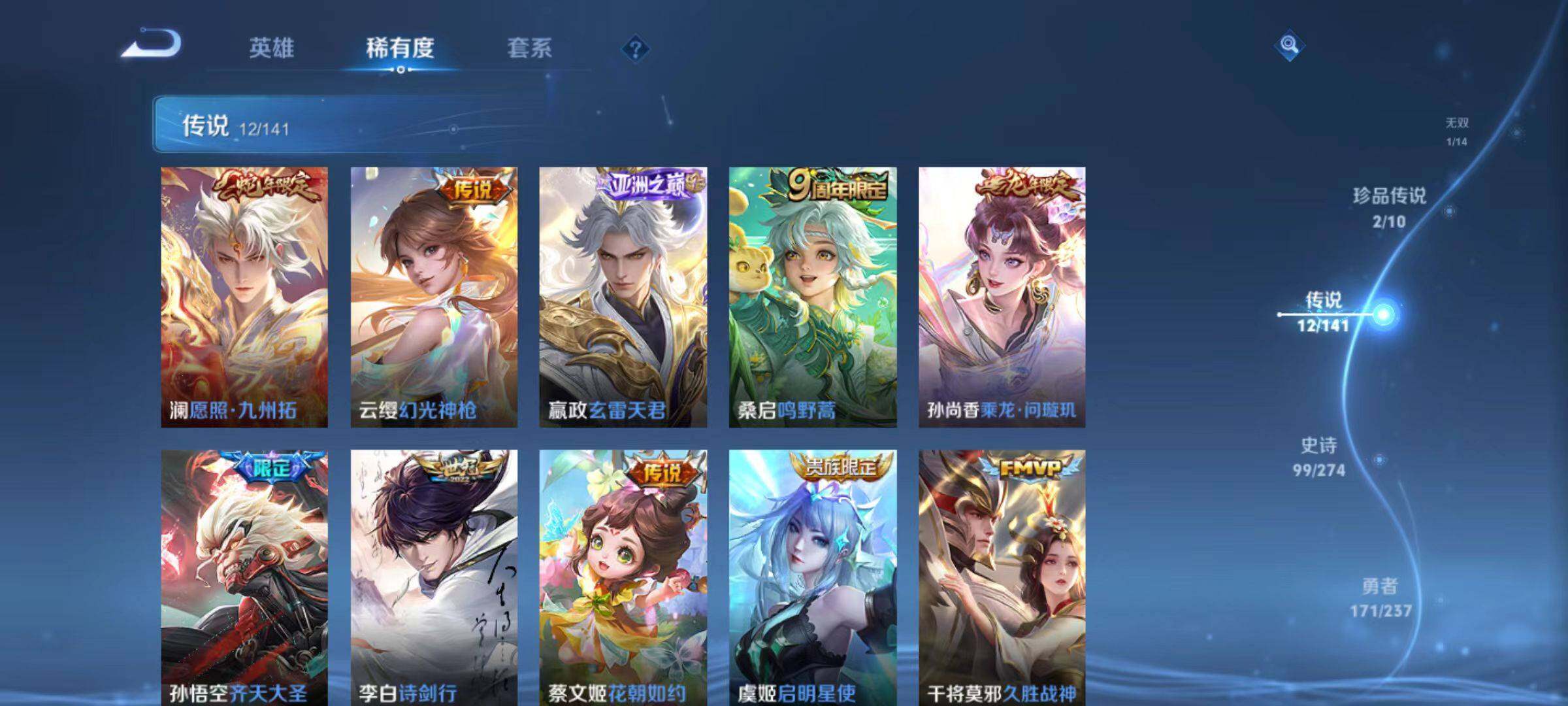 【传说皮肤】:澜愿照九州拓,云缨幻光神枪,嬴政玄雷天君,桑启鸣野蒿,孙尚香乘龙问璇玑,孙悟空齐天大圣,李白诗剑行,蔡文姬花朝如约,虞姬启明星使,干将莫邪久胜战神,宫本武藏地狱之眼,孙悟空地狱火