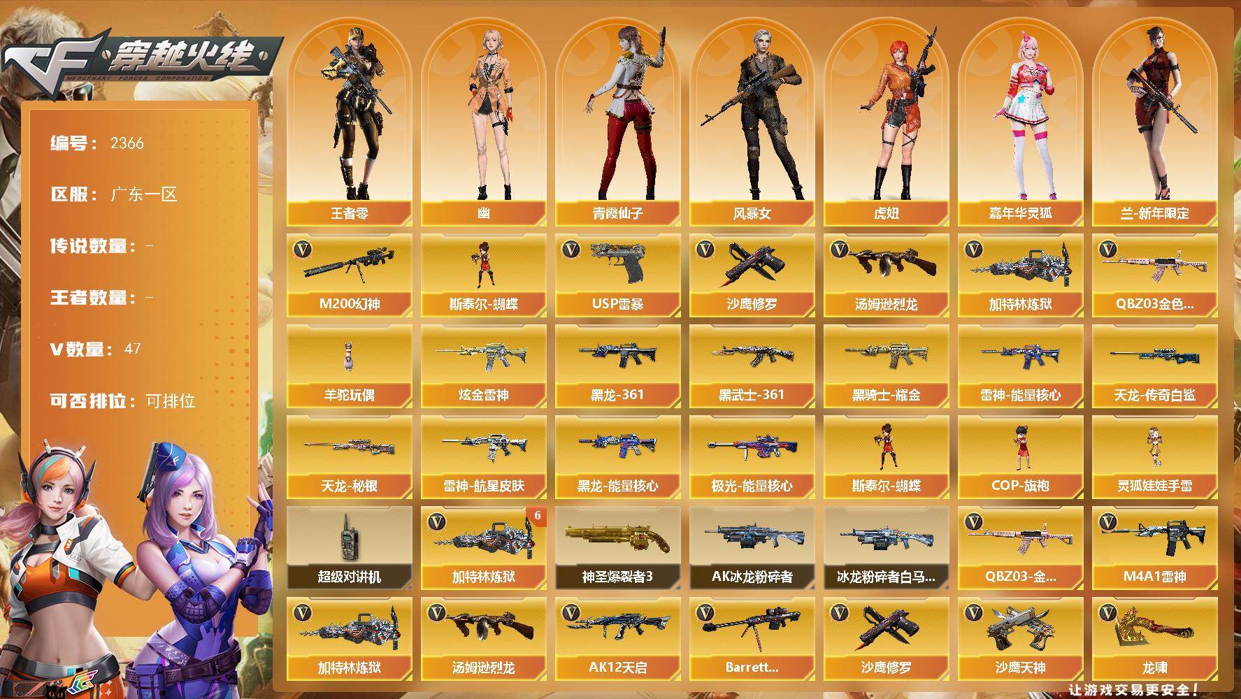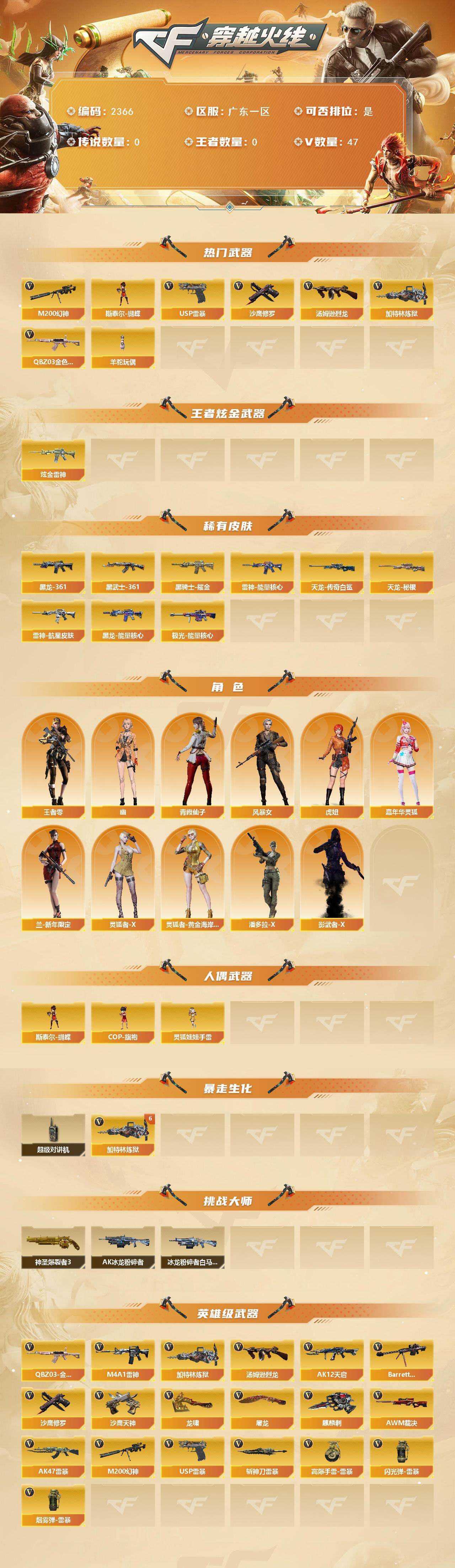 [17203473]广东一区-49V-0王者武器数-1炫金武器数 【热门武器】:QBZ03-金色蔷薇,M200-幻神*2,汤姆逊-烈龙,加特林-炼狱*7,斯泰尔-蝴蝶,羊驼玩偶*2,USP-雷暴*2,沙鹰-修罗*2 【王者炫金武器】:炫金雷神 【皮肤】:雷神-能量核心,雷神-航星皮肤,黑龙-能量核心,M4A1-黑龙-361,黑骑士耀金皮肤,AK47-黑武士-361,天龙-秘银,AWM-天龙-传奇白鲨,极光-能量核心 【角色】:王者-零,风暴女,虎妞,嘉年华灵狐,兰-新年限定,灵狐者-X,灵狐者-黄金海岸,潘多拉-X,青霞仙子,影武者-X,幽 【人偶武器】:斯泰尔-蝴蝶,COP-旗袍,灵狐娃娃手雷 【暴走生化】:超级对讲机 【挑战大师】:神圣爆裂者III,AK47-冰龙粉碎者,冰龙粉碎者-白马银枪 【英雄级武器】:M4A1-雷神,AK12-天启,AK47-雷暴,QBZ03-金色蔷薇,Barrett-毁灭,AWM-裁决*2,M200-幻神*2,加特林-炼狱*7,汤姆逊-烈龙,沙鹰-修罗*2,沙鹰-天神,USP-雷暴*2,屠龙*2,龙啸*2,麒麟刺,斩神刀-雷暴,高爆手雷-雷暴*5,闪光弹-雷暴*5,烟雾弹-雷暴*5 【道具】:炫彩背包,背包-洛丽塔,超级背包,绿色巨人,灵魂忍者,迷雾幽灵,夺命之镰,防化服*2,金色流光-枪王排位*2,星辰流光-枪王排位,防弹头盔*4,防弹衣*4,C4工具钳*4,手雷包*4 【特殊枪械】:蝴蝶斯泰尔+1烈龙,1烈龙,6炼狱,1蝴蝶斯泰尔
