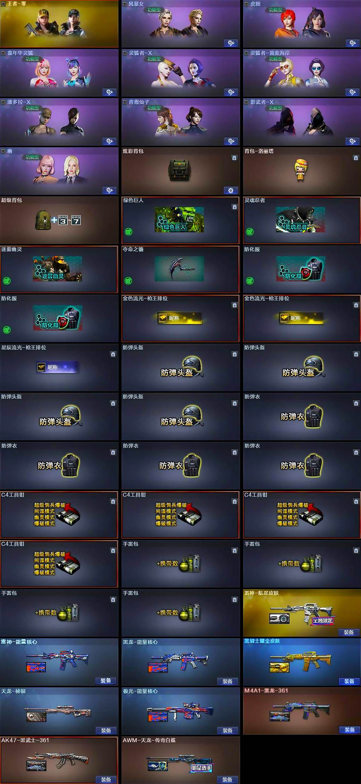 【道具】:炫彩背包,背包-洛丽塔,超级背包,绿色巨人,灵魂忍者,迷雾幽灵,夺命之镰,防化服*2,金色流光-枪王排位*2,星辰流光-枪王排位,防弹头盔*4,防弹衣*4,C4工具钳*4,手雷包*4
