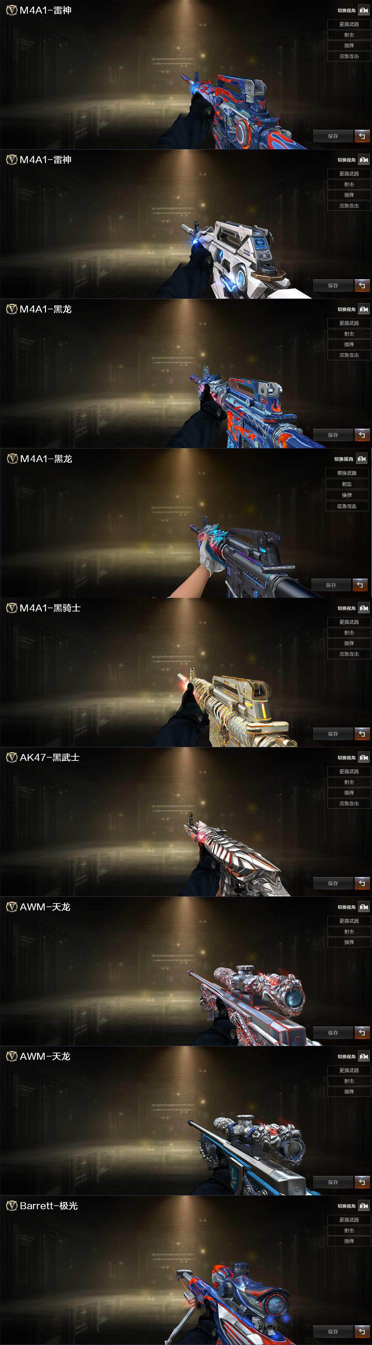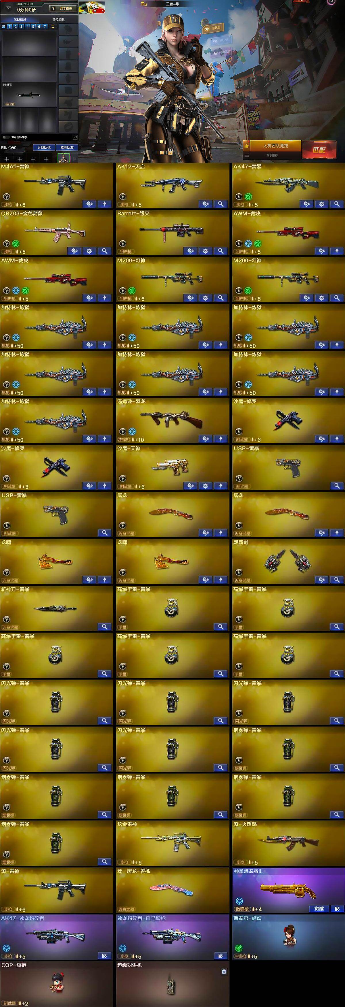 【英雄级武器】:M4A1-雷神,AK12-天启,AK47-雷暴,QBZ03-金色蔷薇,Barrett-毁灭,AWM-裁决*2,M200-幻神*2,加特林-炼狱*7,汤姆逊-烈龙,沙鹰-修罗*2,沙鹰-天神,USP-雷暴*2,屠龙*2,龙啸*2,麒麟刺,斩神刀-雷暴,高爆手雷-雷暴*5,闪光弹-雷暴*5,烟雾弹-雷暴*5