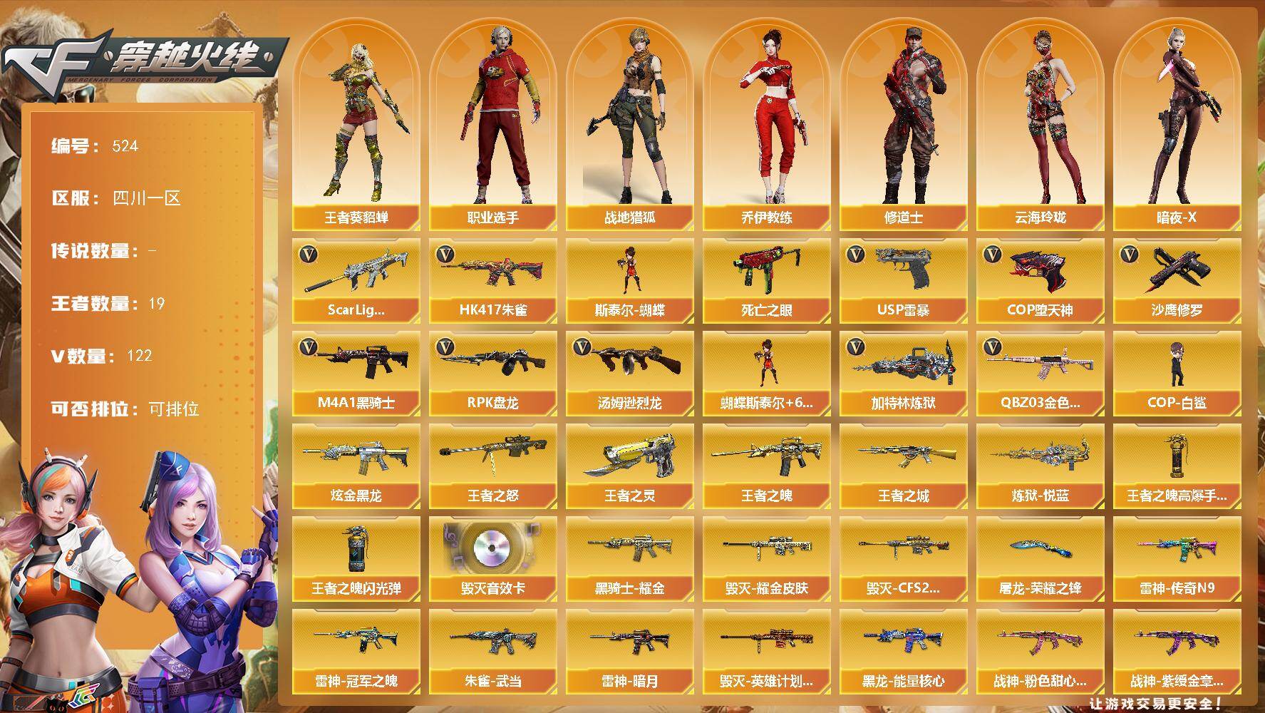 [16543312]四川一区-122V-19王者-1炫金 【热门武器】:QBZ03-金色蔷薇,Scar Light-白虎,HK417-朱雀,死亡之眼*4,M4A1-黑骑士*3,汤姆逊-烈龙*7,RPK-盘龙*6,加特林-炼狱,斯泰尔-蝴蝶,COP-白鲨,USP-雷暴,COP-堕天神,沙鹰-修罗 【王者炫金武器】:王者之城,王者之魄*3,王者之怒*2,炼狱-悦蓝*2,王者之灵*2,炫金黑龙,王者之魄高爆手雷,王者之魄闪光弹 【音效卡】:Barrett-毁灭音效卡 【皮肤】:裁决-胜者为王 皮肤,雷神-暗月,雷神-冠军之魄,雷神-传奇N9,毁灭耀金皮肤,毁灭-CFS2020,毁灭-英雄计划 皮肤,黑龙-能量核心,黑骑士耀金皮肤,HK417-朱雀-武当,战神-粉色甜心皮肤*9,战神-紫绶金章皮肤*13,战神-流金岁月皮肤*4,屠龙-荣耀之锋,龙啸-青青莓果 皮肤 【角色】:战地猎狐,王者-葵-貂蝉,乔伊教练,修道士,云海玲珑,暗夜-X,芳心审判者,嘉年华灵狐,娟娟,灵狐者-黄金海岸,潘多拉-X,潘多拉-甜心教官,蛇姬,夜玫瑰-幻能朋克,影武者-X,职业选手 【人偶武器】:COP-白鲨,斯泰尔-蝴蝶,AWM-灵狐-15周年嘉年华,迷你生化手雷,闪光弹-小乔 【暴走生化】:死亡之眼*4 【挑战大师】:神圣爆裂者III 【英雄级武器】:M4A1-千变,AK47-火麒麟,M4A1-黑龙,M4A1-雷神*3,M4A1-黑骑士*3,AK47-无影,AK47-黑武士,AK12-天启*3,AK47-黑鲨*3,M4A1-龙血*2,HK417-朱雀,Scar Light-白虎,QBZ03-金色蔷薇,王者之心-觉醒版,王者之魄-觉醒版,AK-47-猩红传说*6,AK47-B-战神,黑骑士-海王,黑武士-CF网剧冠军*2,AWM-天龙,Barrett-毁灭,AWM-裁决*2,王者幻神-觉醒版,RPK-盘龙*6,加特林-炼狱,汤姆逊-烈龙*7,AA-12-雷霆,沙鹰-修罗,沙鹰-天神*3,USP-雷暴,COP-堕天神,柯尔特-电竞装甲,柯尔特-竞技荣光*2,天神-CF网剧冠军*2,屠龙,马来剑-夜魔,擎天,幻灵之锋,擎天-竞技荣光,斩神刀-雷暴,擎天-CF网剧冠军*2,王者之啸-觉醒版,王者之刺-觉醒版,高爆手雷-雷暴*4,高爆手雷-夜魔,高爆手雷-竞技荣光*8,高爆手雷-神工天巧,闪光弹-雷暴*4,闪光弹-夜魔,