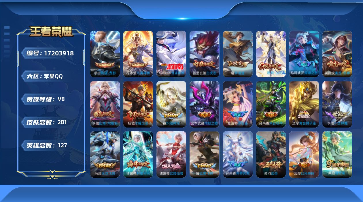 - [16398624]可二次【特价出售/店主推荐】9个银标、苹果Q-V8-至尊星耀III段位-126英雄-299皮肤-2典藏皮肤-1无双-4星传说-20传说-83史诗 【荣耀典藏】:孙悟空全息碎影,花木兰九霄神辉 【无双皮肤】:孙悟空无相 【传说皮肤】:后羿神树通天,兰陵王默契交锋,公孙离祈雪灵祝,诸葛亮时雨天司,铠绛天战甲,镜炽阳神光,虞姬启明星使,孙悟空零号赤焰,关羽武圣,曜云鹰飞将,李信一念神魔,刘备时之恋人,伽罗太华,貂蝉猫影幻舞,百里玄策白虎志,杨戬永曜之星,李白凤求凰,孙尚香末日机甲,孙悟空地狱火,吕布天魔缭乱 【限定皮肤】:姜子牙天穹之誓,狄仁杰阴阳师,赵云皇家上将,赵云龙胆,妲己时之彼端,鲁班七号狮舞东方,庄周高山流水,高渐离死亡摇滚,阿轲迷踪丽影,芈月白晶晶,吕布天魔缭乱,吕布御风骁将,周瑜赤莲之焰,元歌云间偶戏,元歌无心,夏侯惇朔风刀,甄姬游园惊梦,曹操天狼征服者,典韦穷奇,典韦岱宗,马可波罗暗影游猎,狄仁杰魔术师,狄仁杰万华元夜,达摩沙漠行僧,项羽海滩派对,项羽霸王别姬,老夫子醍醐杖,关羽武圣,程咬金演武夺筹,刘邦夺宝奇兵,韩信飞衡,王昭君凤凰于飞,兰陵王默契交锋,兰陵王驯魔猎人,花木兰默契交锋,亚瑟潮玩骑士王,孙悟空至尊宝,孙悟空大圣娶亲,孙悟空零号赤焰,牛魔奔雷神使,后羿辉光之辰,后羿如梦令,李元芳银河之约,虞姬霸王别姬,虞姬启明星使,钟馗神迹守卫,钟馗驱傩正仪,杨玉环遇见飞天,杨戬永曜之星,雅典娜单词大作战,雅典娜黎明之约,蔡文姬繁星吟游,鬼谷子原初探秘者,诸葛亮时雨天司,黄忠烈魂,苏烈千军破阵,百里玄策白虎志,百里玄策原初追逐者,百里守约朱雀志,弈星混沌棋,公孙离祈雪灵祝,沈梦溪星空之诺,明世隐疑决卦,裴擒虎李小龙,裴擒虎擒涛扼浪,狂铁御狮,米莱狄御霄,云中君纤云弄巧,伽罗太华,盾山御銮,猪八戒西部大镖客,上官婉儿梁祝,上官婉儿天狼绘梦者,嫦娥如梦令,蒙犽狂想玩偶喵,鲁班大师探海日志,艾琳女武神,张良古海寻踪,蒙犽百解令,鬼谷子天穹祈灯,沈梦溪龙舞盛年,刘邦剑破天穹,程咬金群星魔术团,周瑜熔金海岸 【年限皮肤】:王昭君凤凰于飞,李白凤求凰,杨戬永曜之星,后羿辉光之辰,百里玄策白虎志,百里守约朱雀志,伽罗太华,典韦岱宗,韩信飞衡,公孙离祈雪灵祝,诸葛亮时雨天司,吕布御风骁将,牛魔奔雷神使 【赛季限定】:典韦穷奇,狂铁御狮,米莱狄御霄,盾山御銮,夏侯惇朔风刀,