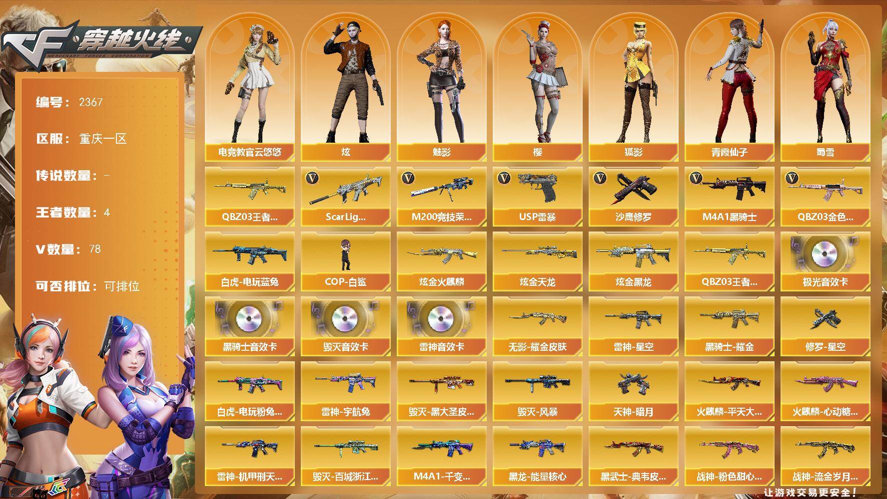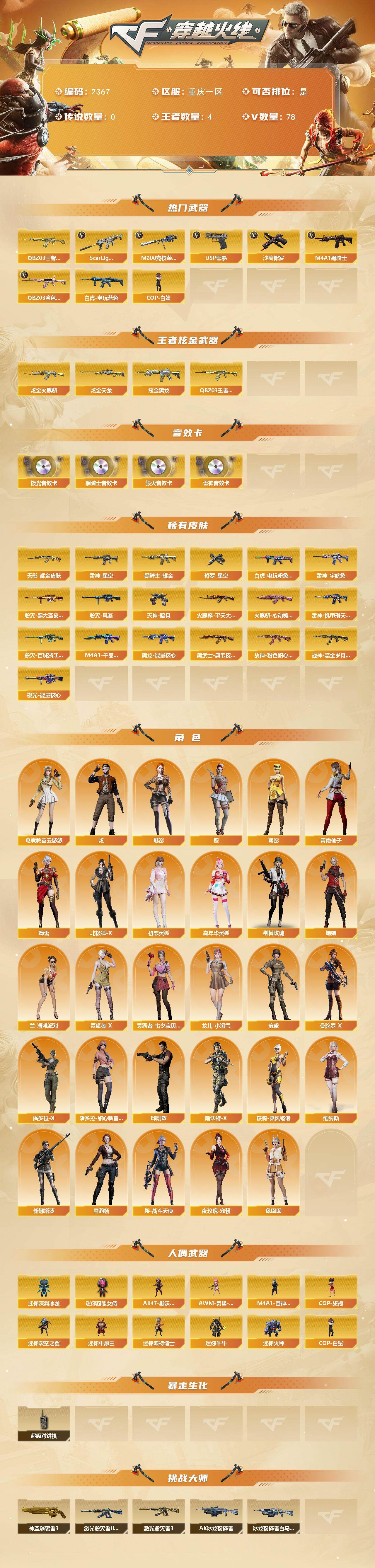 [17204453]重庆一区-81V-4王者武器数-5炫金武器数 【热门武器】:QBZ03-金色蔷薇,Scar Light-白虎,QBZ-03-王者蔷薇,M200-竞技荣光,白虎-电玩蓝兔,M4A1-黑骑士,COP-白鲨,USP-雷暴,沙鹰-修罗 【王者炫金武器】:QBZ-03-王者蔷薇,炫金火麒麟,炫金黑龙,炫金天龙*3 【音效卡】:M4A1-雷神音效卡,M4A1-黑骑士音效卡,Barrett-毁灭音效卡,Barrett-极光音效卡 【皮肤】:白虎-电玩粉兔皮肤,雷神-星空,雷神-机甲刑天皮肤,雷神-宇航兔皮肤,火麒麟-平天大圣,火麒麟-心动糖果,毁灭-黑大圣皮肤,毁灭-风暴,毁灭-百城浙江 皮肤,M4A1-千变-孔明皮肤,黑龙-能量核心,黑骑士耀金皮肤,无影耀金皮肤,黑武士-典韦皮肤,战神-粉色甜心皮肤,战神-流金岁月皮肤,极光-能量核心,修罗-星空,天神-暗月 【角色】:樱,魅影,炫,电竞教官-云悠悠,狐影,北极狐-X,初恋灵狐,嘉年华灵狐,荆棘玫瑰,娟娟,兰-海滩派对,灵狐者-X,灵狐者-七夕宝贝,龙儿-小淘气,麻雀,曼陀罗-X,潘多拉-X,潘多拉-甜心教官,邱刚敖,青霞仙子,斯沃特-X,蜀雪,铁骑-乘风破浪,兔囡囡,维纳斯,新娜塔莎,雪莉杨,夜玫瑰-宠粉,樱-战斗天使 【人偶武器】:COP-白鲨,M4A1-雷神-精英刀锋,AWM-灵狐-15周年嘉年华,COP-旗袍,迷你深渊冰龙*2,迷你裂空之翼,迷你牛魔王,迷你波特博士,迷你牛牛*2,迷你火种,AK47-斯沃特,迷你超能女侍 【暴走生化】:超级对讲机 【挑战大师】:神圣爆裂者III,AK47-冰龙粉碎者,冰龙粉碎者-白马银枪,激光毁灭者III-白马银枪*2,激光毁灭者III 【英雄级武器】:AK47-火麒麟*2,M4A1-黑龙,M4A1-雷神,M4A1-黑骑士,AK47-无影,M4A1-死神,AK47-黑武士,AK12-天启*2,M4A1-龙血,Scar Light-白虎,无影-神兵利器,黑武士-锦绣游龙,M4A1-玫瑰精灵,QBZ03-金色蔷薇,9A91-烈火,王者之影-觉醒版,王者之魄-觉醒版,AK-47-猩红传说,黑骑士-海王,白虎-电玩蓝兔,AWM-天龙,Barrett-毁灭*2,Barrett-极光*2,M200-竞技荣光,王者之力-觉醒版,沙鹰-修罗,沙鹰-天神*3,USP-雷暴,柯尔特-竞技荣光,屠龙,龙啸,