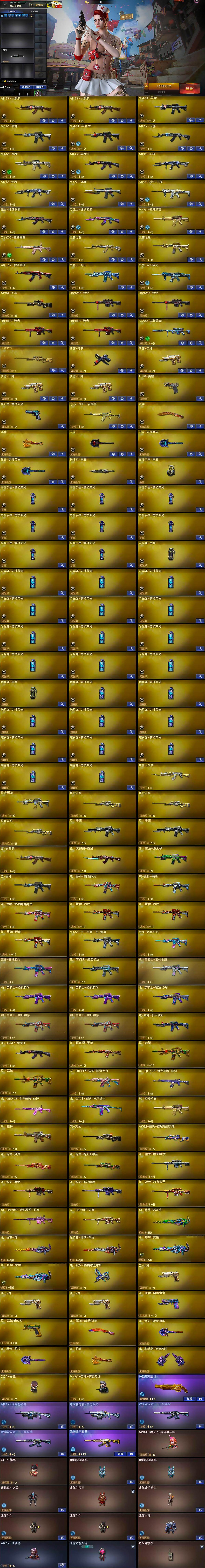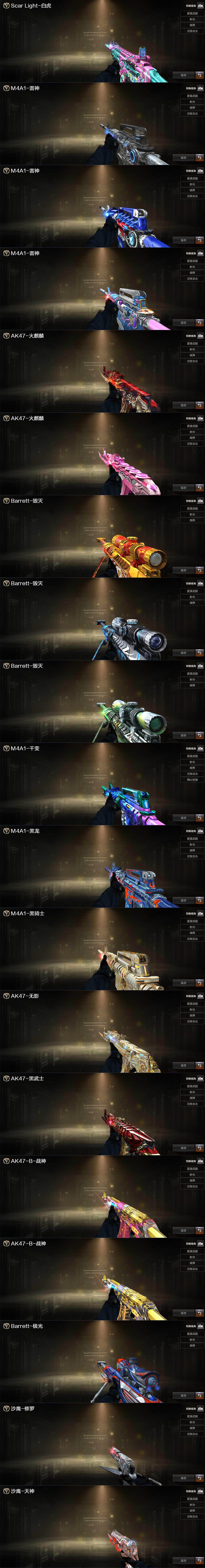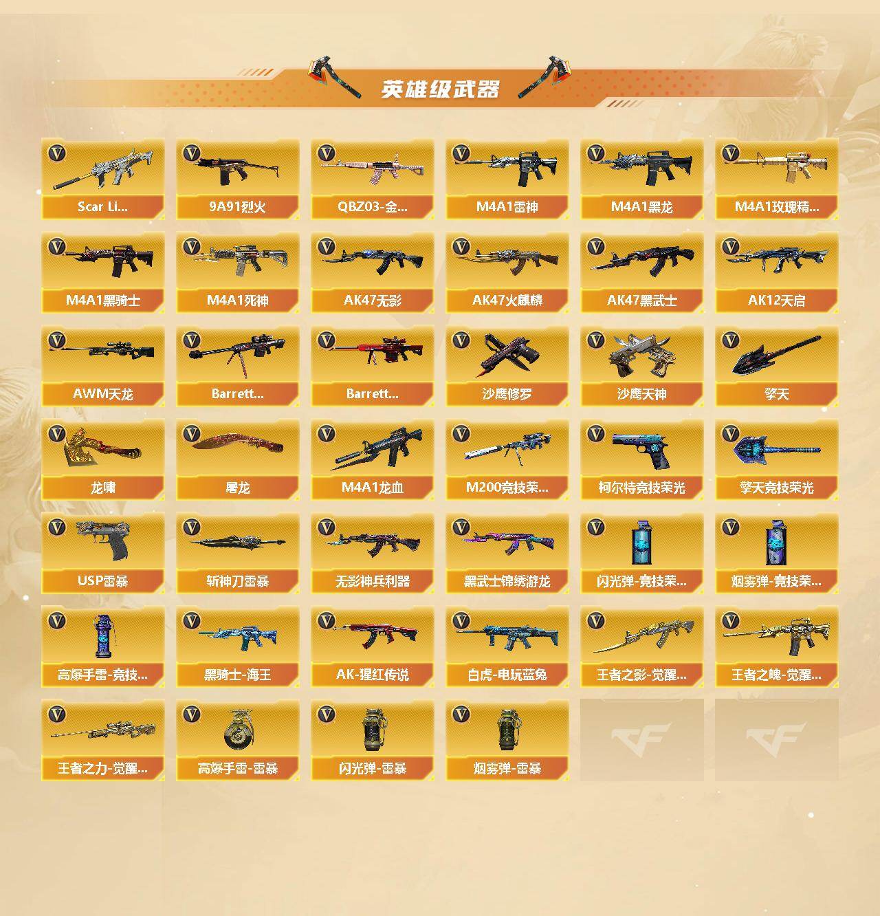 【英雄级武器】:AK47-火麒麟*2,M4A1-黑龙,M4A1-雷神,M4A1-黑骑士,AK47-无影,M4A1-死神,AK47-黑武士,AK12-天启*2,M4A1-龙血,Scar Light-白虎,无影-神兵利器,黑武士-锦绣游龙,M4A1-玫瑰精灵,QBZ03-金色蔷薇,9A91-烈火,王者之影-觉醒版,王者之魄-觉醒版,AK-47-猩红传说,黑骑士-海王,白虎-电玩蓝兔,AWM-天龙,Barrett-毁灭*2,Barrett-极光*2,M200-竞技荣光,王者之力-觉醒版,沙鹰-修罗,沙鹰-天神*3,USP-雷暴,柯尔特-竞技荣光,屠龙,龙啸,
