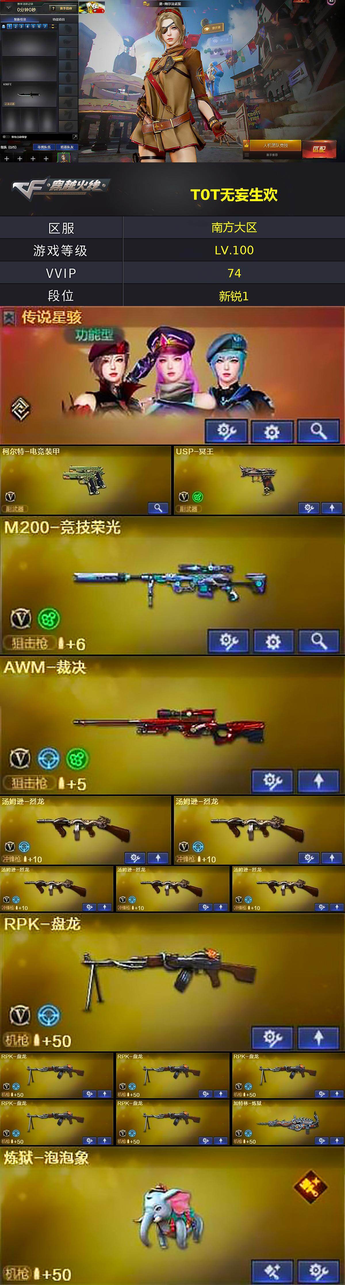 [17204591]南方大区-74V-0王者武器数-0炫金武器数 【传说角色】:传说星骇 【热门武器】:M200-竞技荣光,M4A1-黑骑士*6,汤姆逊-烈龙*5,RPK-盘龙*6,加特林-炼狱,炼狱-泡泡象,沙鹰-修罗*4 【皮肤】:炼狱-泡泡象,轻型军用手斧-再燃火线 【角色】:沙漠玫瑰,谜,荆棘,零·纪元,王者葵-惊若翩鸿,葵-阿尔法武装,风暴女,嘉年华灵狐,灵狐者-X,潜龙队-X,斯沃特-X,维纳斯 【人偶武器】:异变清道夫-蛇影双骄*2,AWM-灵狐-15周年嘉年华,迷你深渊冰龙,迷你裂空之翼,迷你波特博士,迷你曼提柯尔,迷你火种,迷你生化手雷,生化手雷-机甲核心 【暴走生化】:双面神,超级对讲机 【挑战大师】:激光毁灭者III,试炼破坏者III,KAC-圣炎切割者III,神圣爆裂者-末日III 【英雄级武器】:AK47-火麒麟,M4A1-黑骑士*6,无影-神兵利器,AWM-裁决,Barrett-电竞装甲,M200-竞技荣光,RPK-盘龙*6,加特林-炼狱,汤姆逊-烈龙*5,沙鹰-修罗*4,柯尔特-电竞装甲,USP-冥王,擎天,擎天-竞技荣光,尼泊尔-电竞装甲*2,麒麟刺-百战金芒,丛林匕首-玄豹,高爆手雷-竞技荣光,高爆手雷-玄豹*2,闪光弹-竞技荣光,闪光弹-玄豹,烟雾弹-竞技荣光,烟雾弹-玄豹*3,Barrett-碧霄极光 【道具】:云山科技背包,冰冰企鹅背包-猛男专用,女皇终结者-背包,次元之矛-黄金背包,次元之矛-背包,沙漠龙背包-猛男专属,百战金芒炫彩背包,圣拳猎手-炽雪,女皇终结者-魔龙之吻,救世主-黑桃战神,绿色巨人,灵魂忍者*2,变异宝贝,迷雾幽灵*2,夺命之镰,防化服*3,流光-鎏金之域,萌萌小葵表情,炽雪表情,防弹头盔*3,防弹衣*4,C4工具钳*4,手雷包*4 【特殊枪械】:6黑骑士,5烈龙,6盘龙,1炼狱