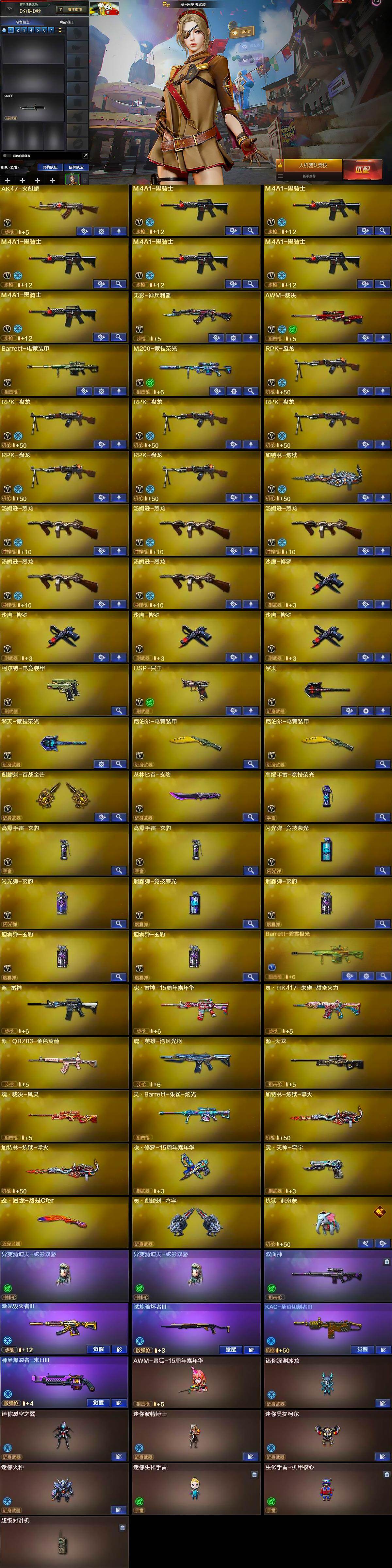 【热门武器】:M200-竞技荣光,M4A1-黑骑士*6,汤姆逊-烈龙*5,RPK-盘龙*6,加特林-炼狱,炼狱-泡泡象,沙鹰-修罗*4