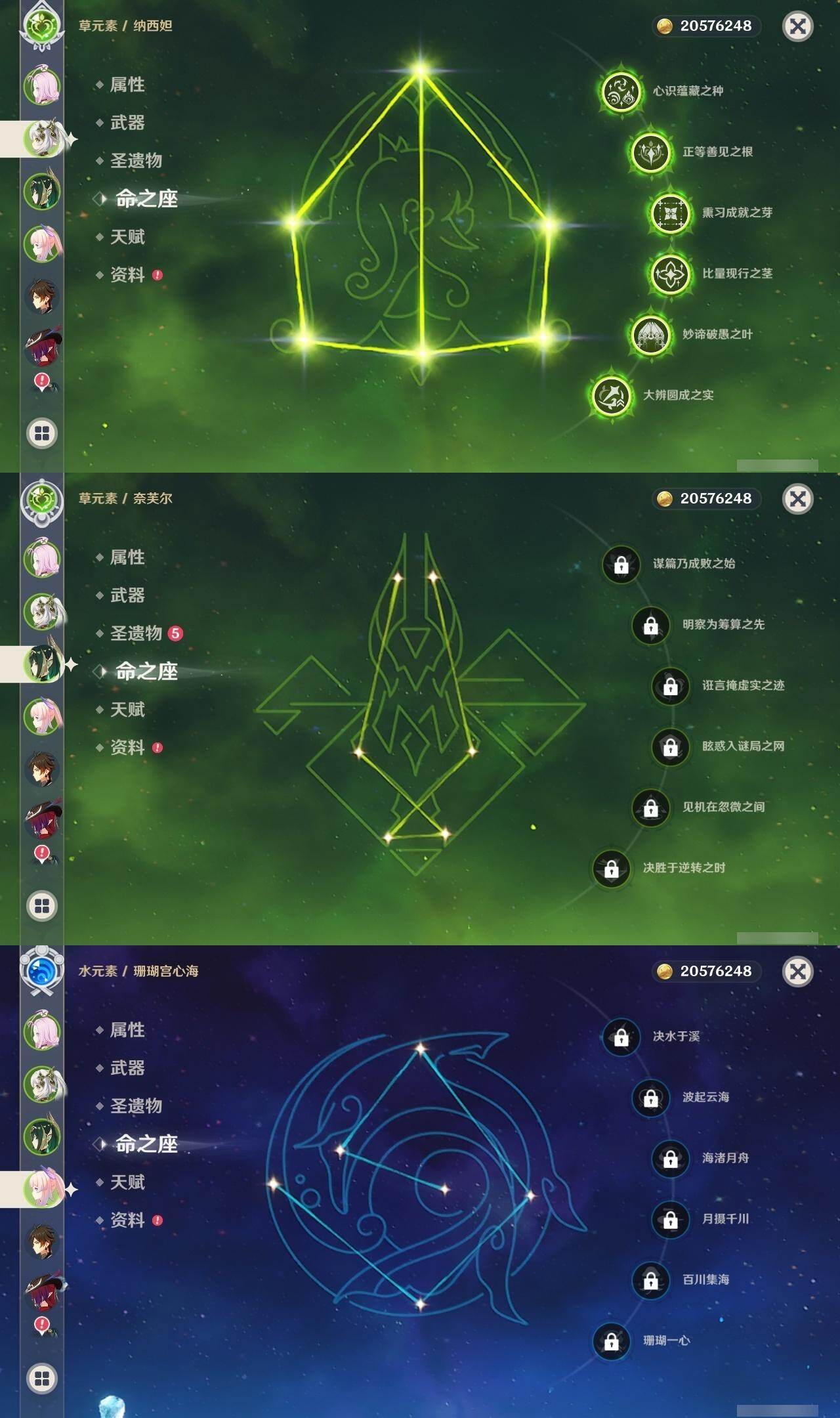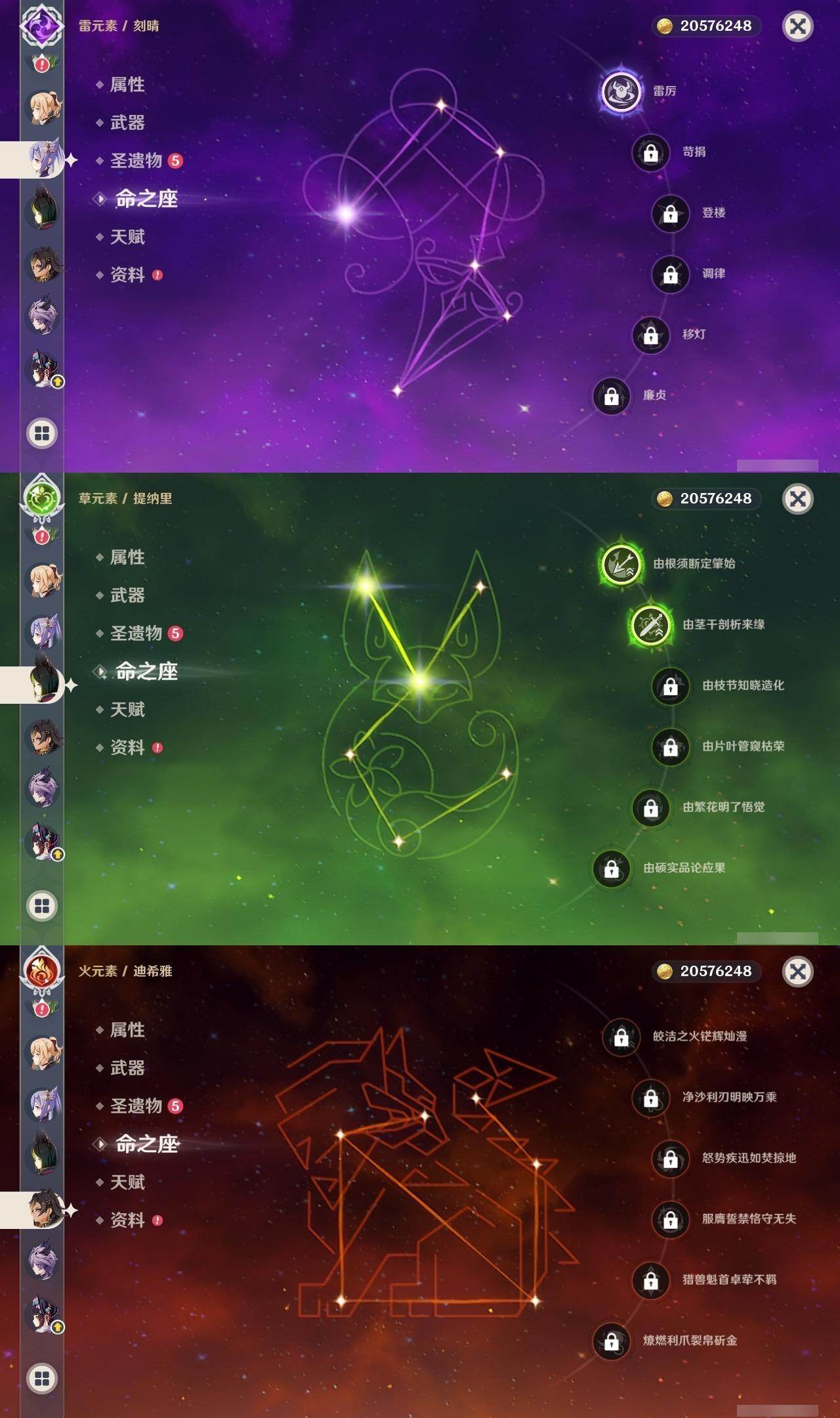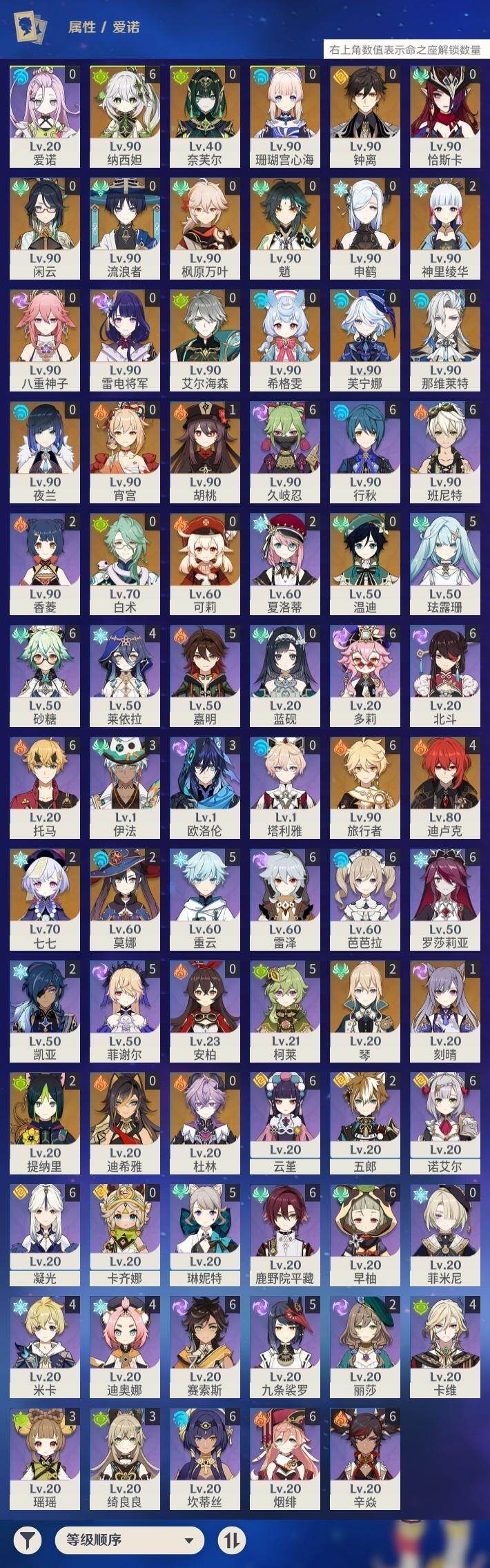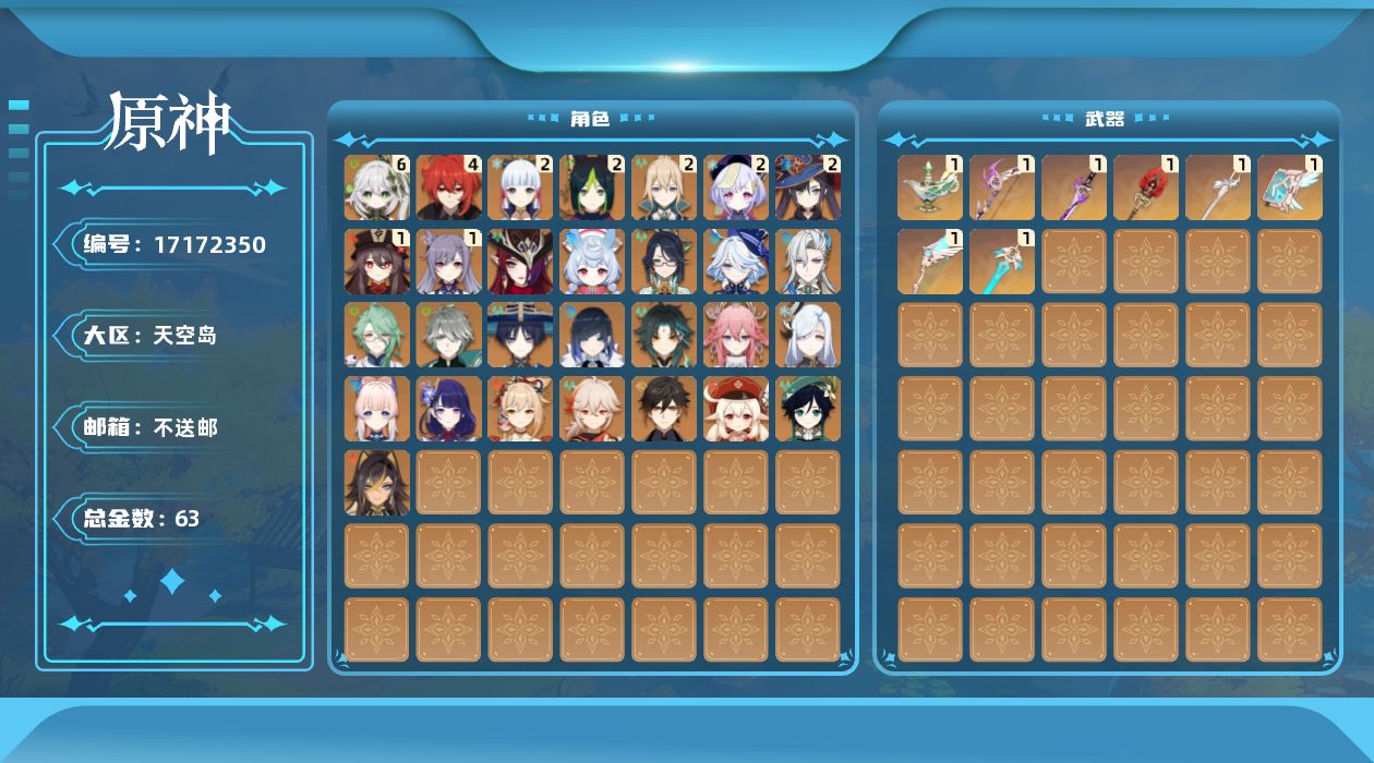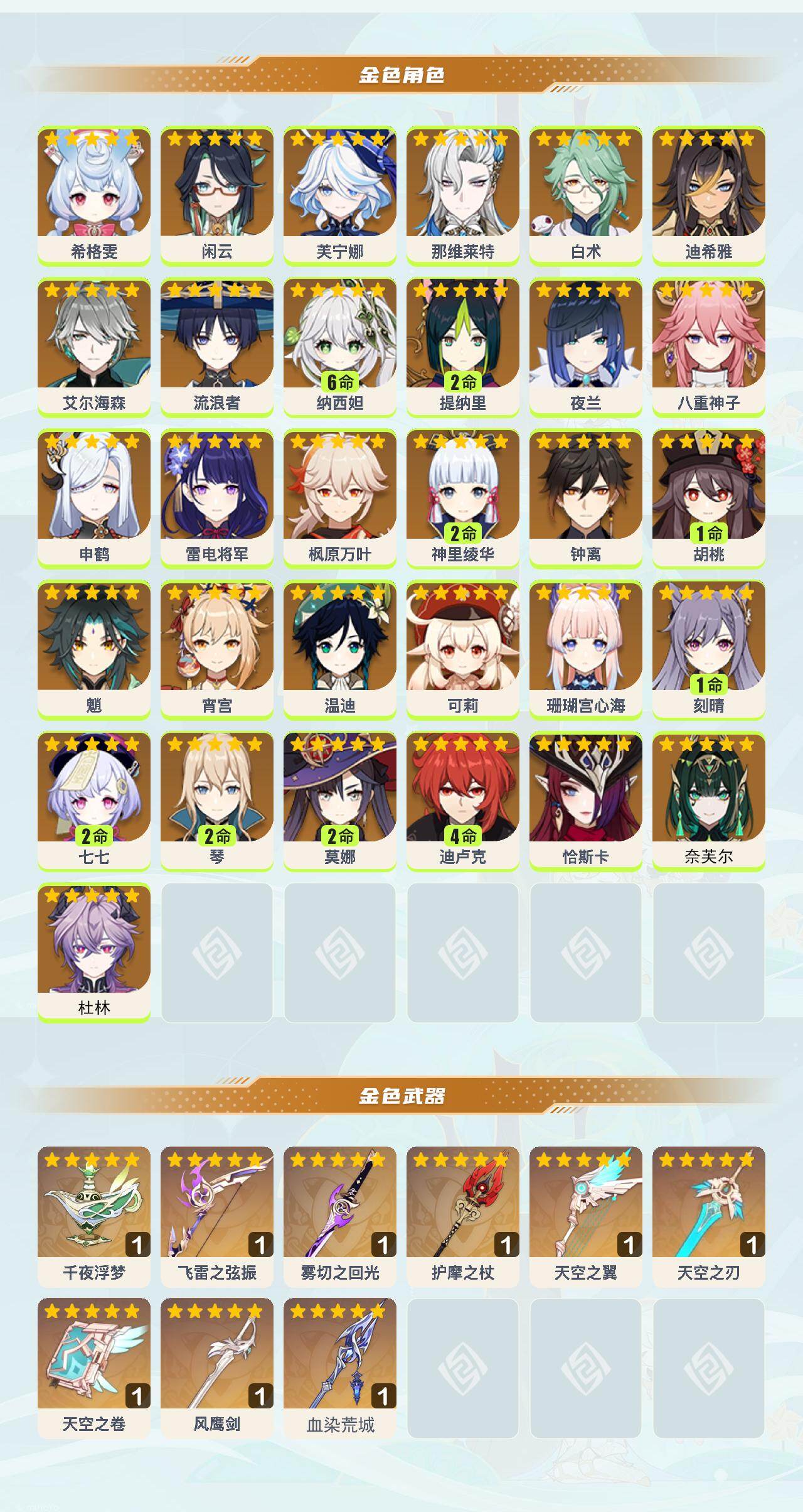 0命希格雯,0命闲云,0命芙宁娜,0命那维莱特,0命白术,0命迪希雅,0命艾尔海森,0命流浪者,满命纳西妲,2命提纳里,0命夜兰,0命八重神子,0命申鹤,0命雷电将军,0命枫原万叶,2命神里绫华,0命钟离,1命胡桃,0命魈,0命宵宫,0命温迪,0命可莉,0命珊瑚宫心海,1命刻晴,2命七七,2命琴,2命莫娜,4命迪卢克,0命恰斯卡,0命奈芙尔,0命杜林,精1千夜浮梦,精1飞雷之弦振,精1雾切之回光,精1护摩之杖,精1天空之翼,精1天空之刃,精1天空之卷,精1风鹰剑,精1血染荒城