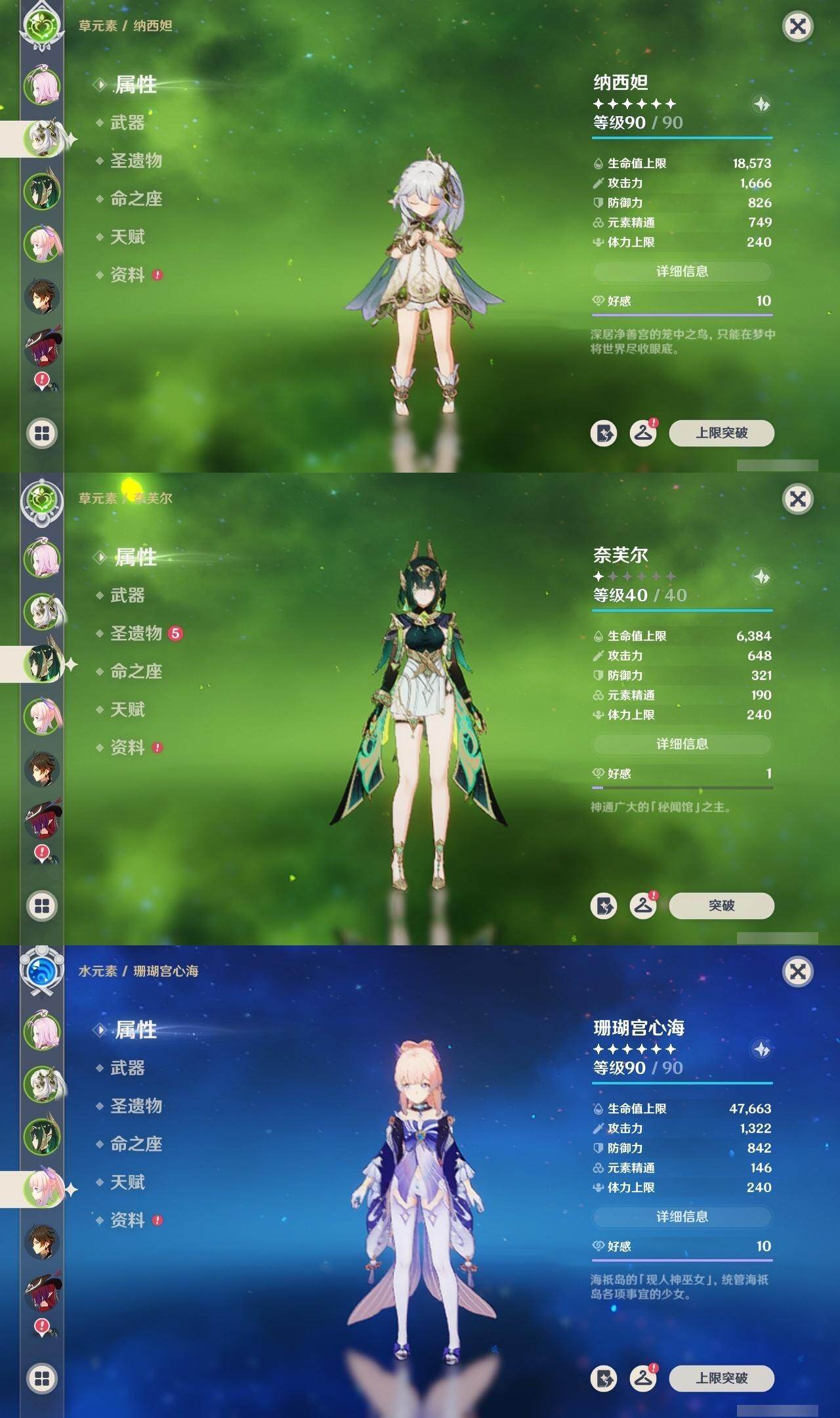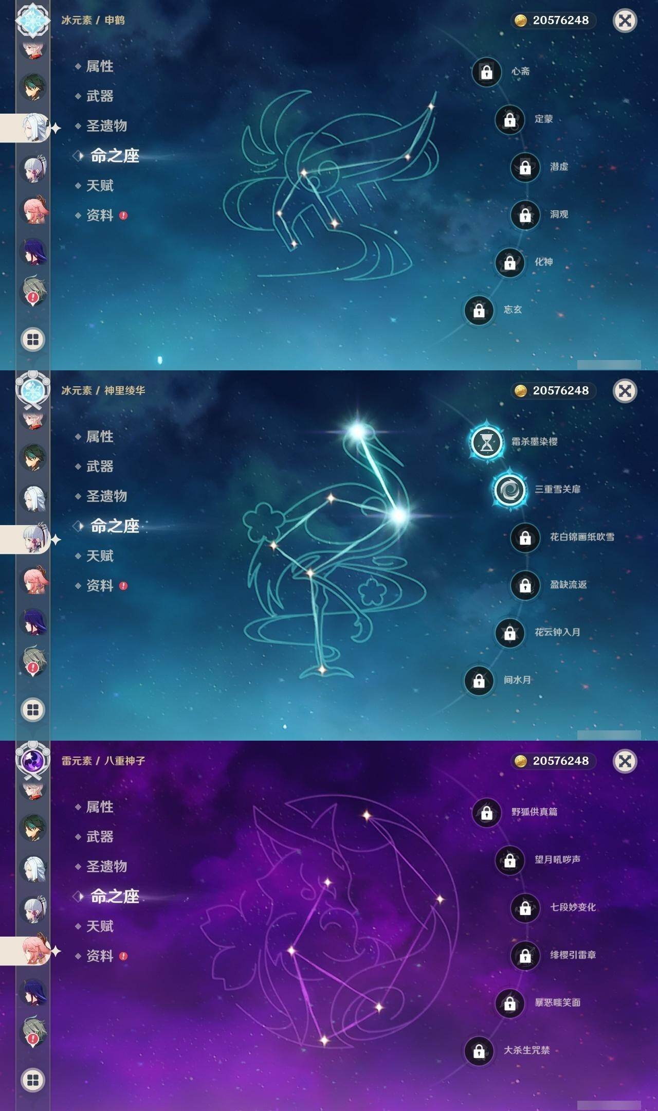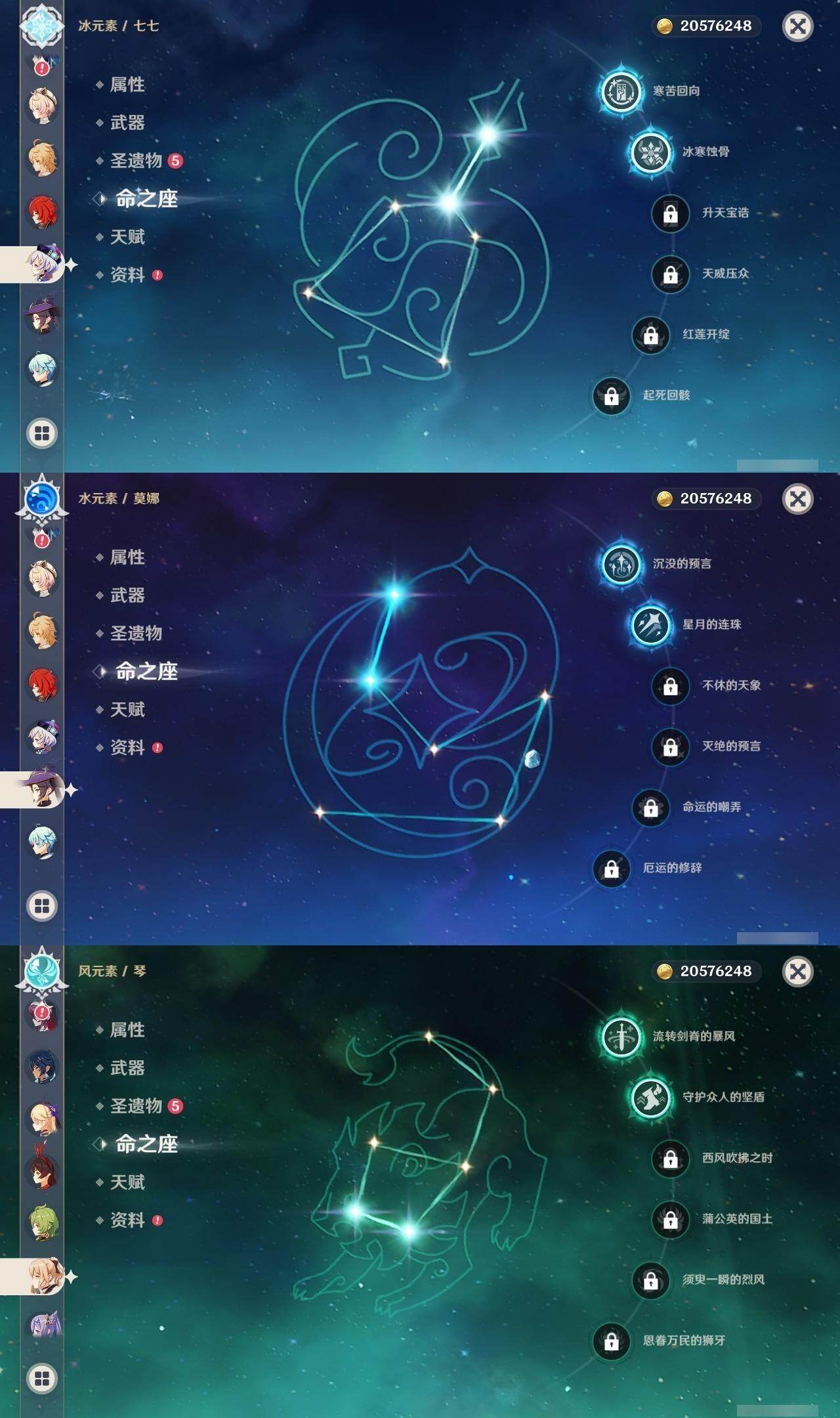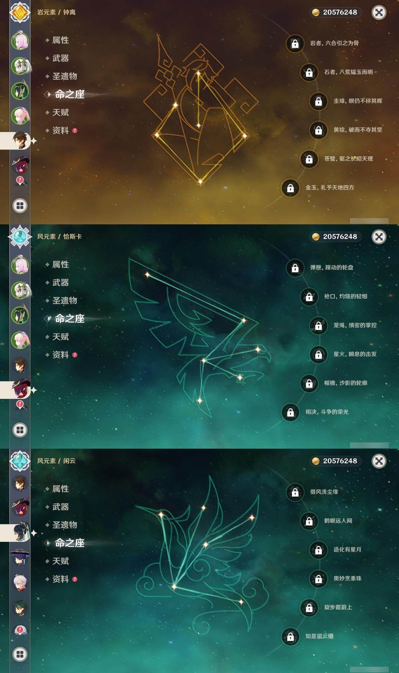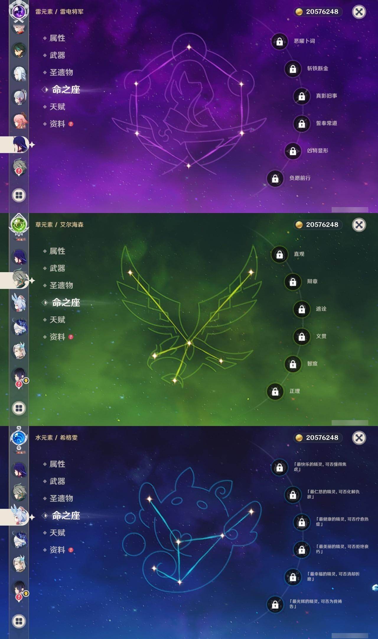 0命希格雯,0命闲云,0命芙宁娜,0命那维莱特,0命白术,0命迪希雅,0命艾尔海森,0命流浪者,满命纳西妲,2命提纳里,0命夜兰,0命八重神子,0命申鹤,0命雷电将军,0命枫原万叶,2命神里绫华,0命钟离,1命胡桃,0命魈,0命宵宫,0命温迪,0命可莉,0命珊瑚宫心海,1命刻晴,2命七七,2命琴,2命莫娜,4命迪卢克,0命恰斯卡,0命奈芙尔,0命杜林,精1千夜浮梦,精1飞雷之弦振,精1雾切之回光,精1护摩之杖,精1天空之翼,精1天空之刃,精1天空之卷,精1风鹰剑,精1血染荒城