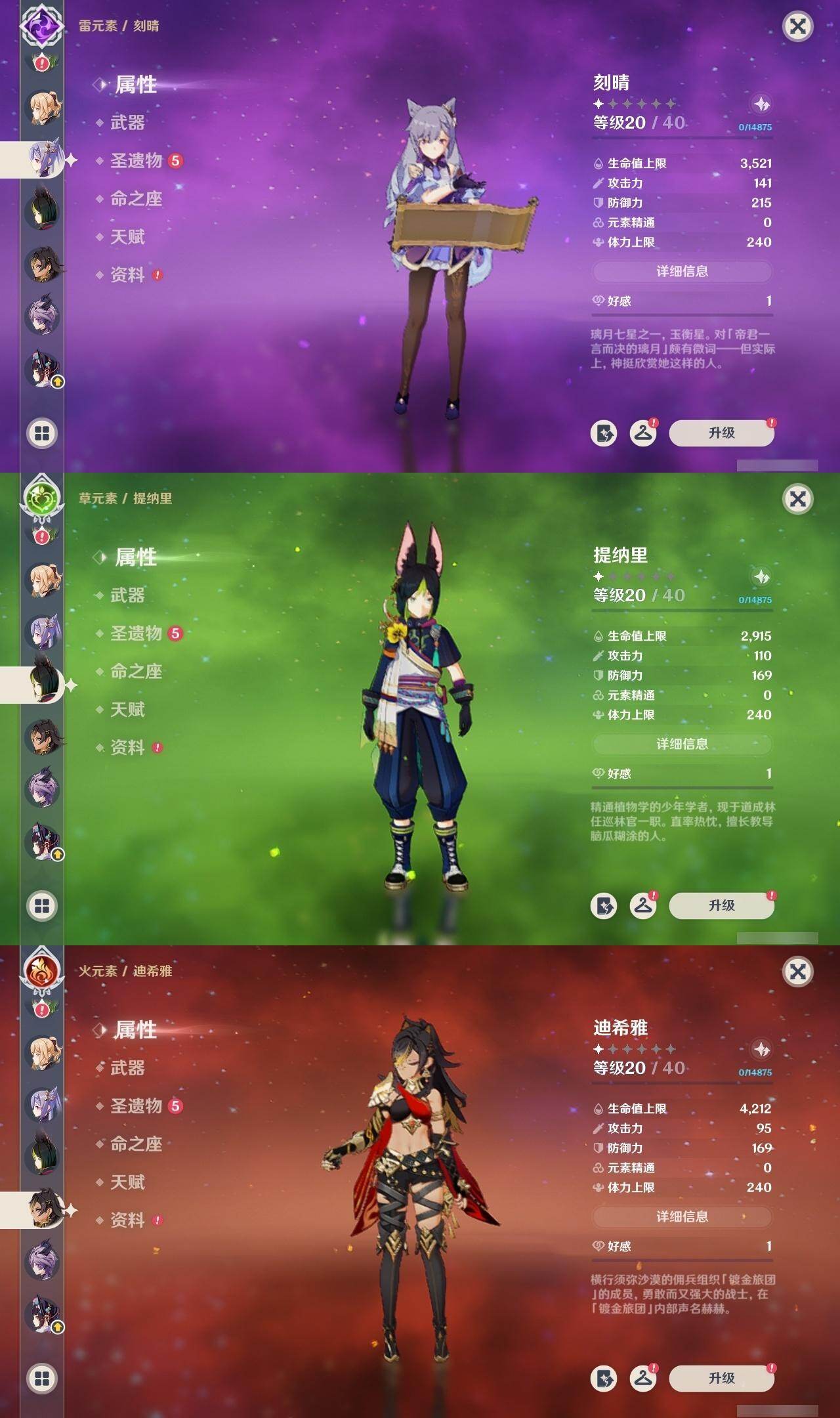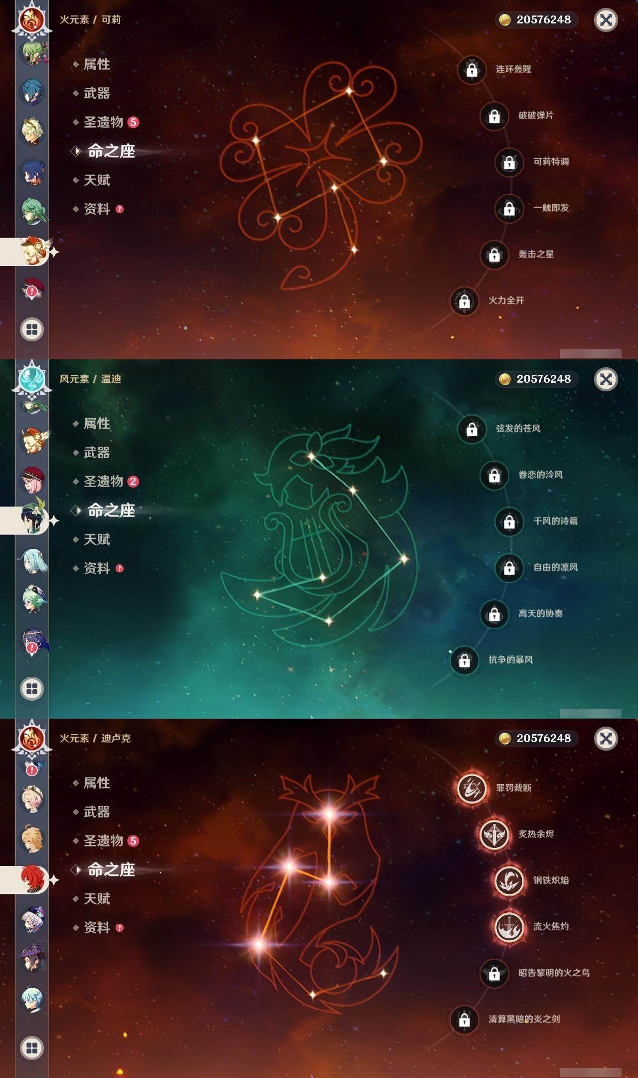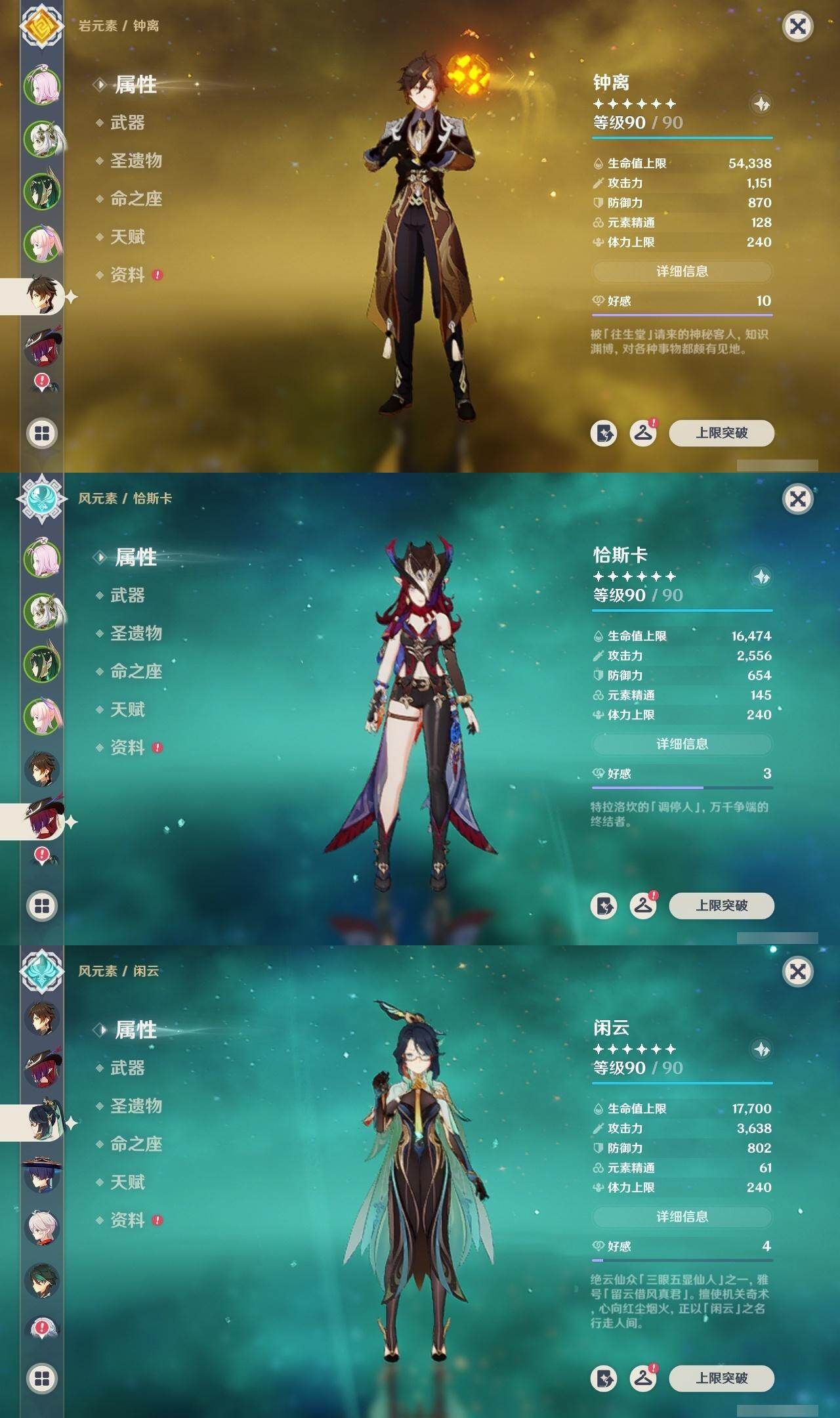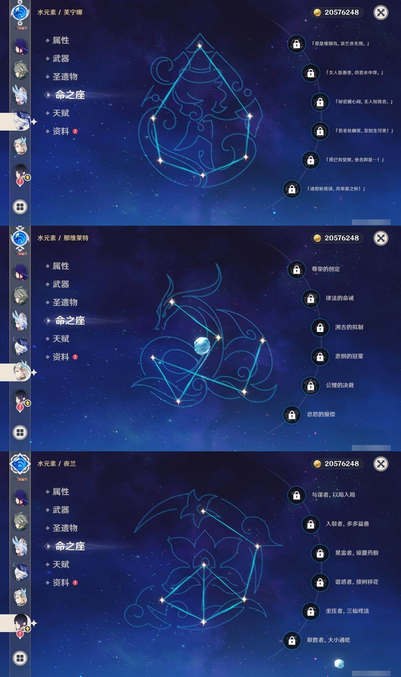 0命希格雯,0命闲云,0命芙宁娜,0命那维莱特,0命白术,0命迪希雅,0命艾尔海森,0命流浪者,满命纳西妲,2命提纳里,0命夜兰,0命八重神子,0命申鹤,0命雷电将军,0命枫原万叶,2命神里绫华,0命钟离,1命胡桃,0命魈,0命宵宫,0命温迪,0命可莉,0命珊瑚宫心海,1命刻晴,2命七七,2命琴,2命莫娜,4命迪卢克,0命恰斯卡,0命奈芙尔,0命杜林,精1千夜浮梦,精1飞雷之弦振,精1雾切之回光,精1护摩之杖,精1天空之翼,精1天空之刃,精1天空之卷,精1风鹰剑,精1血染荒城