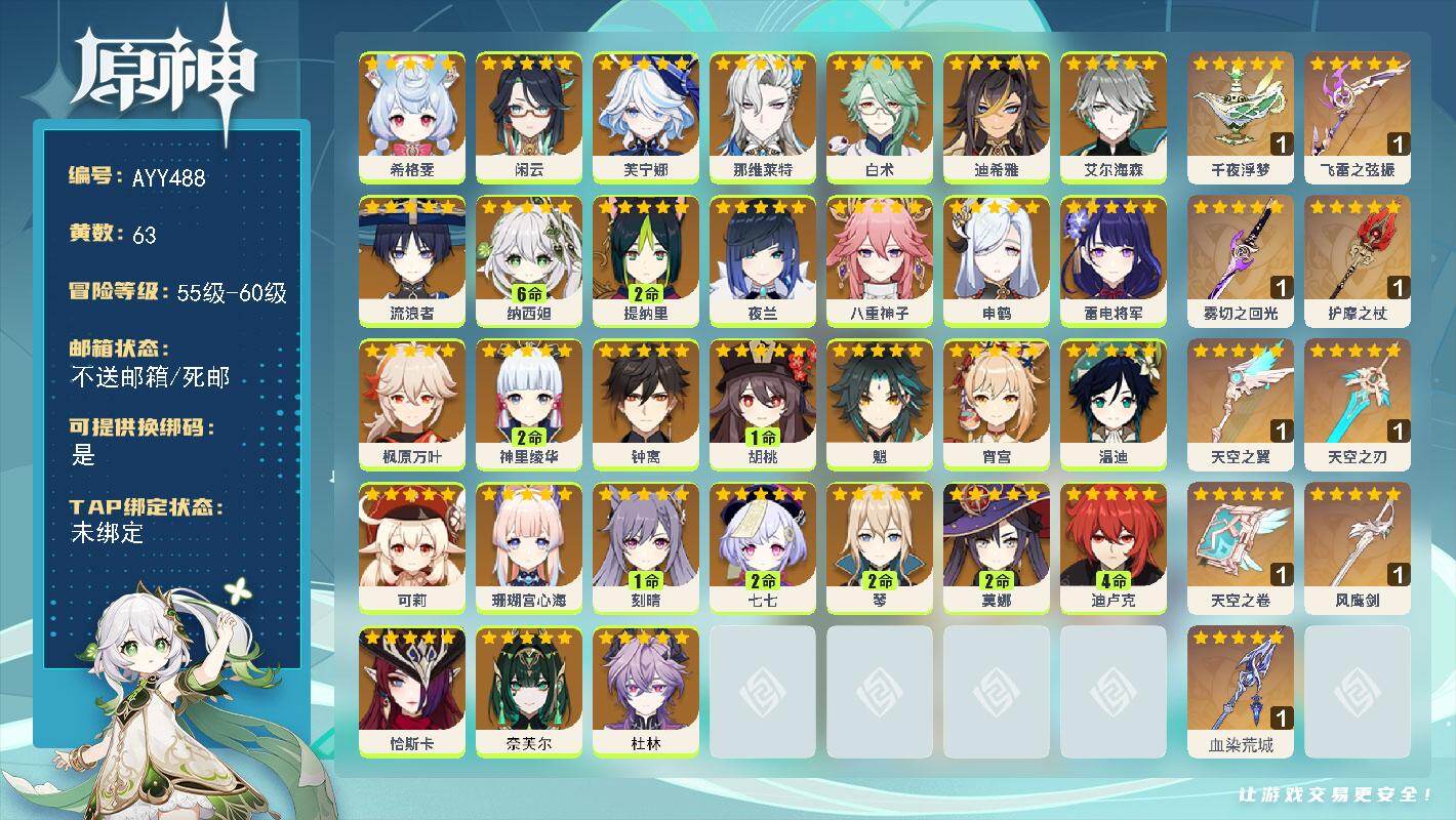 [17172350]【店主推荐捡漏号】60级/63黄/男主/31个五星角色/10个五星武器 0命希格雯,0命闲云,0命芙宁娜,0命那维莱特,0命白术,0命迪希雅,0命艾尔海森,0命流浪者,满命纳西妲,2命提纳里,0命夜兰,0命八重神子,0命申鹤,0命雷电将军,0命枫原万叶,2命神里绫华,0命钟离,1命胡桃,0命魈,0命宵宫,0命温迪,0命可莉,0命珊瑚宫心海,1命刻晴,2命七七,2命琴,2命莫娜,4命迪卢克,0命恰斯卡,0命奈芙尔,0命杜林,精1千夜浮梦,精1飞雷之弦振,精1雾切之回光,精1护摩之杖,精1天空之翼,精1天空之刃,精1天空之卷,精1风鹰剑,精1血染荒城