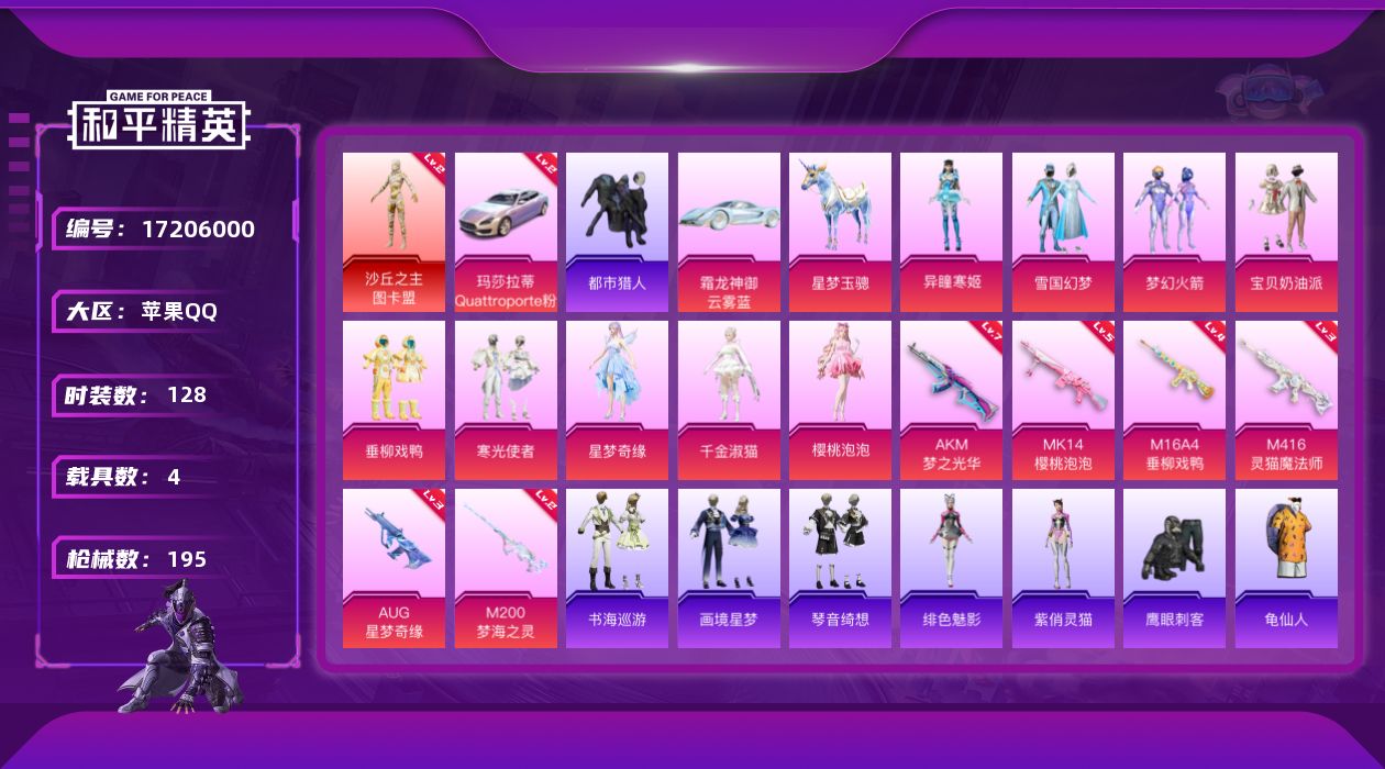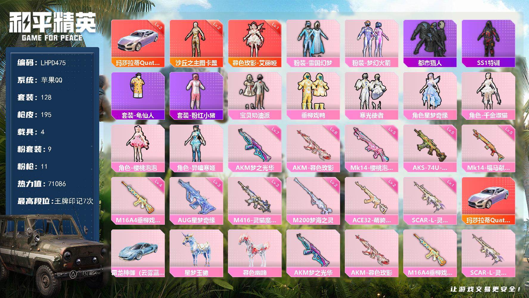 [17206000]【特价出售/店主推荐】苹果 手Q-2神装-9粉装-11特效枪-4载具-8粉色飞行器-71086热力值-7王牌印记-128套装-195枪皮【红色载具】:玛莎拉蒂Quattroporte(幻星粉)(二级)【红色神装等级】:暮色玫影-艾丽娅(一级),沙丘之主-图卡盟(二级)【红色角色神装】:暮色玫影-艾丽娅,沙丘之主-图卡盟【热门品类】:粉装-雪国幻梦,粉装-梦幻火箭,套装-都市猎人,套装-SS1特训,套装-龟仙人,套装-粉红小猪【粉色套装】:粉装-宝贝奶油派,粉装-雪国幻梦,粉装-梦幻火箭,粉装-垂柳戏鸭,粉装-寒光使者,角色-星梦奇缘,角色-千金淑猫,角色-樱桃泡泡,角色-异瞳寒姬【粉色枪皮等级】:AKM-梦之光华(七级),AKM-暮色玫影(六级),M16A4-垂柳戏鸭(四级),SCAR-L-灵驹仙姬(一级),M416-灵猫魔法师(三级),AUG-星梦奇缘(三级),ACE32-萌骑漫游(二级),AKS-74U-森灵之息(五级),Mk14-樱桃泡泡(五级),Mk14-福马献瑞(五级),M200-梦海之灵(二级)【粉色载具】:玛莎拉蒂Quattroporte(幻星粉),霜龙神御(云雾蓝),星梦玉骢,暮色幽蹄【粉色枪皮】:AKM-梦之光华,AKM-暮色玫影,M16A4-垂柳戏鸭,SCAR-L-灵驹仙姬,M416-灵猫魔法师,AUG-星梦奇缘,ACE32-萌骑漫游,AKS-74U-森灵之息,Mk14-樱桃泡泡,Mk14-福马献瑞,M200-梦海之灵【粉色飞行器】:香车宝马飞行器,梦之光华飞行器,闪光银龙飞行器,沙丘之主天马,幻海精灵飞行器,暮色之舞飞行器,云梦轻舟飞行器