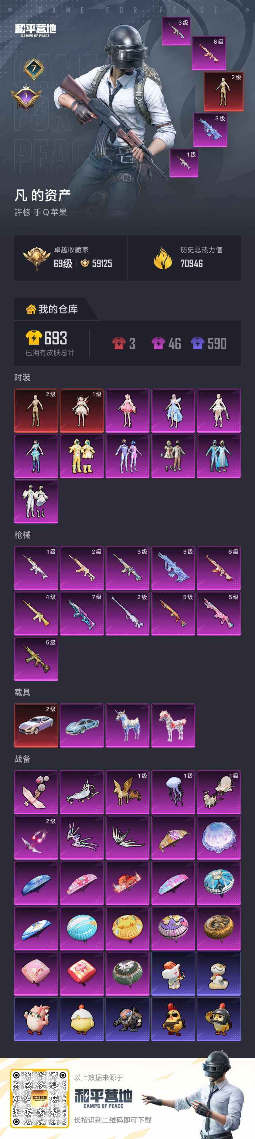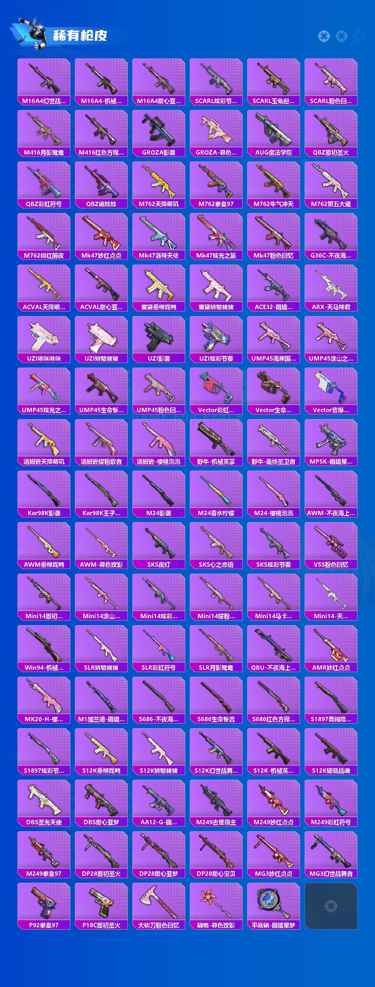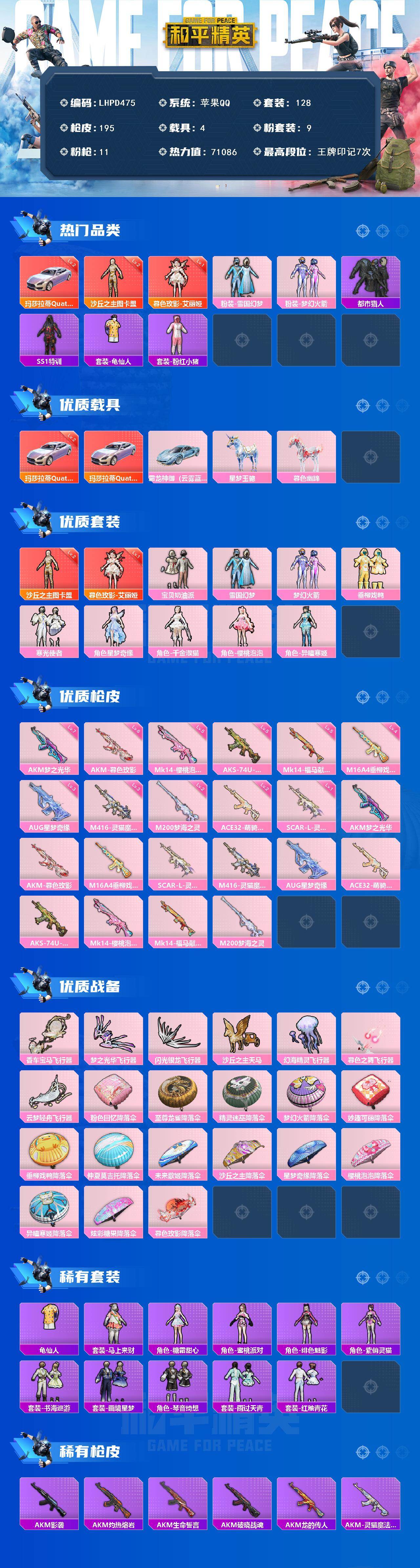 - [14894611]苹果 手Q-1粉装-4特效枪-0载具-1粉色飞行器-56371热力值-18王牌印记-170套装-201枪皮 【热门品类】:绝对防御上衣,套装-浪漫天命,套装-奇异狩猎者,套装-龟仙人 【粉色套装】:粉装-星穹咏叹调 【粉色枪皮等级】:AKM-绿萝繁花(五级),Kar98K-巳巳如意(五级),Mk14-甜梦熊击(五级),DP-28-豹影疾电(五级) 【粉色枪皮】:AKM-绿萝繁花,Kar98K-巳巳如意,Mk14-甜梦熊击,DP-28-豹影疾电 【粉色降落伞】:环太平洋降落伞,仲夏莫吉托降落伞,星穹咏叹调降落伞 【稀有套装】:套装-龟仙人,套装-巳巳如意,角色-光矢逐梦,套装-紫幽梦,套装-蓝冰羽,套装-星影赞美诗,套装-云朵鹅,套装-雪绒豹,套装-朱霞炽焰,套装-凌霄紫焰,角色-绯色魅影,套装-炫彩糖果 【稀有枪皮】:AUG-冰晶雪宝,AKM-彩虹符号,AKM-影袭,AKM-环太平洋,AKM-破晓战魂,AKM-虎虎生威,AKM-霓虹街区,AKM-龙的传人,M16A4-幻世战舞者,M16A4-甜心亚梦,M16A4-红色方程式,M16A4-蓝色火焰,SCAR-L-夜灯,SCAR-L-玉兔迎春,SCAR-L-红色方程式,M416-夜灯,M416-糯团青竹,M416-红色方程式,M416-绯红前夜,M416-蓝色火焰,GROZA-异彩先驱,GROZA-影袭,GROZA-懵萌河马,GROZA-田园牧歌,AUG-天降萌叽,AUG-怪笑疯兔,AUG-耀粉歌者,QBZ-飞驰魅影,M762-天降萌叽,M762-彩虹符号,M762-暗夜鎏金,M762-瑞龙福将,M762-绯红前夜,M762-云朵鹅,Mk47-妙红点点,G36C-懵萌河马,G36C-星穹咏叹调,AC-VAL-甜心亚梦,蜜獾-天降萌叽,蜜獾-娇憨猪猪,蜜獾-绯穹魔姬,ARX-凌霄紫焰,UZI-啾咪啾咪,UZI-天降萌叽,UZI-娇憨猪猪,UZI-炫彩节奏,UZI-红色方程式,UMP45-夜灯,UMP45-快乐主宰,UMP45-海渊国主,UMP45-涂山之恋,UMP45-蓝色火焰,Vector-生命誓言,Vector-田园牧歌,汤姆逊-天降萌叽,汤姆逊-异彩先驱,汤姆逊-耀粉歌者,MP5K-异彩先驱,AKS-74U-鬼刀,JS9-凌霄紫焰,P90-飞驰魅影,P90-巳巳如意,Kar98K-彩虹符号,Kar98K-炫彩节奏,
