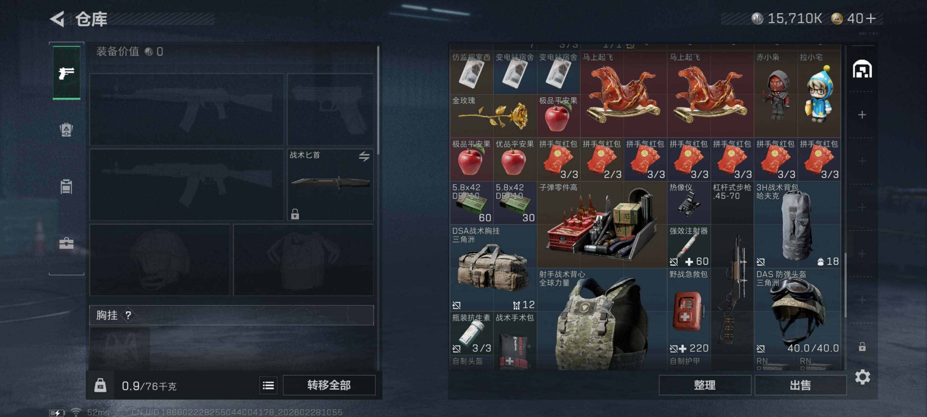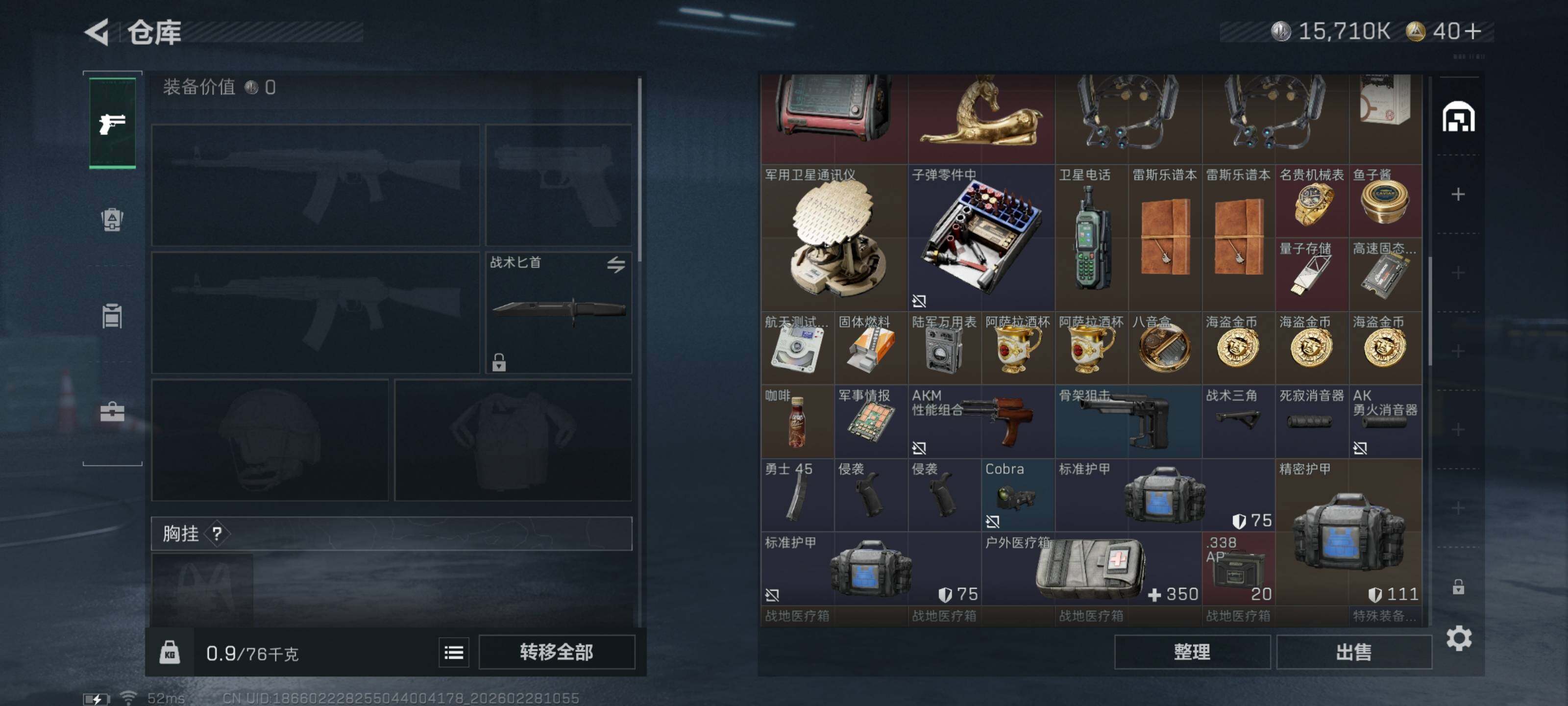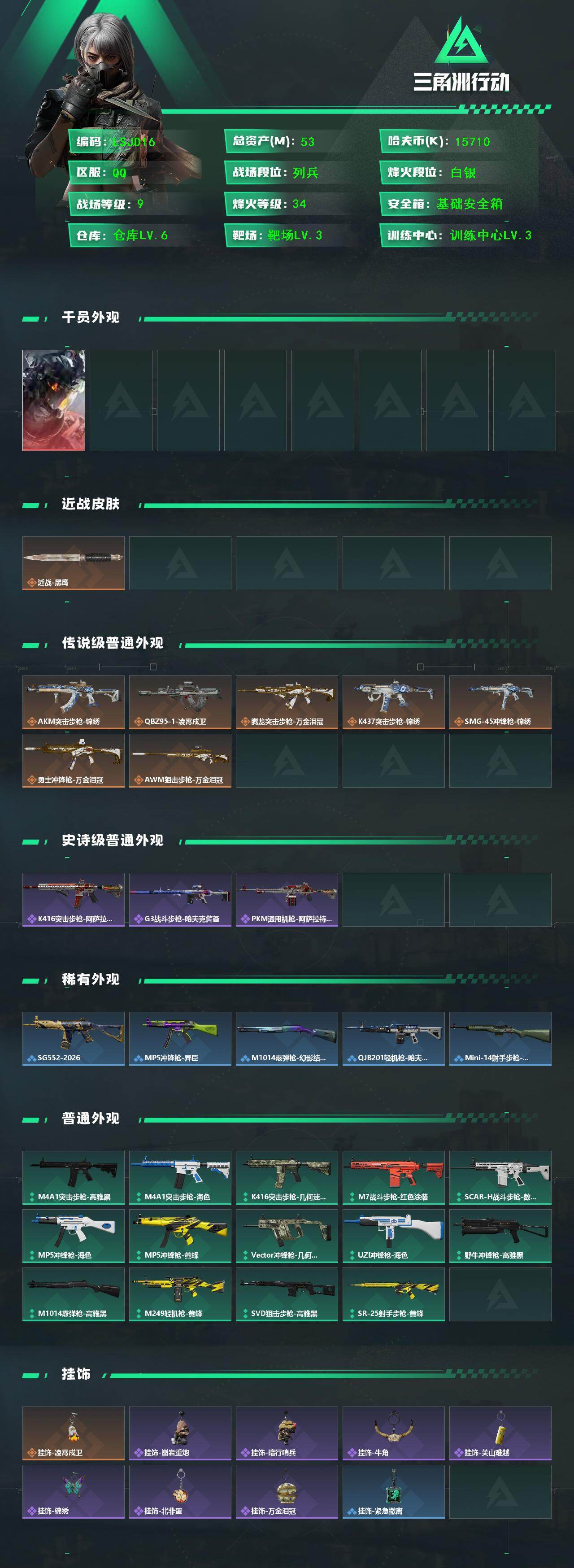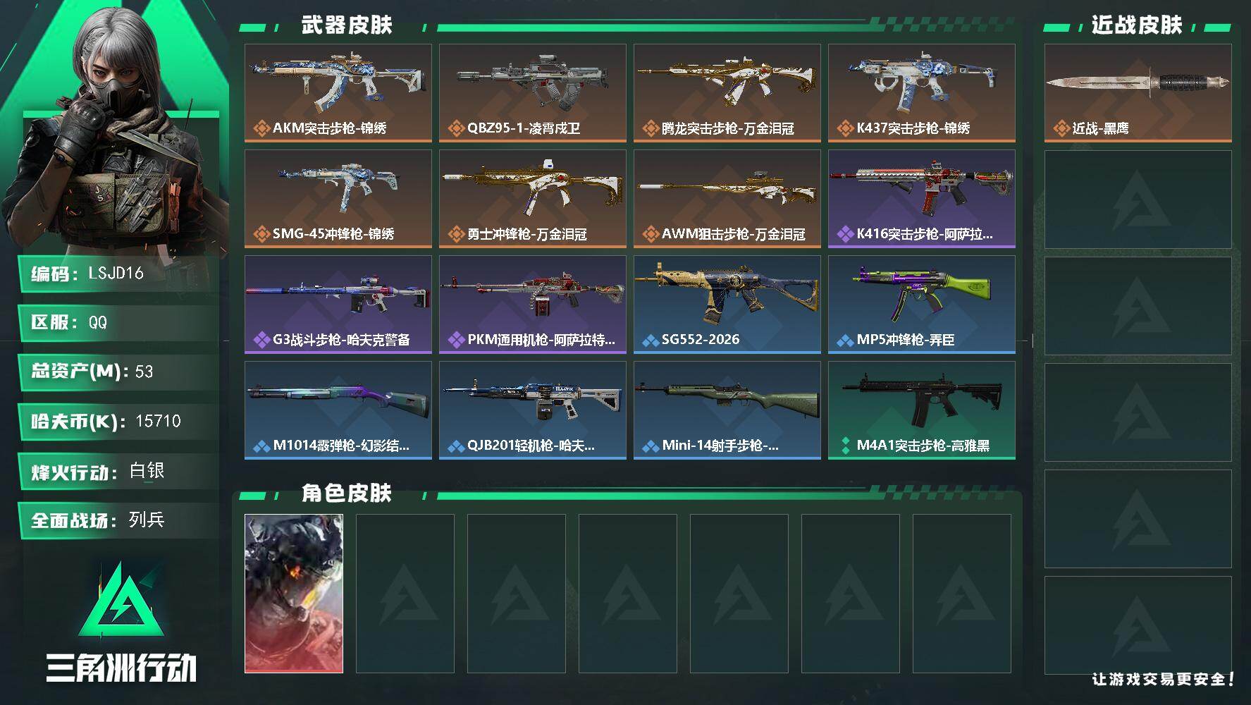 [17206030]【特价出售/店主推荐】53m总资产-15710k哈伏币-34烽火等级-白银-9战场等级-列兵 【干员外观】:威龙-凌霄戍卫 【近战皮肤】:近战-黑鹰 【传说外观】:AKM突击步枪-锦绣,QBZ95-1突击步枪-凌霄戍卫,腾龙突击步枪-万金泪冠,K437突击步枪-锦绣,SMG-45冲锋枪-锦绣,勇士冲锋枪-万金泪冠,AWM狙击步枪-万金泪冠 【史诗外观】:K416突击步枪-阿萨拉特攻,G3战斗步枪-哈夫克警备,PKM通用机枪-阿萨拉特攻 【稀有外观】:SG552突击步枪-2026,MP5冲锋枪-弄臣,M1014霰弹枪-幻影结构,QJB201轻机枪-哈夫克卫队,Mini-14射手步枪-荣耀列队 【普通外观】:M4A1突击步枪-高雅黑,M4A1突击步枪-海色,QBZ95-1突击步枪-2026,K416突击步枪-几何迷彩,M7战斗步枪-红色涂装,SCAR-H战斗步枪-数码迷彩,MP5冲锋枪-海色,MP5冲锋枪-黄蜂,Vector冲锋枪-几何迷彩,UZI冲锋枪-海色,野牛冲锋枪-高雅黑,M1014霰弹枪-高雅黑,M249轻机枪-黄蜂,SVD狙击步枪-高雅黑,SR-25射手步枪-黄蜂,G17-2026 【挂饰】:挂饰-凌霄戍卫,挂饰-崩岩重炮*4,挂饰-暗行哨兵,挂饰-牛角,挂饰-关山难越,挂饰-锦绣,挂饰-北非蛋,挂饰-万金泪冠,挂饰-紧急撤离*15