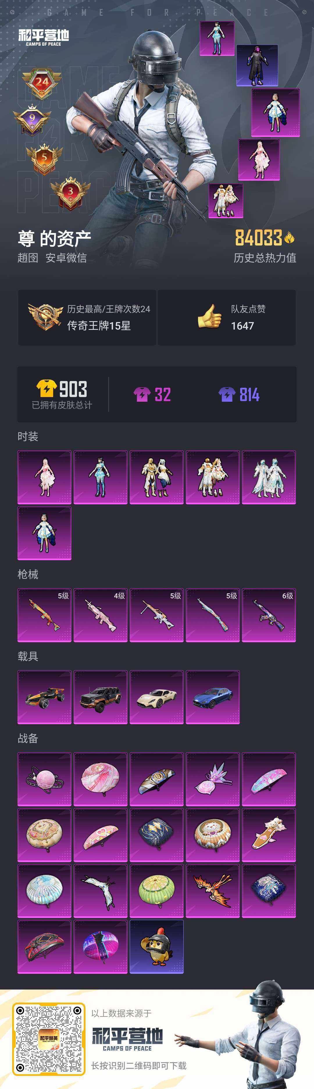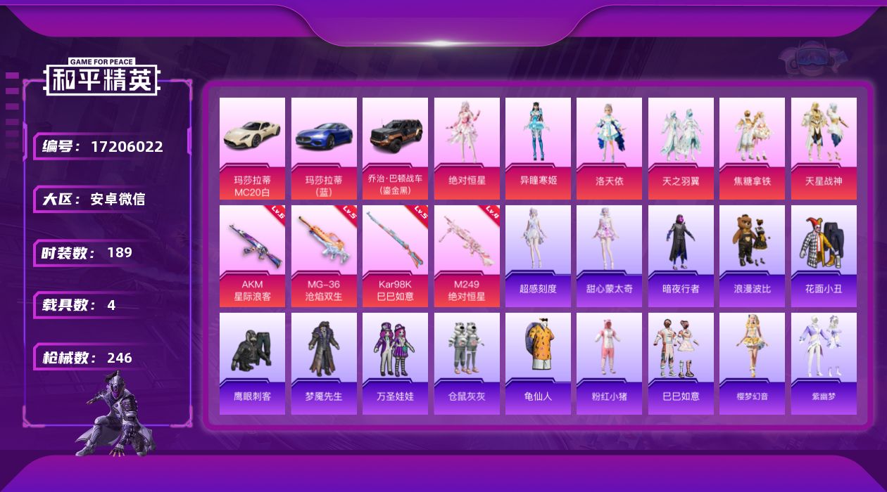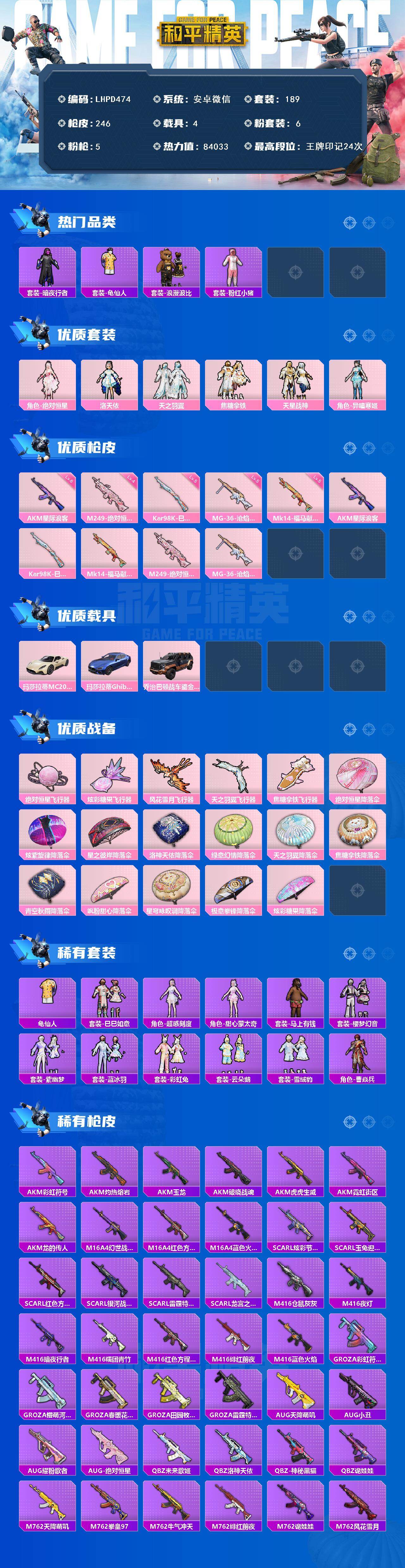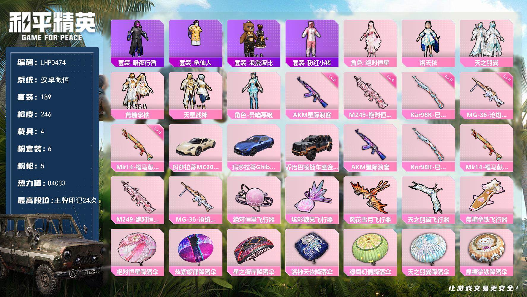 [17206022]【店主推荐捡漏号!可直接换绑】安卓 微信-6粉装-5特效枪-4载具-5粉色飞行器-84033热力值-24王牌印记-189套装-246枪皮【热门品类】:套装-暗夜行者,套装-龟仙人,套装-浪漫波比,套装-粉红小猪【粉色套装】:角色-绝对恒星,角色-洛天依,粉装-天之羽翼,粉装-焦糖拿铁,粉装-天星战神,角色-异瞳寒姬【粉色枪皮等级】:AKM-星际浪客(六级),Kar98K-巳巳如意(五级),Mk14-福马献瑞(五级),M249-绝对恒星(四级),MG-36-沧焰双生(五级)【粉色载具】:玛莎拉蒂MC20(星石白),玛莎拉蒂Ghibli(蓝),乔治巴顿战车(鎏金黑)【粉色枪皮】:AKM-星际浪客,Kar98K-巳巳如意,Mk14-福马献瑞,M249-绝对恒星,MG-36-沧焰双生【粉色飞行器】:绝对恒星飞行器,炫彩糖果飞行器,风花雪月飞行器,天之羽翼飞行器,焦糖拿铁飞行器