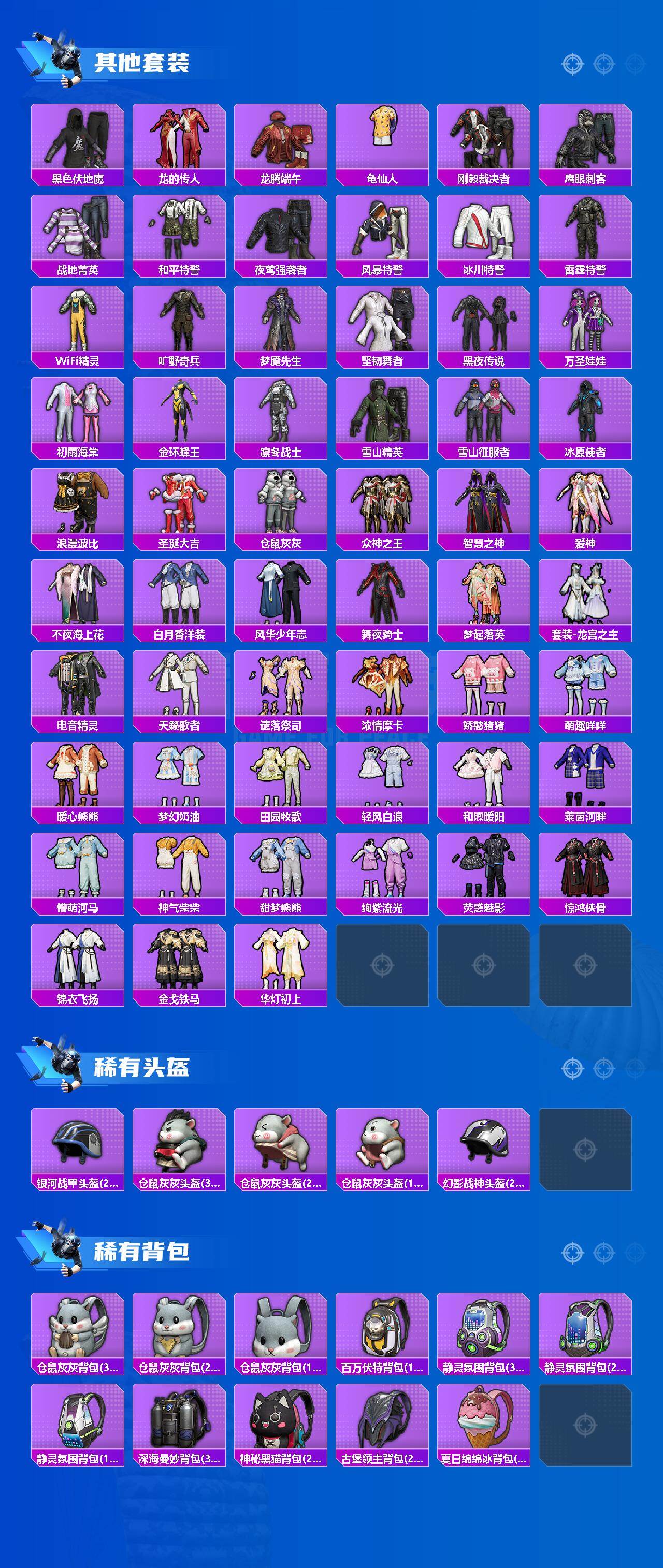 套装-暗夜行者,套装-浪漫波比,角色-洛天依,套装-天之羽翼,焦糖拿铁套装,套装-天星战神,套装-花面小丑,套装-鹰眼刺客,套装-梦魇先生,套装-万圣娃娃,套装-仓鼠灰灰