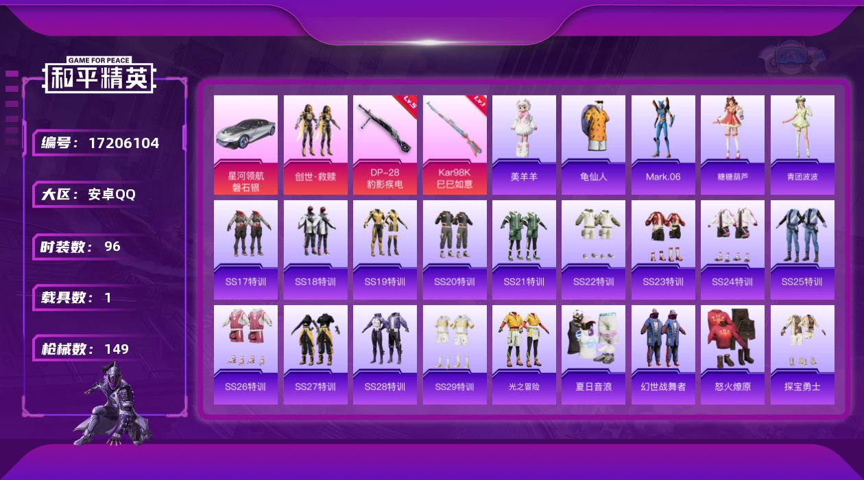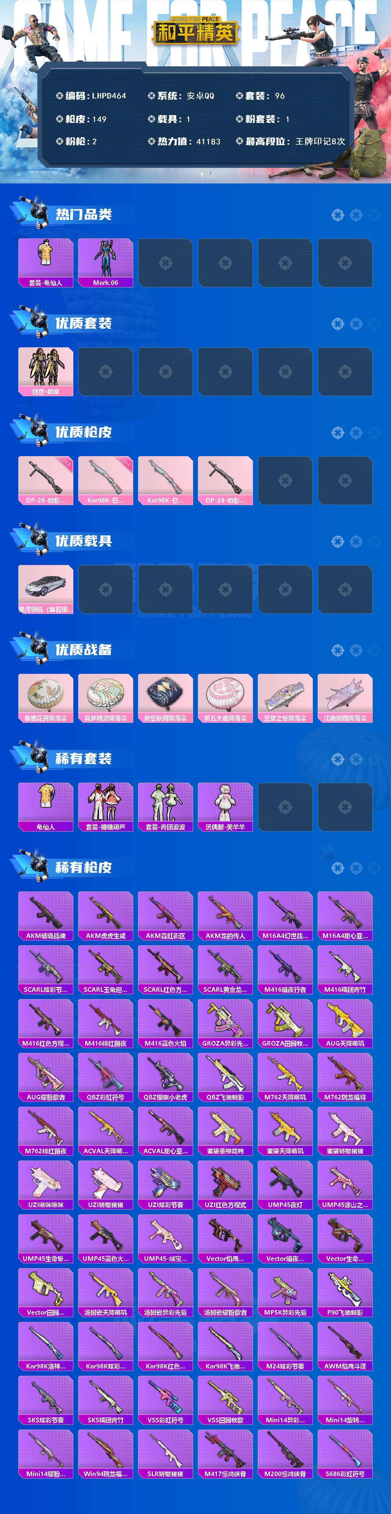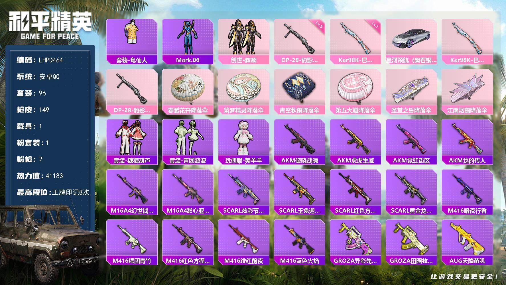 [17206104]【特价出售/店主推荐】安卓 手Q-1粉装-2特效枪-1载具-1粉色飞行器-41183热力值-8王牌印记-96套装-149枪皮 【热门品类】:套装-龟仙人,角色-Mark.06 【粉色套装】:套装-创世·救赎 【粉色枪皮等级】:Kar98K-巳巳如意(一级),DP-28-豹影疾电(五级) 【粉色载具】:星河领航(磐石银) 【粉色枪皮】:Kar98K-巳巳如意,DP-28-豹影疾电 【粉色降落伞】:春暖花开降落伞,筑梦精灵降落伞,青空秋雨降落伞,第五大道降落伞,圣堂之誓降落伞,江南烟雨降落伞 【稀有套装】:套装-龟仙人,套装-糖糖葫芦,套装-青团波波,玩偶服-美羊羊 【稀有枪皮】:AKM-破晓战魂,AKM-虎虎生威,AKM-霓虹街区,AKM-龙的传人,M16A4-幻世战舞者,M16A4-甜心亚梦,SCAR-L-炫彩节奏,SCAR-L-玉兔迎春,SCAR-L-红色方程式,SCAR-L-黄金龙骨,M416-暗夜行者,M416-糯团青竹,M416-红色方程式,M416-绯红前夜,M416-蓝色火焰,GROZA-异彩先驱,GROZA-田园牧歌,AUG-天降萌叽,AUG-耀粉歌者,QBZ-彩虹符号,QBZ-银碳小老虎,QBZ-飞驰魅影,M762-天降萌叽,M762-瑞龙福将,M762-绯红前夜,AC-VAL-天降萌叽,AC-VAL-甜心亚梦,蜜獾-垂柳戏鸭,蜜獾-天降萌叽,蜜獾-娇憨猪猪,UZI-啾咪啾咪,UZI-娇憨猪猪,UZI-炫彩节奏,UZI-红色方程式,UMP45-夜灯,UMP45-涂山之恋,UMP45-生命誓言,UMP45-蓝色火焰,UMP45-绒宝小鹅,Vector-焰鹰斗篷,Vector-暗夜玫瑰,Vector-生命誓言,Vector-田园牧歌,汤姆逊-天降萌叽,汤姆逊-异彩先驱,汤姆逊-耀粉歌者,MP5K-异彩先驱,P90-飞驰魅影,Kar98K-洛神天依,Kar98K-炫彩节奏,Kar98K-红色方程式,Kar98K-飞驰魅影,M24-炫彩节奏,AWM-焰鹰斗篷,SKS-炫彩节奏,SKS-糯团青竹,VSS-彩虹符号,VSS-田园牧歌,Mini14-异彩先驱,Mini14-旋转彩虹,Mini14-耀粉歌者,Win94-瑞龙福将,SLR-娇憨猪猪,M417-惊鸿侠骨,M200-惊鸿侠骨,S686-彩虹符号,S686-红色方程式,S1897-炫彩节奏,S1897-碧