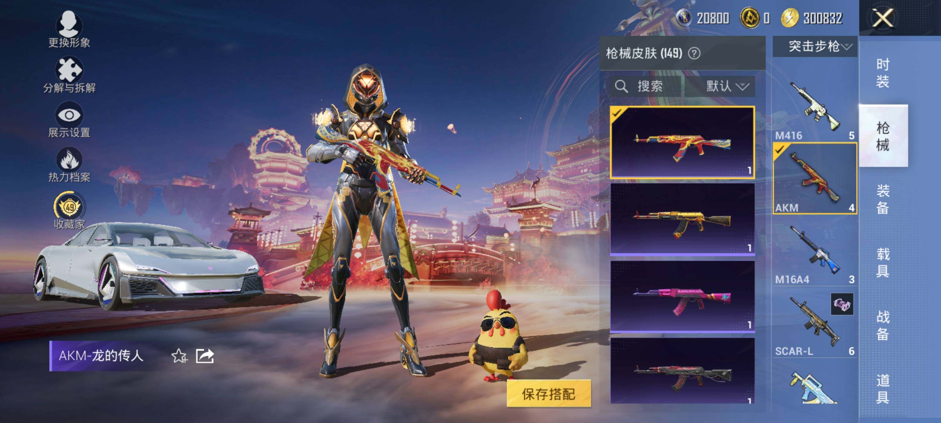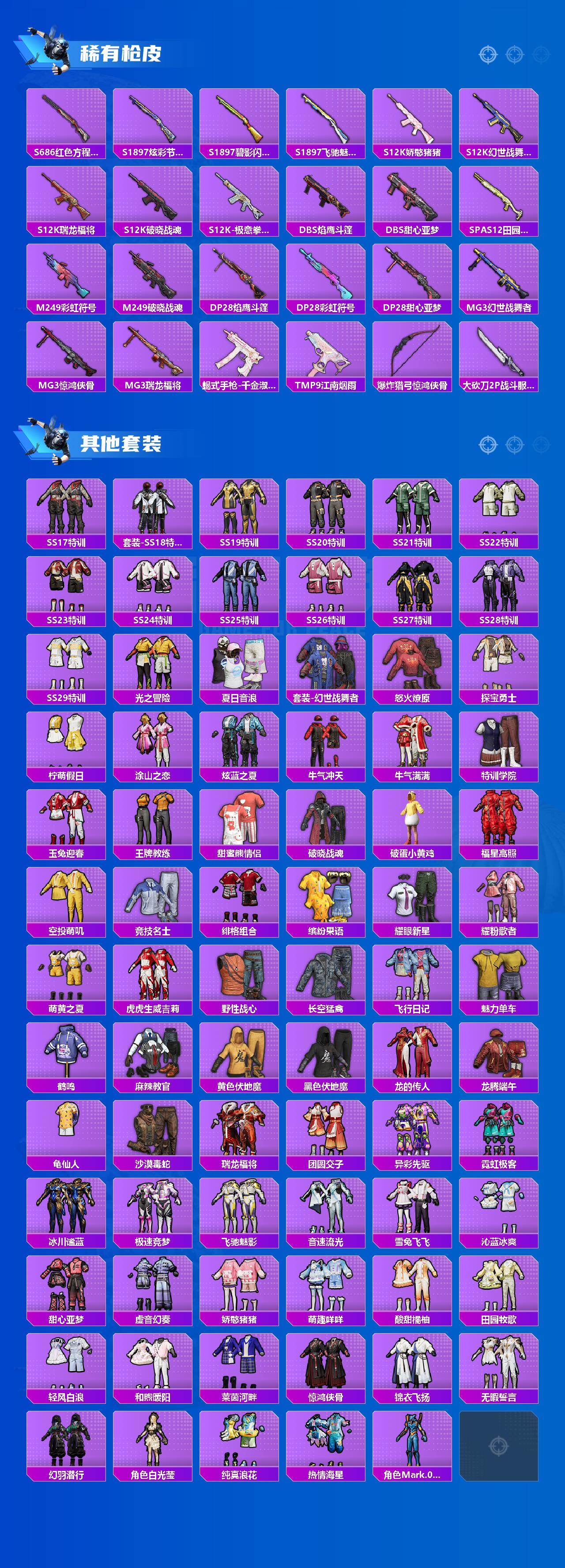 【稀有枪皮】:AKM-破晓战魂,AKM-虎虎生威,AKM-霓虹街区,AKM-龙的传人,M16A4-幻世战舞者,M16A4-甜心亚梦,SCAR-L-炫彩节奏,SCAR-L-玉兔迎春,SCAR-L-红色方程式,SCAR-L-黄金龙骨,M416-暗夜行者,M416-糯团青竹,M416-红色方程式,M416-绯红前夜,M416-蓝色火焰,GROZA-异彩先驱,GROZA-田园牧歌,AUG-天降萌叽,AUG-耀粉歌者,QBZ-彩虹符号,QBZ-银碳小老虎,QBZ-飞驰魅影,M762-天降萌叽,M762-瑞龙福将,M762-绯红前夜,AC-VAL-天降萌叽,AC-VAL-甜心亚梦,蜜獾-垂柳戏鸭,蜜獾-天降萌叽,蜜獾-娇憨猪猪,UZI-啾咪啾咪,UZI-娇憨猪猪,UZI-炫彩节奏,UZI-红色方程式,UMP45-夜灯,UMP45-涂山之恋,UMP45-生命誓言,UMP45-蓝色火焰,UMP45-绒宝小鹅,Vector-焰鹰斗篷,Vector-暗夜玫瑰,Vector-生命誓言,Vector-田园牧歌,汤姆逊-天降萌叽,汤姆逊-异彩先驱,汤姆逊-耀粉歌者,MP5K-异彩先驱,P90-飞驰魅影,Kar98K-洛神天依,Kar98K-炫彩节奏,Kar98K-红色方程式,Kar98K-飞驰魅影,M24-炫彩节奏,AWM-焰鹰斗篷,SKS-炫彩节奏,SKS-糯团青竹,VSS-彩虹符号,VSS-田园牧歌,Mini14-异彩先驱,Mini14-旋转彩虹,Mini14-耀粉歌者,Win94-瑞龙福将,SLR-娇憨猪猪,M417-惊鸿侠骨,M200-惊鸿侠骨,S686-彩虹符号,S686-红色方程式,S1897-炫彩节奏,S1897-碧