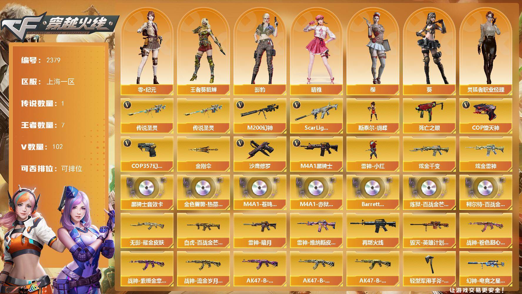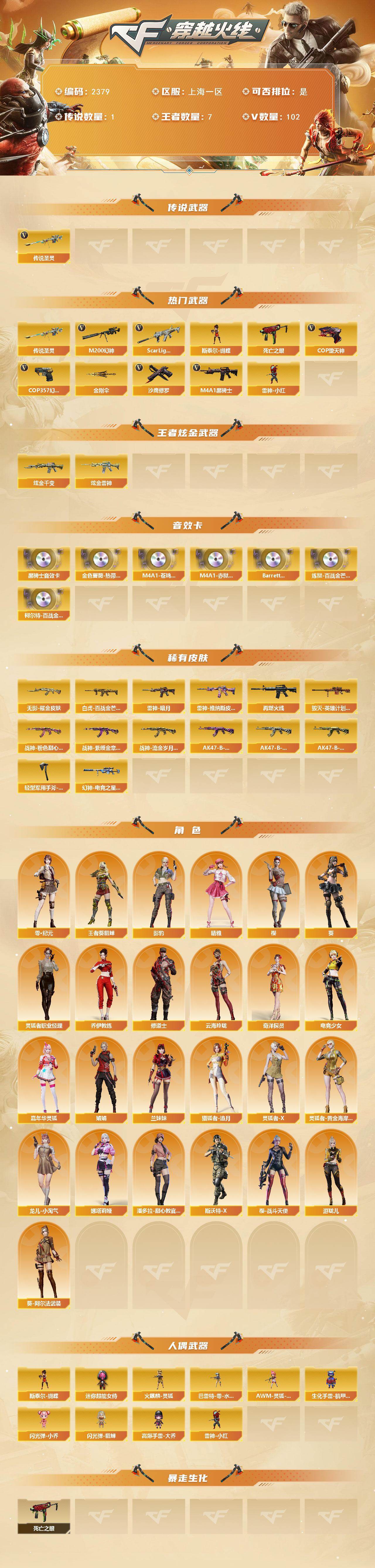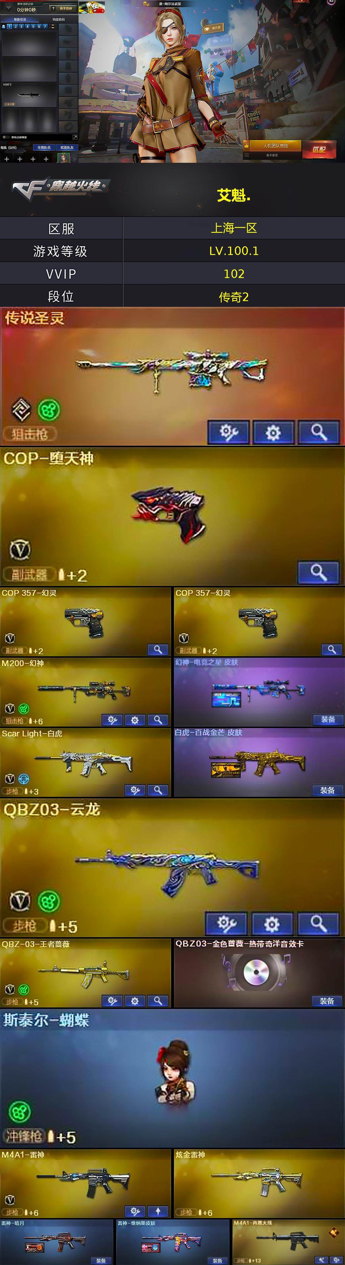 [17206123]上海一区-108V-7王者武器数-2炫金武器数 【传说武器】:传说圣灵 【热门武器】:传说圣灵,Scar Light-白虎,M200-幻神,死亡之眼,M4A1-黑骑士,斯泰尔-蝴蝶,雷神-小红,COP-堕天神,COP 357-幻灵*2,沙鹰-修罗,金刚伞*2 【王者炫金武器】:炫金千变,炫金雷神 【音效卡】:QBZ03-金色蔷薇-热带奇洋音效卡,M4A1-黑骑士音效卡,M4A1-苍鸣雷神音效卡,M4A1-赤狱骑士-怀旧音效卡,Barrett-碧霄极光音效卡,炼狱-百战金芒-庆典舞曲音效卡,柯尔特-百战金芒-庆典舞曲音效卡 【皮肤】:幻神-电竞之星 皮肤,白虎-百战金芒 皮肤,雷神-暗月,雷神-维纳斯皮肤,M4A1-再燃火线,毁灭-英雄计划 皮肤,无影耀金皮肤,战神-粉色甜心皮肤,战神-紫绶金章皮肤,战神-流金岁月皮肤*2,AK47-B-常胜将军-曹操,AK47-B-常胜将军-刘备,AK47-B-常胜将军-孙权*2,轻型军用手斧-再燃火线 【角色】:葵,樱,影豹,晴雅,零·纪元,王者-葵-貂蝉,奇洋探员,乔伊教练,修道士,云海玲珑,葵-阿尔法武装,电竞少女,嘉年华灵狐,娟娟,兰妹妹,猎狐者-追月,灵狐者-X,灵狐者-黄金海岸,灵狐者-职业经理,龙儿-小淘气,娜塔莉娅,潘多拉-甜心教官,斯沃特-X,樱-战斗天使,游珑儿 【人偶武器】:雷神-小红,火麒麟-灵狐,斯泰尔-蝴蝶,巴雷特-零-水下丽影,AWM-灵狐-15周年嘉年华,生化手雷-机甲核心,闪光弹-小乔,闪光弹-貂蝉,高爆手雷-大乔,迷你超能女侍 【暴走生化】:死亡之眼 【挑战大师】:暴君乱世-超越Max,冰龙粉碎者-白马银枪,机甲撕裂者III,神圣爆裂者-末日III 【英雄级武器】:AK47-火麒麟,M4A1-雷神,M4A1-黑骑士,AK47-无影,M4A1-死神,AN94-超新星,M4A1-堕天神,Scar Light-白虎,M4A1-幻灵,QBZ03-云龙,黑武士-锦绣游龙,超新星-热带奇洋,AK-47-猩红传说*2,王者火魄-觉醒版,AK47-B-常胜将军,QBZ-03-王者蔷薇-觉醒版,AWM-天龙,Barrett-毁灭,M200-幻神,Barrett-朱雀,炼狱-百战金芒,沙鹰-修罗,沙鹰-天神,COP-堕天神,COP 357-幻灵*2,王者之灵-觉醒版,屠龙,麒麟刺-堕天神*3,擎天,麒麟刺,幻灵之锋